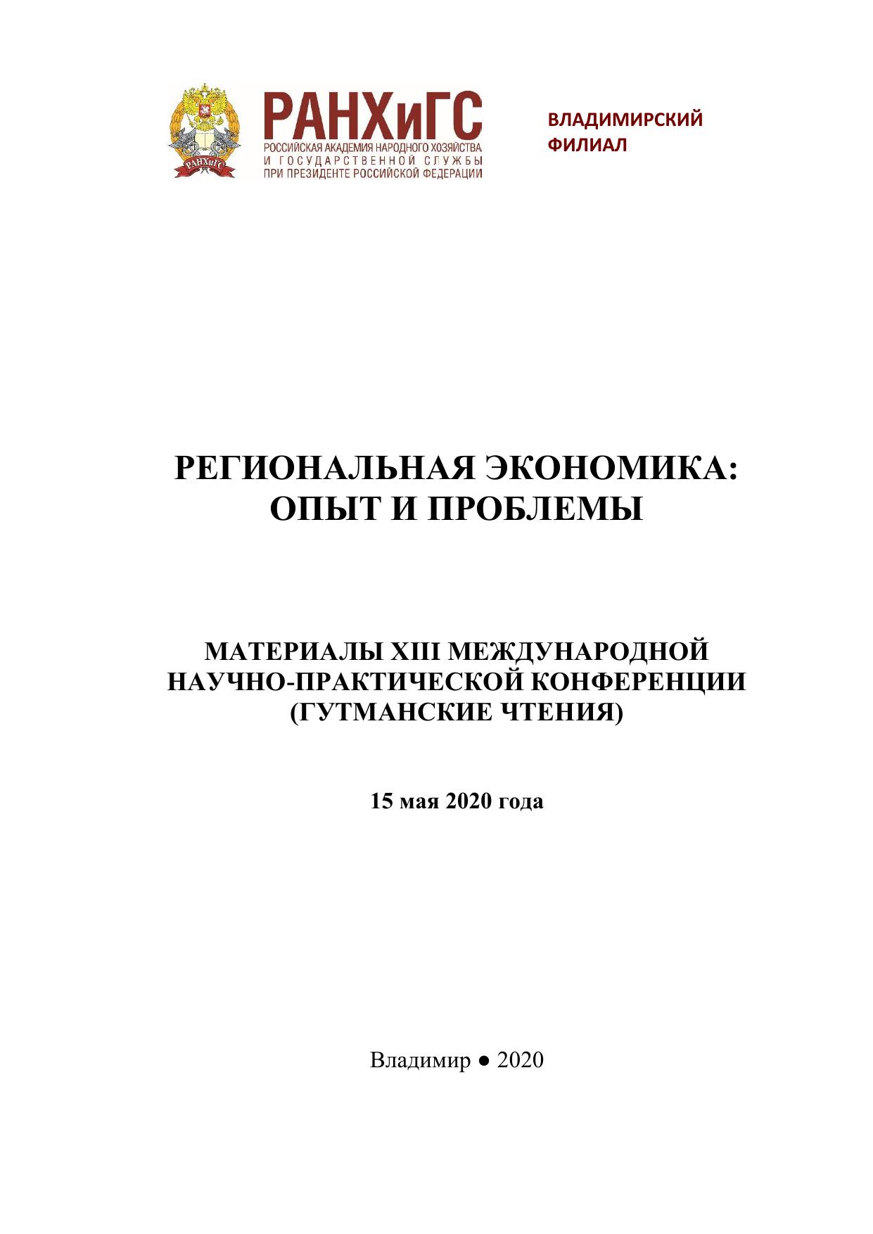 Региональная экономика: опыт и проблемы: материалы XIII Международной научно-практической конференции (Гутманские чтения) 15 мая 2020 года