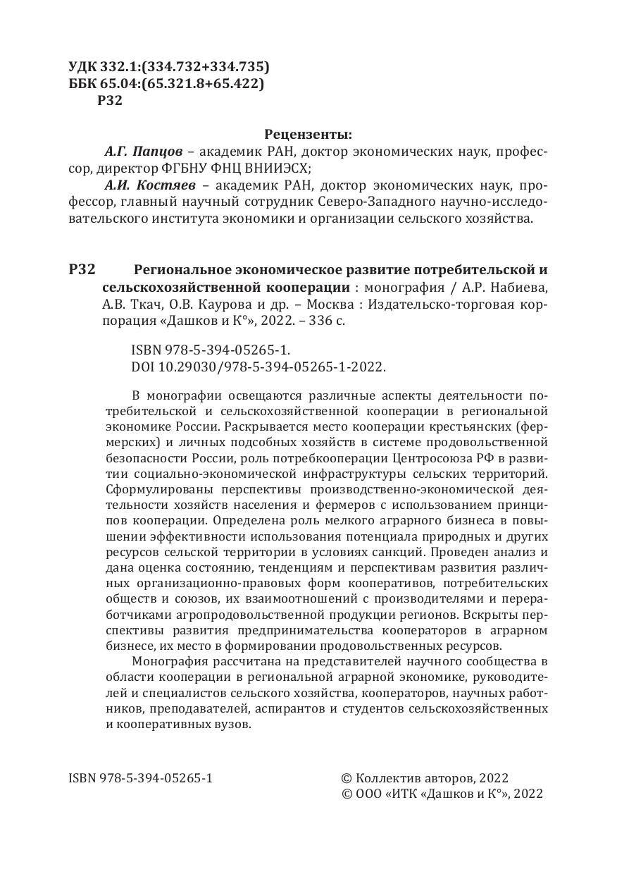 Раскрывается место кооперации крестьянских (фер- мерских) и личных подсобных хозяйств в системе продовольственной безопасности России, роль потребкооперации Центросоюза РФ в развитии социально-экономической инфраструктуры сельских территорий. Сформулированы перспективы производственно-экономической деятельности хозяйств населения и фермеров с использованием принципов кооперации. Определена роль мелкого аграрного бизнеса в повышении эффективности использования потенциала природных и других ресурсов сельской территории в условиях санкций. Проведен анализ и дана оценка состоянию, тенденциям и перспективам развития различных организационно-правовых форм кооперативов, потребительских обществ и союзов, их взаимоотношений с производителями и переработчиками агропродовольственной продукции регионов. Вскрыты перспективы развития предпринимательства кооператоров в аграрном бизнесе, их место в формировании продовольственных ресурсов.