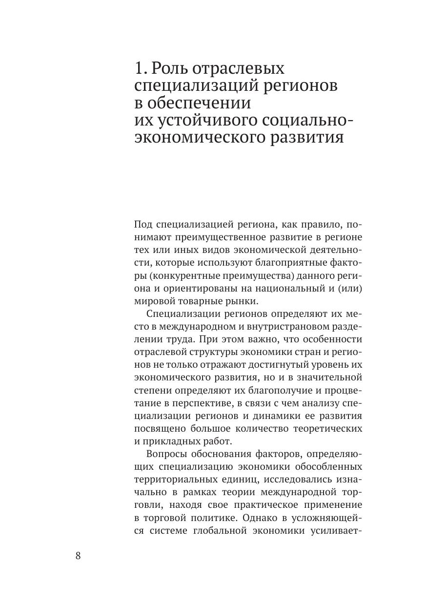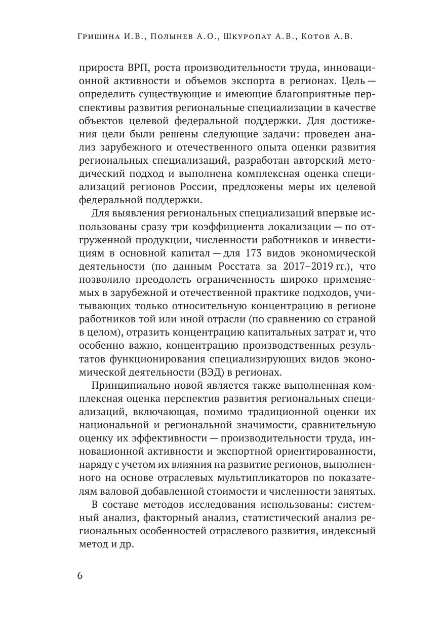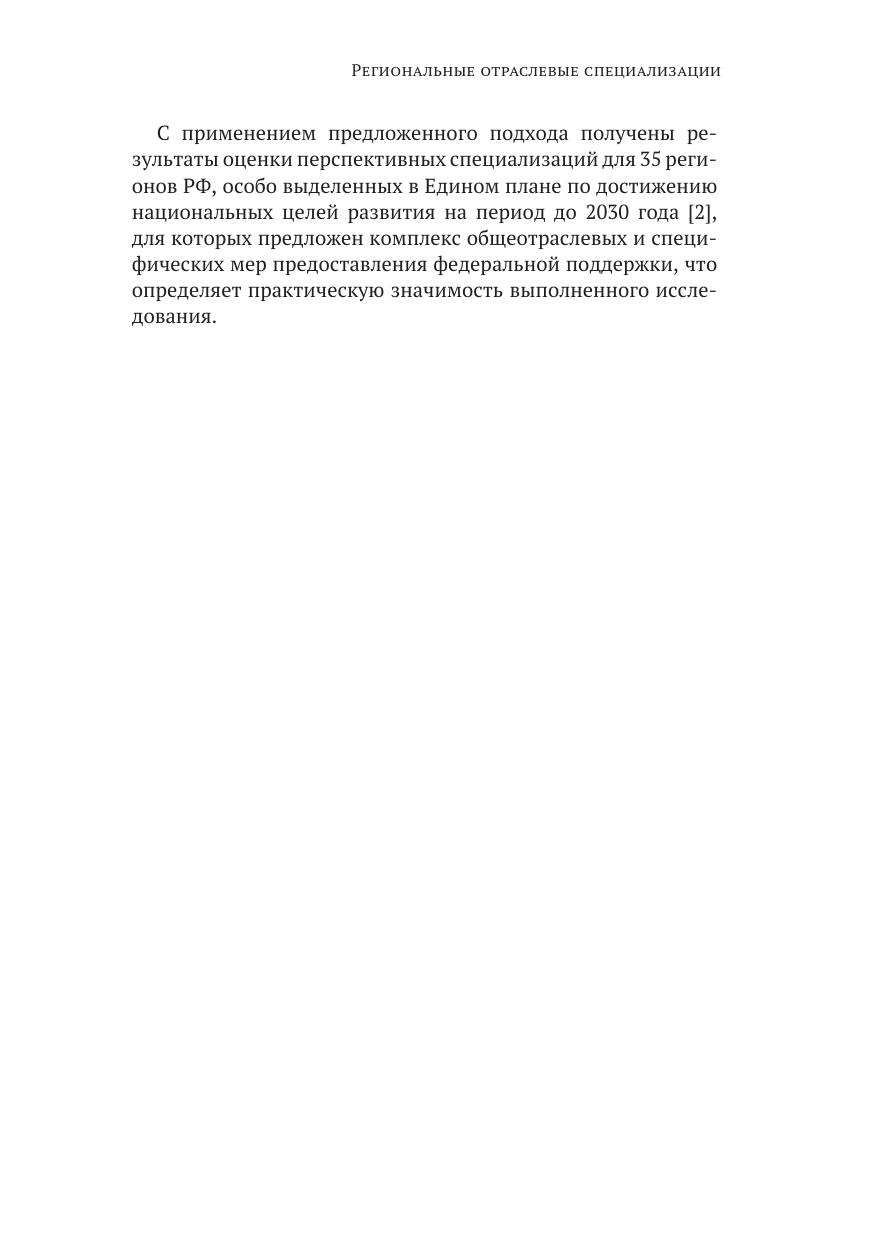 В докладе определены перспективные специализации регионов России, целевая федеральная поддержка которых обеспечит максимальный эффект в части прироста ВРП, роста производительности труда, инновационной активности и объемов экспорта в регионах. Авторы проанализировали зарубежный и отечественный опыт оценки развития региональных специализаций, разработали методический подход и выполнили комплексную оценку специализации регионов России. Ключевые слова: специализация экономики региона, регионы России, вид экономической деятельности, методика анализа, перспективная специализация, национальные цели развития. Коды JEL classification: R11, R12, R13, R58