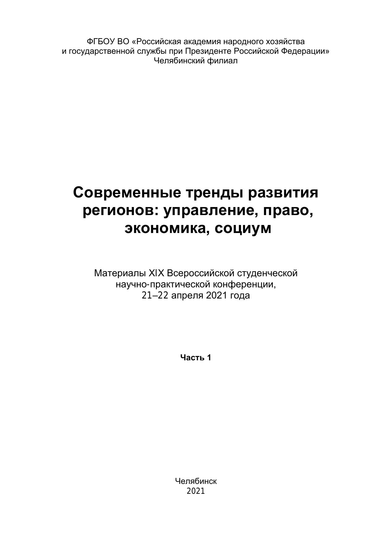 Современные тренды развития регионов: управление, право, экономика, социум: материалы XIX Всерос. студен. науч.-практ. конф., 21-22 апреля 2021 года: в 2 ч.Ч. 1