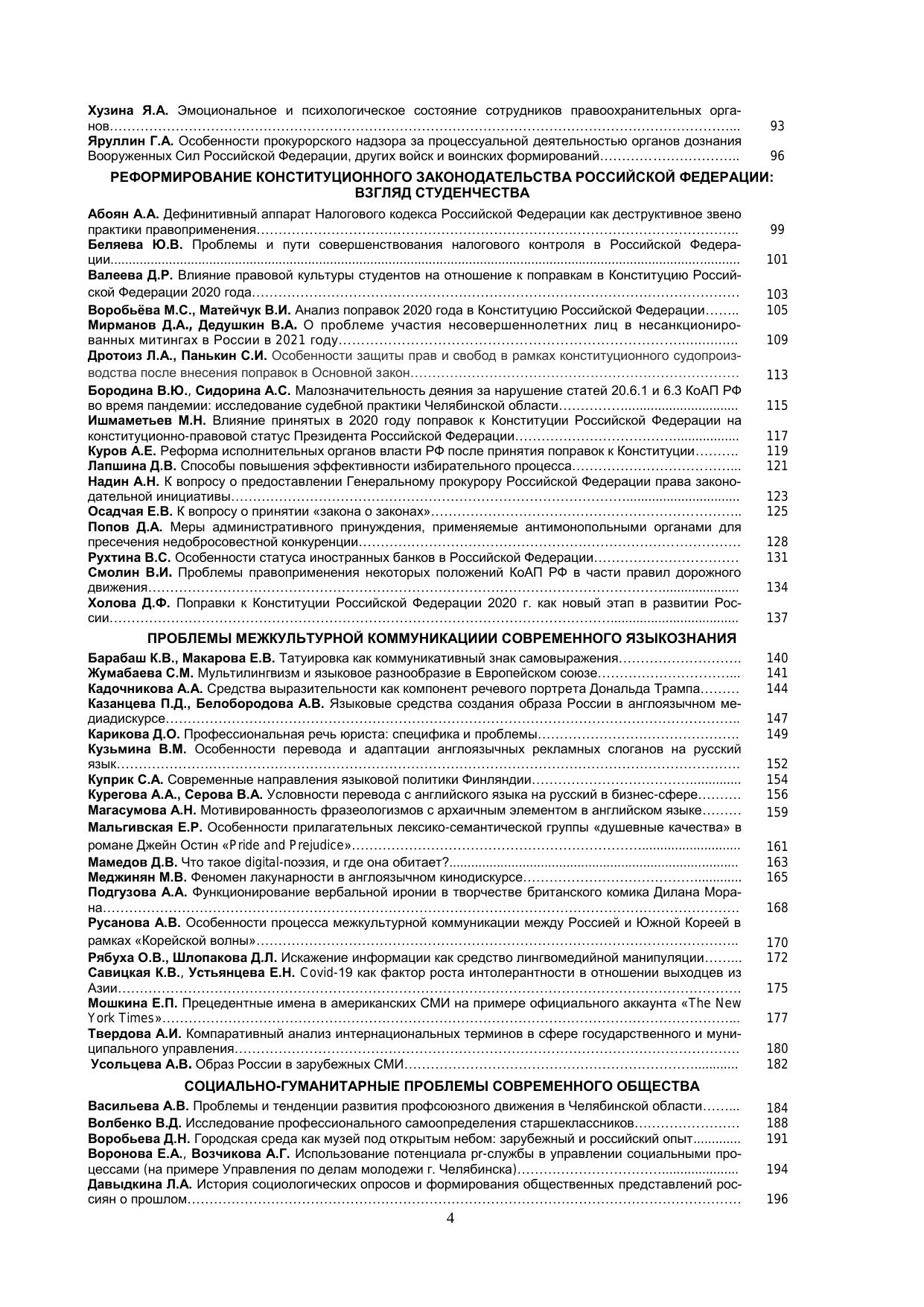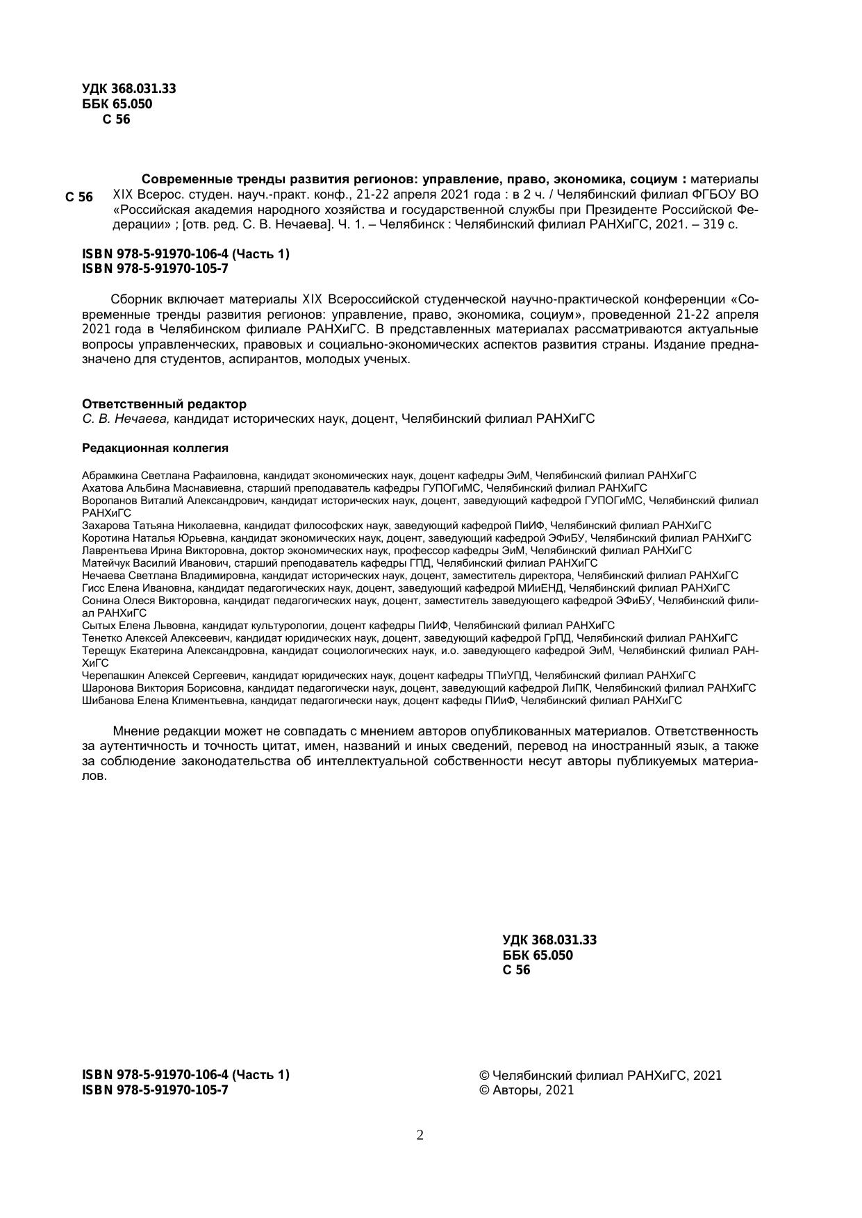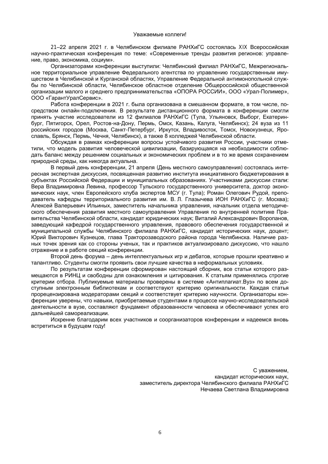 Сборник включает материалы XIX Всероссийской студенческой научно-практической конференции «Со-временные тренды развития регионов: управление, право, экономика, социум», проведенной 21-22 апреля 2021 года в Челябинском филиале РАНХиГС. В представленных материалах рассматриваются актуальные вопросы управленческих, правовых и социально-экономических аспектов развития страны. Издание предна-значено для студентов, аспирантов, молодых ученых.