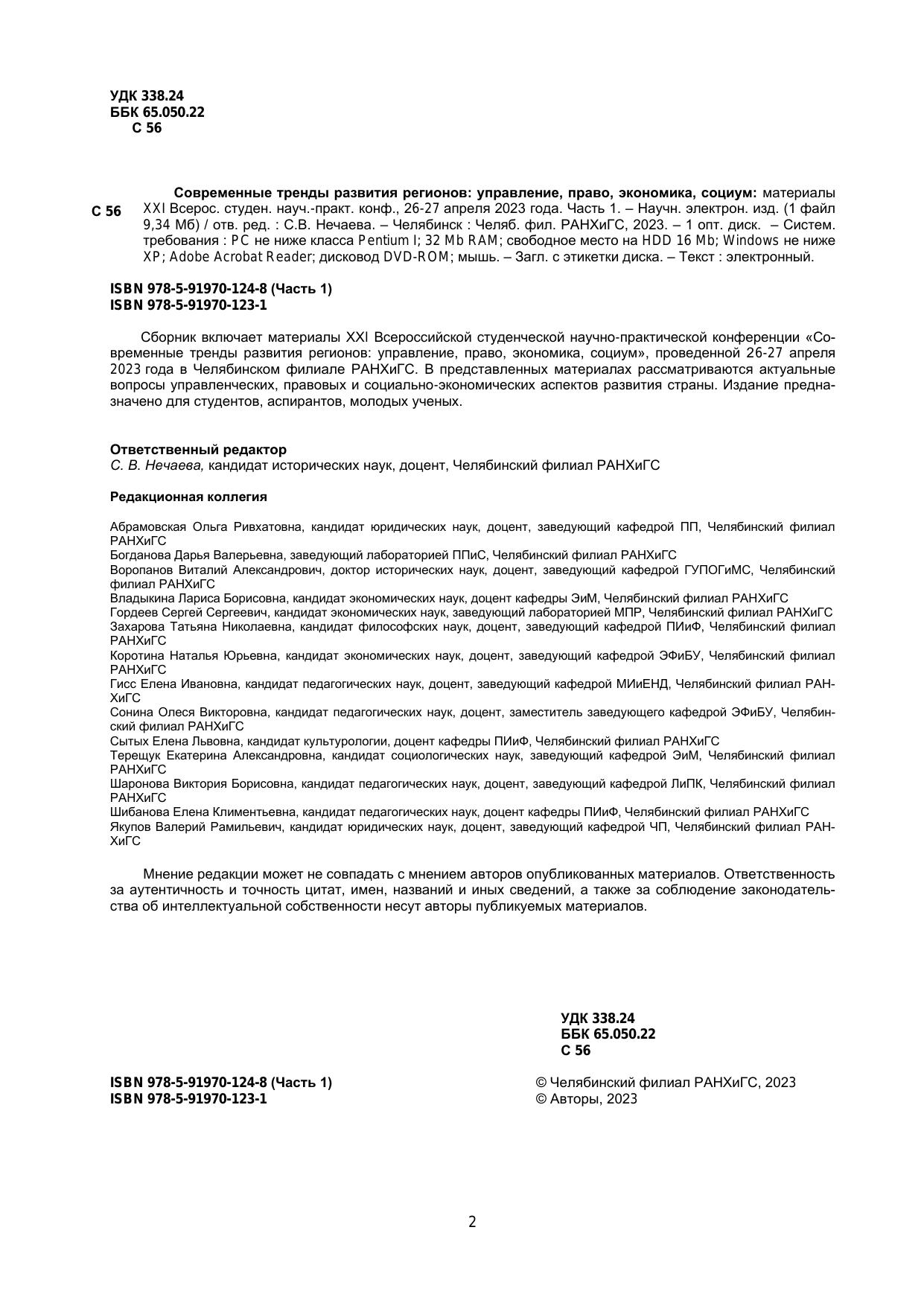 Сборник включает материалы XXI Всероссийской студенческой научно-практической конференции «Со-временные тренды развития регионов: управление, право, экономика, социум», проведенной 26-27 апреля 2023 года в Челябинском филиале РАНХиГС. В представленных материалах рассматриваются актуальные вопросы управленческих, правовых и социально-экономических аспектов развития страны. Издание предна-значено для студентов, аспирантов, молодых ученых.