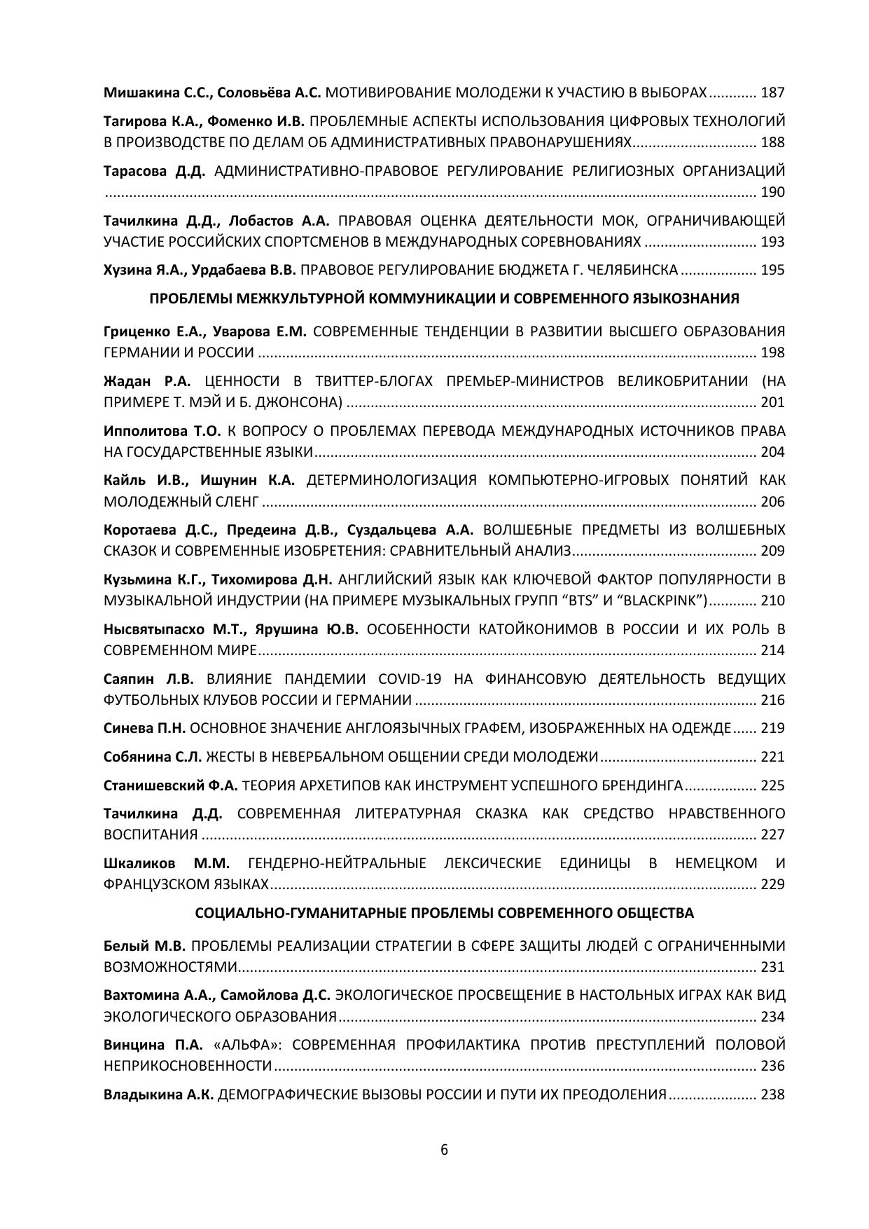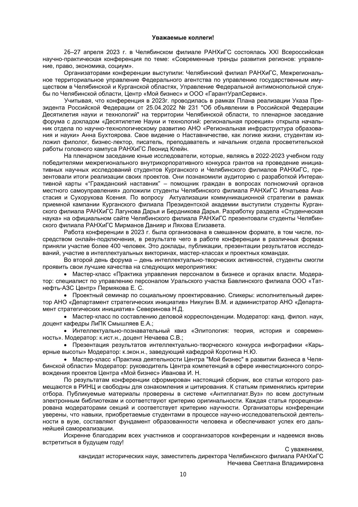Сборник включает материалы XXI Всероссийской студенческой научно-практической конференции «Со-временные тренды развития регионов: управление, право, экономика, социум», проведенной 26-27 апреля 2023 года в Челябинском филиале РАНХиГС. В представленных материалах рассматриваются актуальные вопросы управленческих, правовых и социально-экономических аспектов развития страны. Издание предна-значено для студентов, аспирантов, молодых ученых.