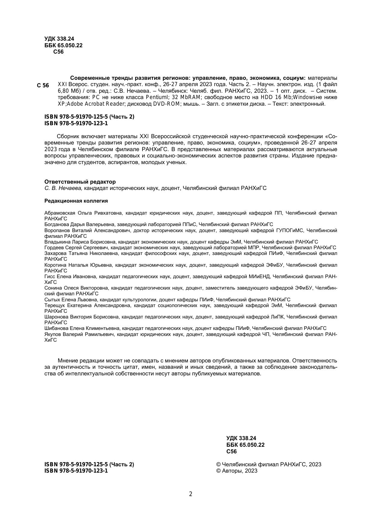 Современные тренды развития регионов: управление, право, экономика, социум: материалы XXI Всерос. студен. науч.-практ. конф., 26-27 апреля 2023 года. Часть 2