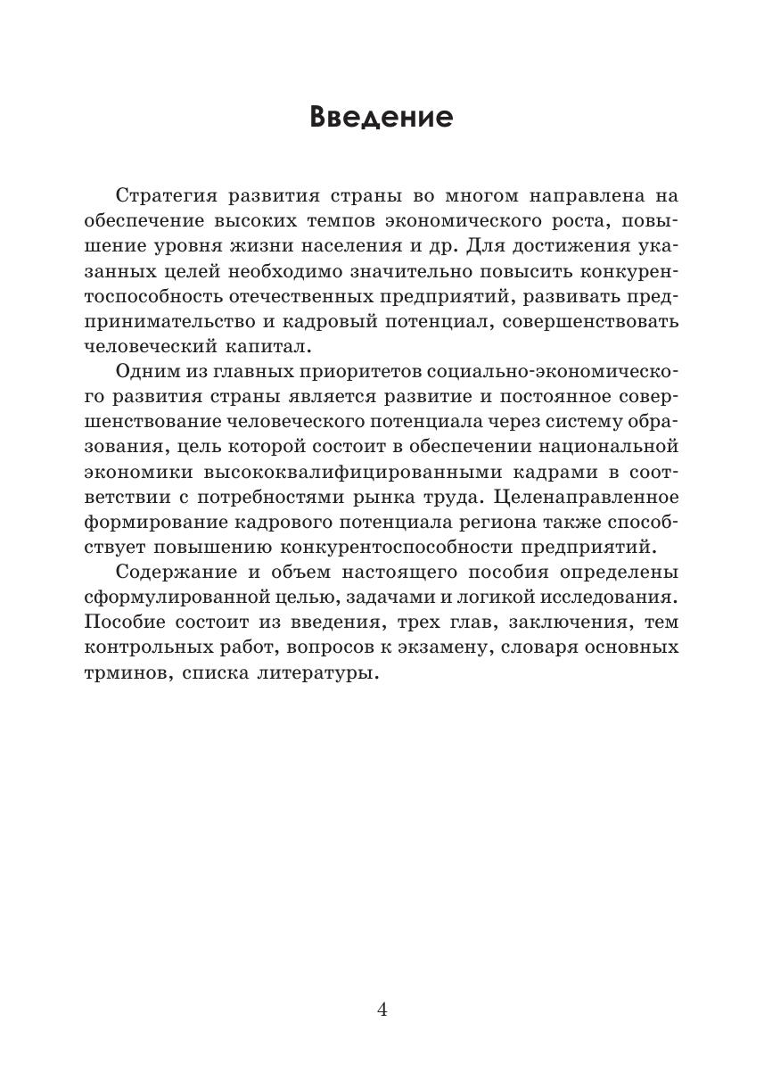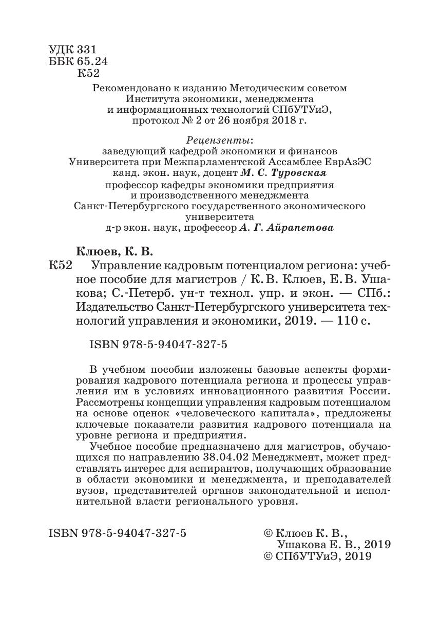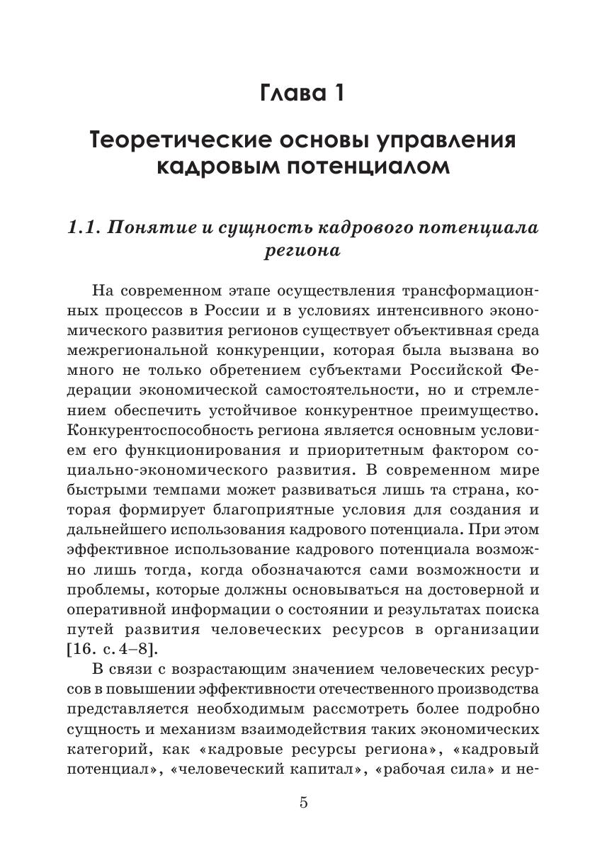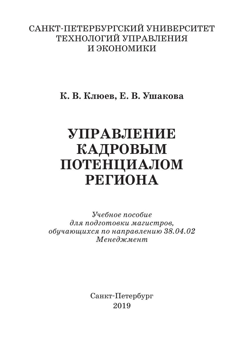 В учебном пособии изложены базовые аспекты формирования кадрового потенциала региона и процессы управления им в условиях инновационного развития России. Рас смотрены концепции управления кадровым потенциалом на основе оценок «человеческого капитала», предложены ключевые показатели развития кадрового потенциала на уровне региона и предприятия. Учебное пособие предназначено для магистров, обучающихся по направлению 38.04.02 Менеджмент, может представлять интерес для аспирантов, получающих образование в области экономики и менеджмента, и преподавателей вузов, представителей органов законодательной и исполнительной власти регионального уровня