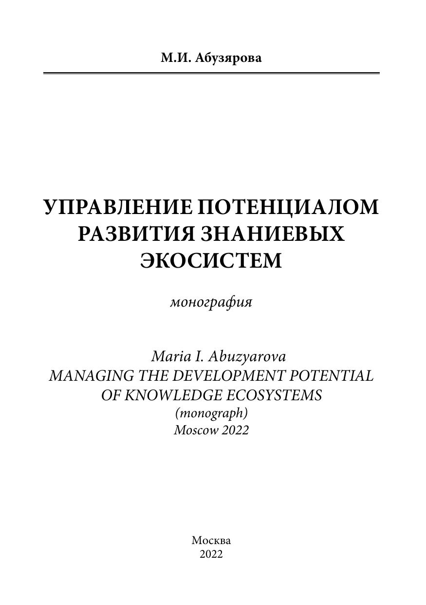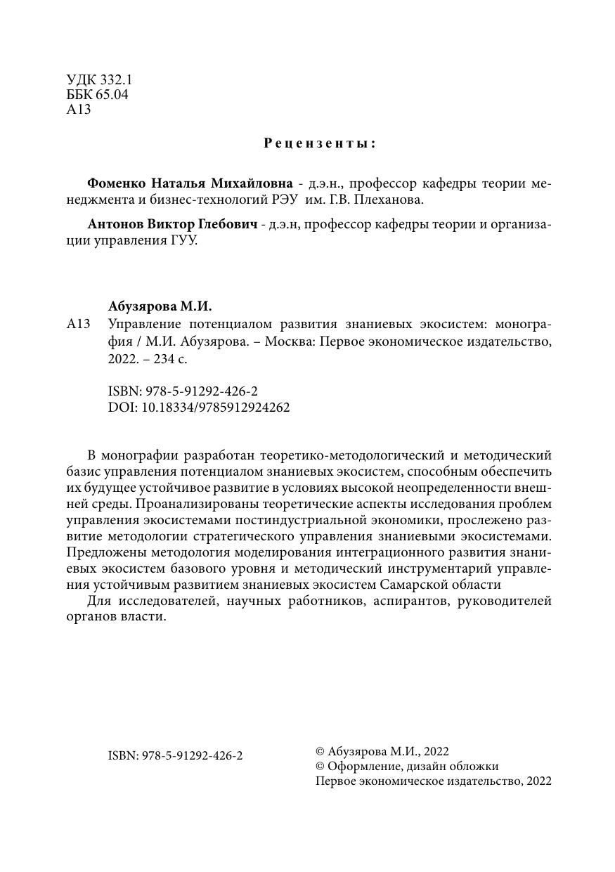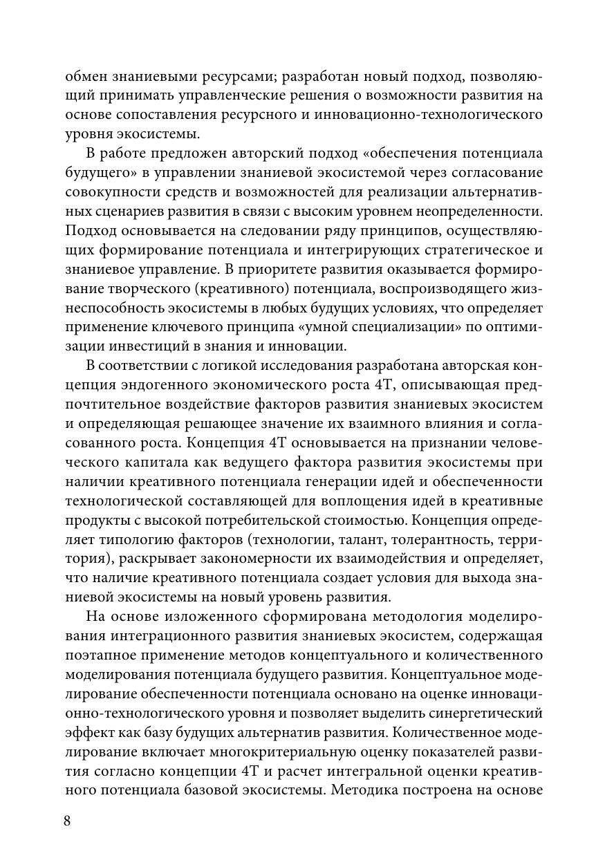 В монографии разработан теоретико-методологический и методический базис управления потенциалом знаниевых экосистем, способным обеспечить их будущее устойчивое развитие в условиях высокой неопределенности внешней среды. Проанализированы теоретические аспекты исследования проблем управления экосистемами постиндустриальной экономики, прослежено развитие методологии стратегического управления знаниевыми экосистемами. Предложены методология моделирования интеграционного развития знаниевых экосистем базового уровня и методический инструментарий управления устойчивым развитием знаниевых экосистем Самарской области.