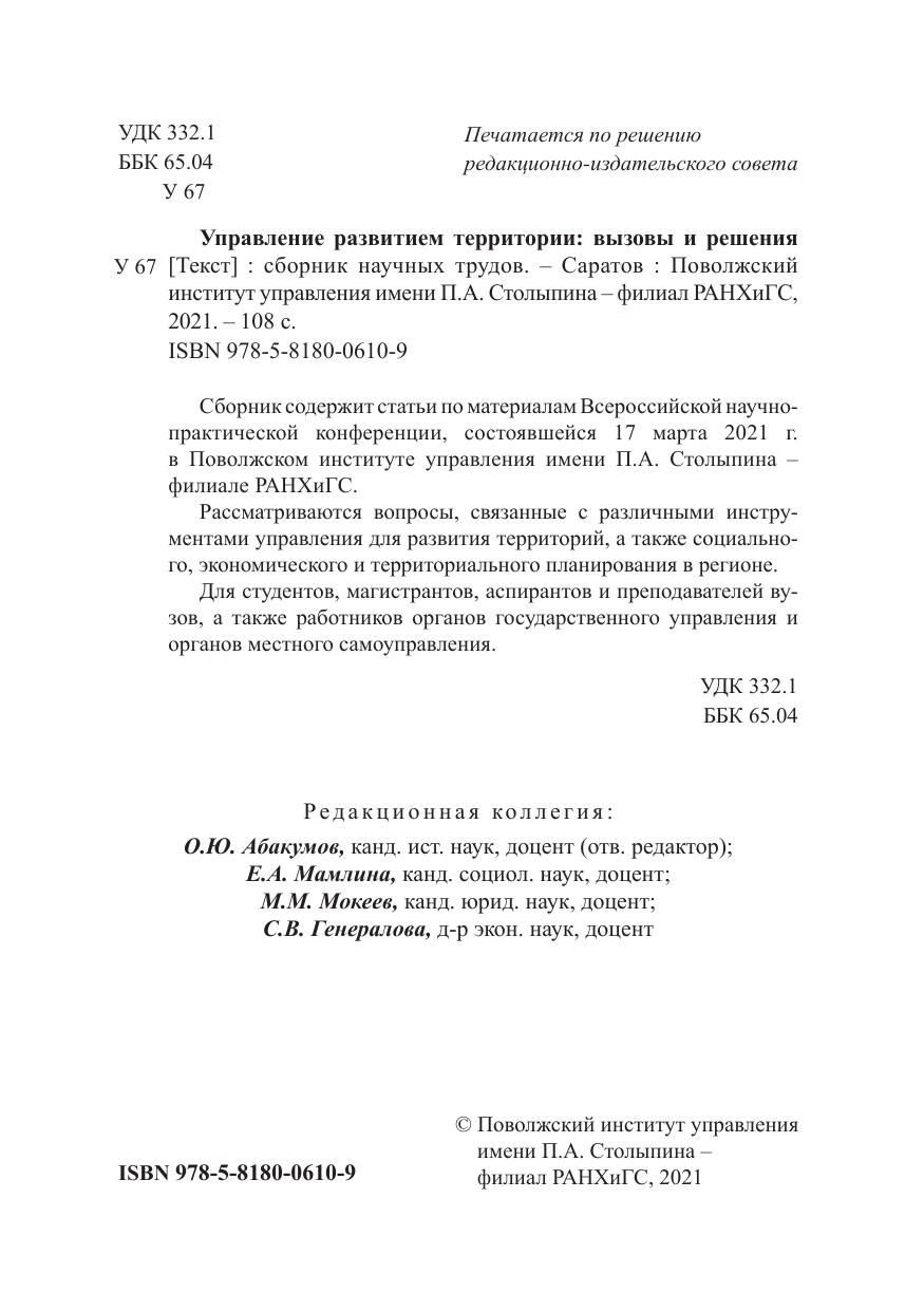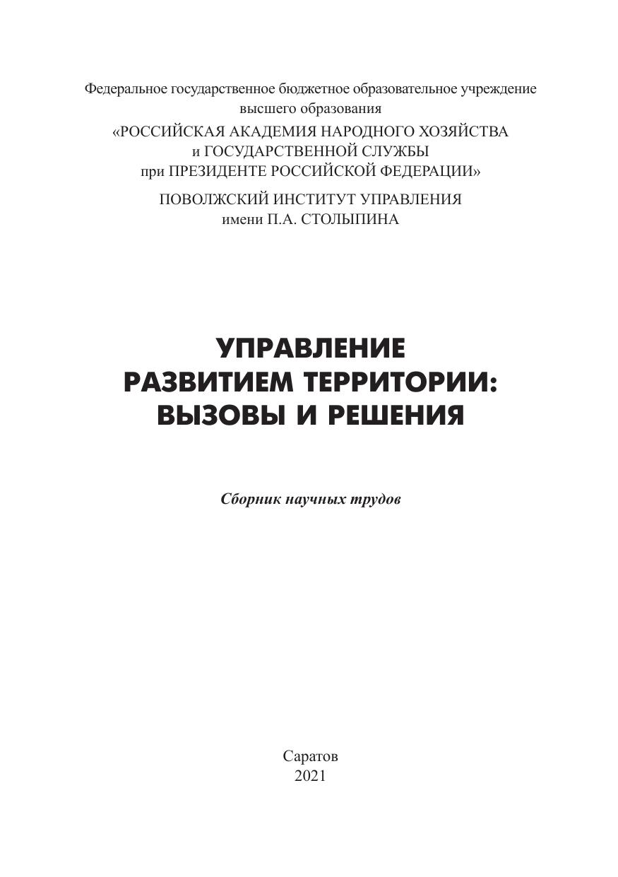 Сборник содержит статьи по материалам Всероссийской научнопрактической конференции, состоявшейся 17 марта 2021 г. в Поволжском институте управления имени П.А. Столыпина – филиале РАНХиГС. Рассматриваются вопросы, связанные с различными инструментами управления для развития территорий, а также социального, экономического и территориального планирования в регионе. Для студентов, магистрантов, аспирантов и преподавателей вузов, а также работников органов государственного управления и органов местного самоуправления.