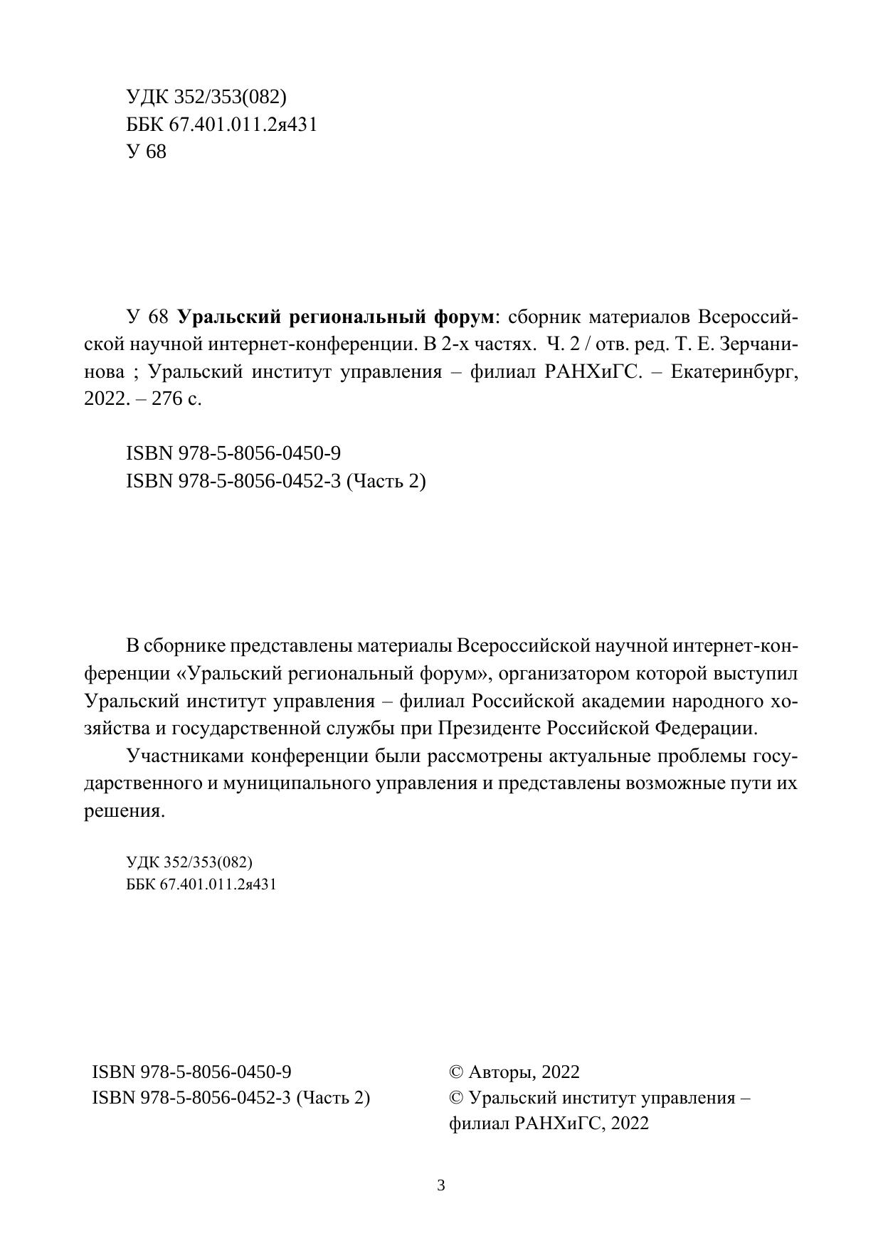В сборнике представлены материалы Всероссийской научной интернет-кон-ференции «Уральский региональный форум», организатором которой выступил Уральский институт управления – филиал Российской академии народного хо-зяйства и государственной службы при Президенте Российской Федерации. Участниками конференции были рассмотрены актуальные проблемы госу-дарственного и муниципального управления и представлены возможные пути их решения.