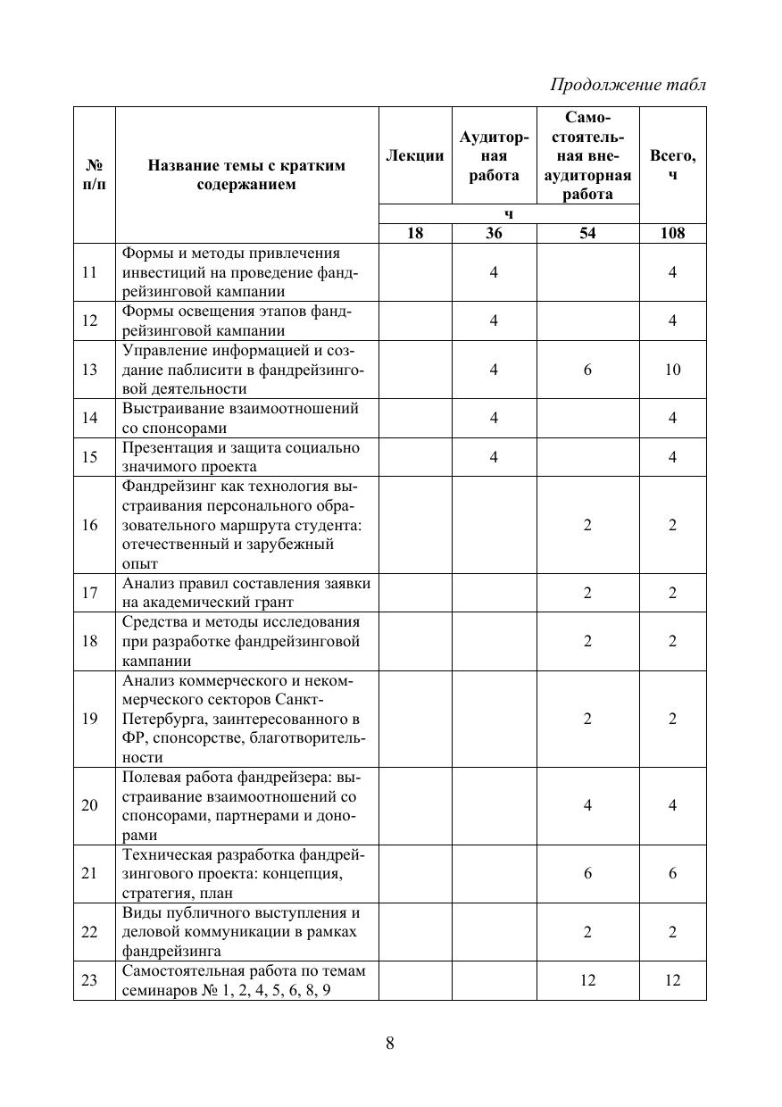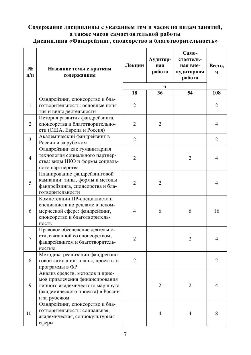 В учебно-методической разработке представлена структура программы дисциплины «Фандрейзинг, спонсорство и благотворительность», некоторые методики проведения интерактивных и практических аудиторных занятий, методика выполнения самостоятельной аудиторной и внеаудиторной работы студентов, методика оценки успеваемости студентов, технологическая карта для самооценки студенческой активности и дополнительная литература по дисциплине. Методика изучения материала дисциплины построена так, чтобы студенты могли постоянно сравнивать и анализировать стратегии, тактики, средства, методы и технологий фандрейзинга, социальной рекламы и некоммерческих паблик рилейшнз в отечественных и зарубежных социокультурных условиях для последующей разработки стратегий проектирования социально-значимых и академических проектов. Издание предназначено для бакалавров, обучающихся по направлению подготовки «Реклама и связи с общественностью», а также для студентов других профилей, связанных с рекламной деятельностью. Может быть использовано для решения задач в сфере обозначенной профессиональной деятельности.