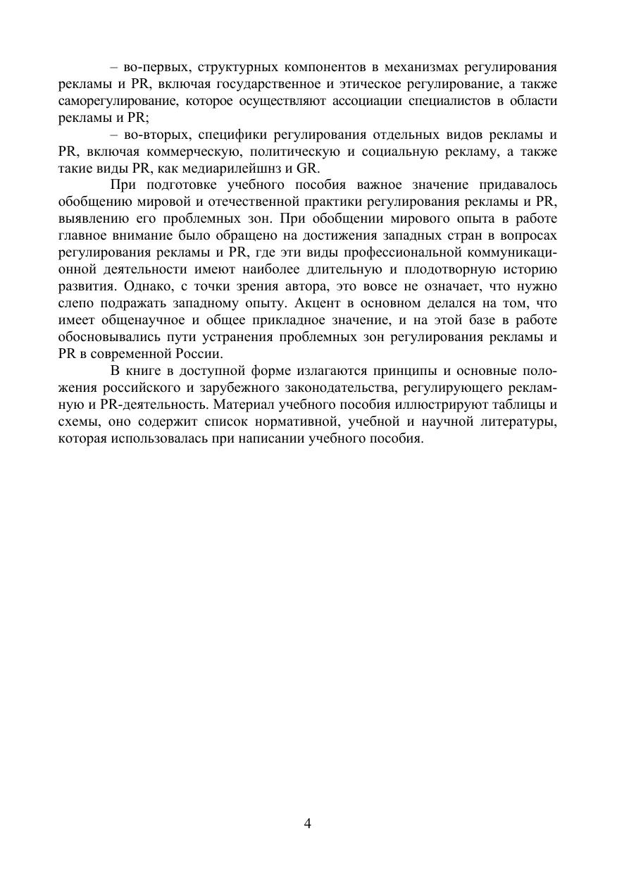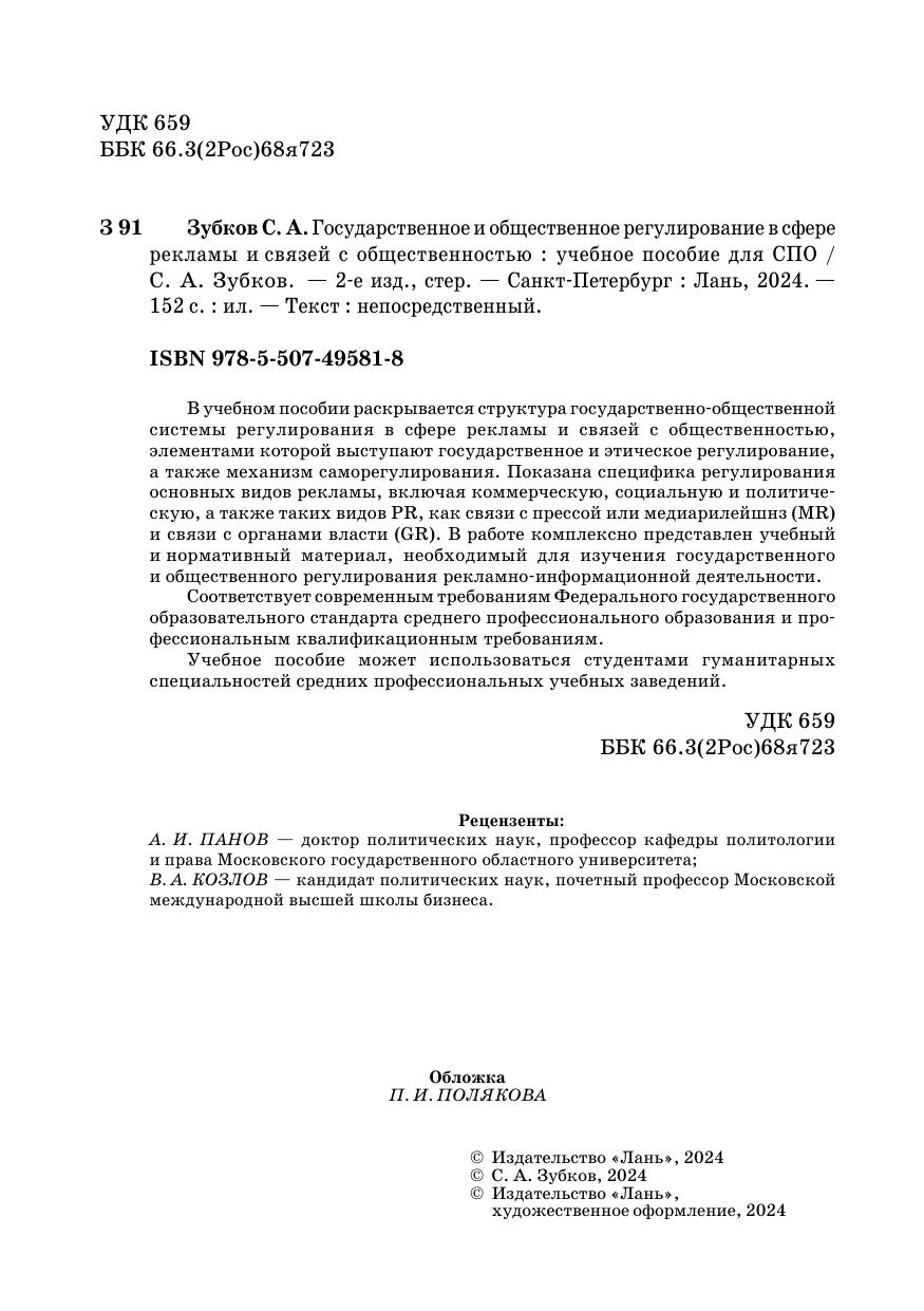 В учебном пособии раскрывается структура государственно-общественной системы регулирования в сфере рекламы и связей с общественностью, элементами которой выступают государственное и этическое регулирование, а также механизм саморегулирования. Показана специфика регулирования основных видов рекламы, включая коммерческую, социальную и политическую, а также таких видов PR, как связи с прессой или медиарилейшнз (MR) и связи с органами власти (GR). В работе комплексно представлен учебный и нормативный материал, необходимый для изучения государственного и общественного регулирования рекламно-информационной деятельности. Соответствует современным требованиям Федерального государственного образовательного стандарта среднего профессионального образования и профессиональным квалификационным требованиям. Учебное пособие может использоваться студентами гуманитарных специальностей средних профессиональных учебных заведений.