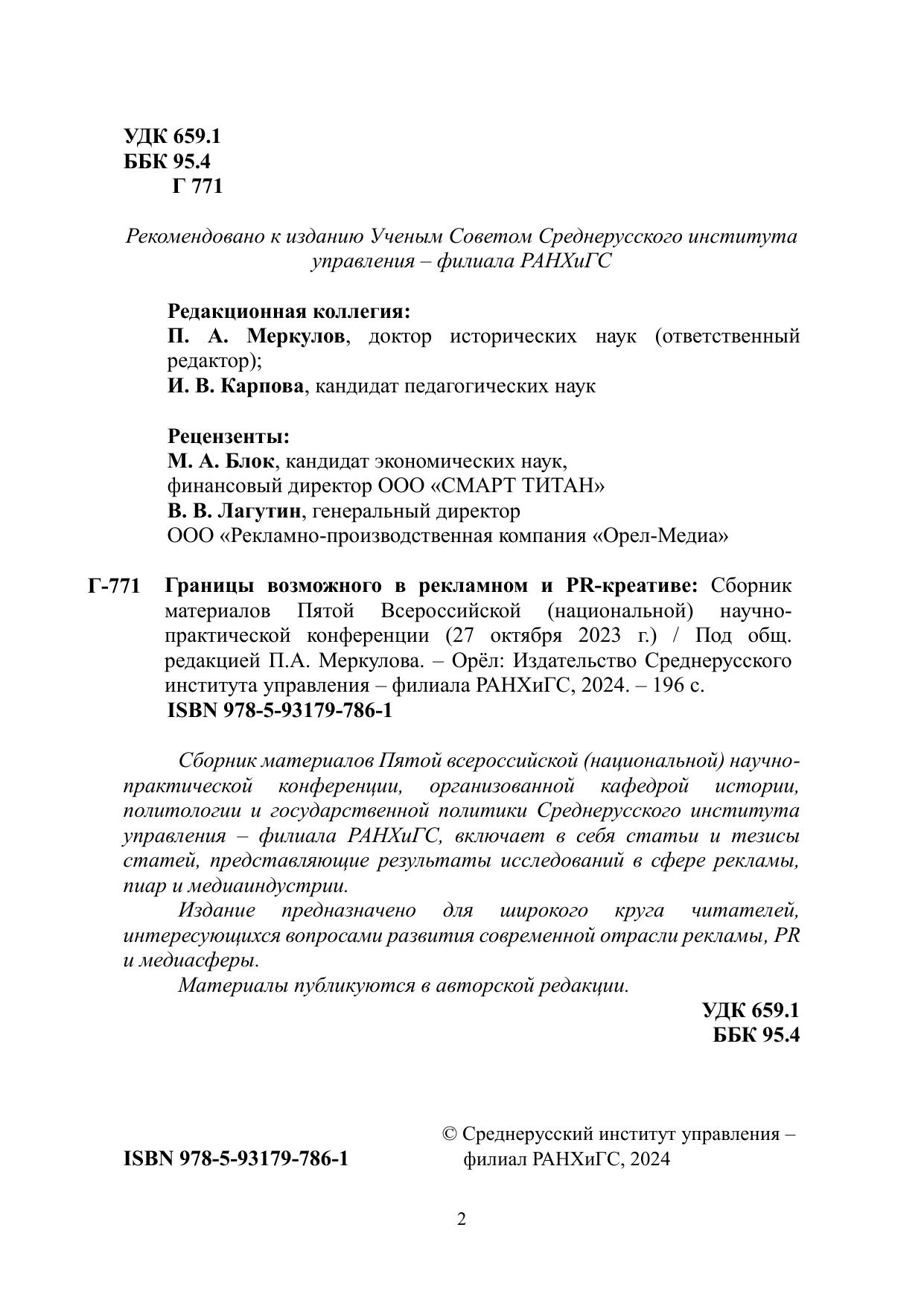 Сборник материалов Пятой всероссийской (национальной) научнопрактической конференции, организованной кафедрой истории, политологии и государственной политики Среднерусского института управления – филиала РАНХиГС, включает в себя статьи и тезисы статей, представляющие результаты исследований в сфере рекламы, пиар и медиаиндустрии. Издание предназначено для широкого круга читателей, интересующихся вопросами развития современной отрасли рекламы, PR и медиасферы. Материалы публикуются в авторской редакции.