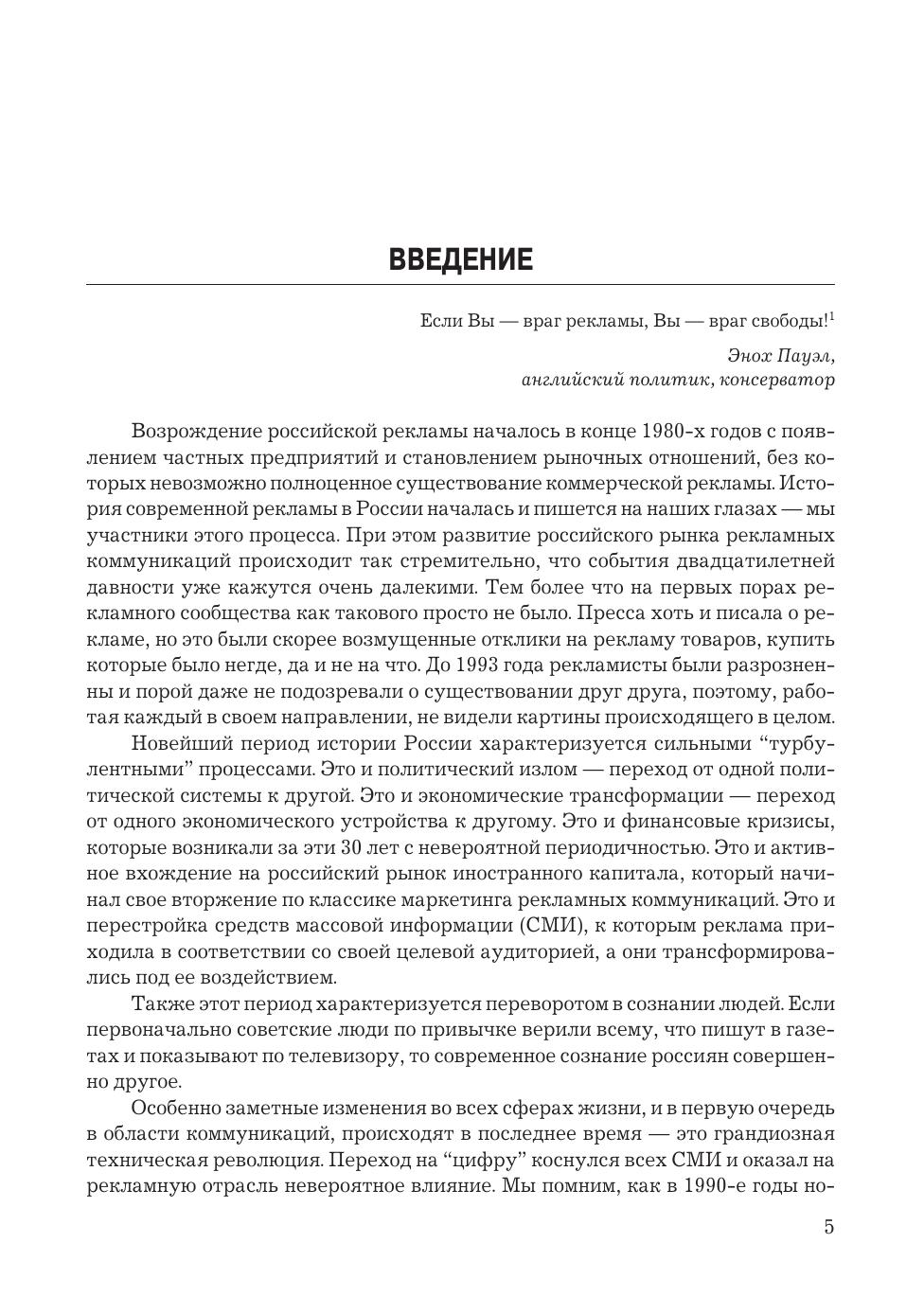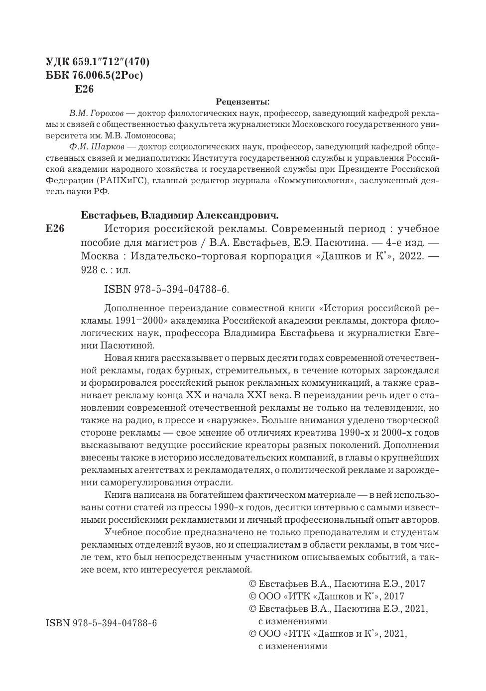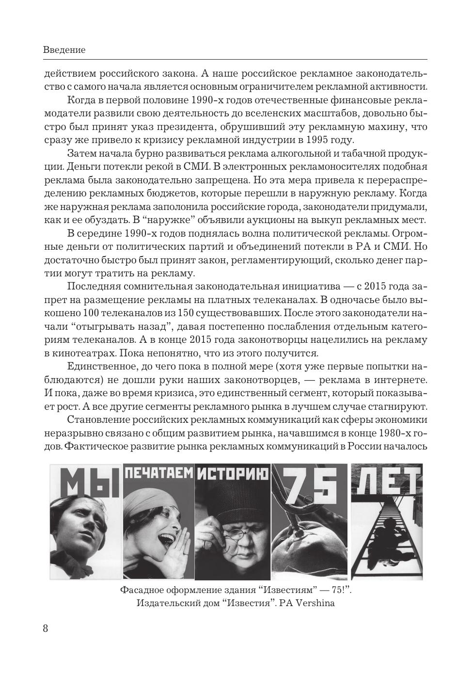 Дополненное переиздание современной книги "История российской рекламы. 1991-2000" академика Российской академии рекламы, доктора филологических наук, профессора Владимира Евстафьева и журналистки Евгении Пасютиной. Новая книга рассказывает о первых десяти годах современной отечественной рекламы, годах бурных, стремительных, в течение которых зарождался и формировался российский рынок рекламных коммуникаций, а также сравнивает рекламу конца XX и начала XXI века. В переиздании речь идет о становлении современной отечественной рекламы не только на телевидении, но также на радио, в прессе и "наружке". Больше внимания уделено творческой стороне рекламы - свое мнение об отличиях креатива 1990-х и 2000-х годов высказывают ведущие российские креаторы разных поколений. Дополнения внесены также в историю исследовательских компаний, в главы о крупнейших рекламных агентствах и рекламодателях, о политической рекламе и зарождении саморегулирования отрасли. Книга написана на богатейшем фактическом материале - в ней использованы сотни статей из прессы 1990-х годов, десятки интервью с самыми известными российскими рекламистами и личный профессиональный опыт авторов. Учебное пособие предназначено не только преподавателям и студентам рекламных отделений вузов, но и специалистам в области рекламы, в том числе тем, кто был непосредственным участником описываемых событий, а также всем, кто интересуется рекламой.