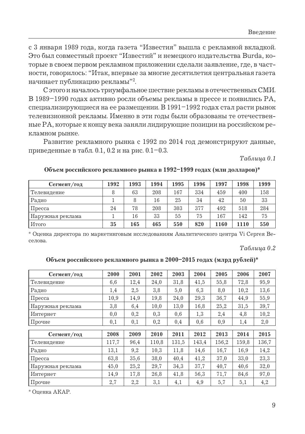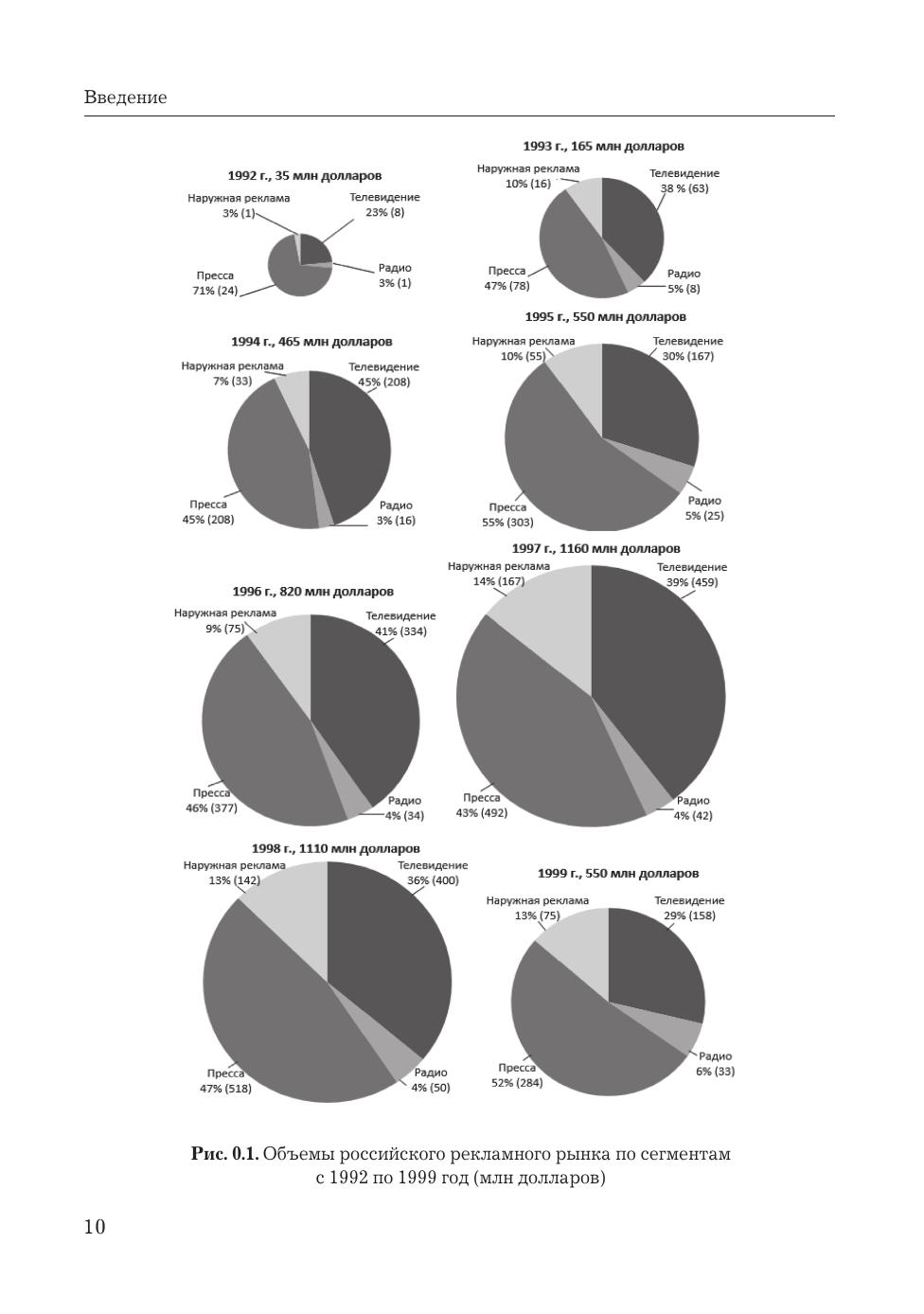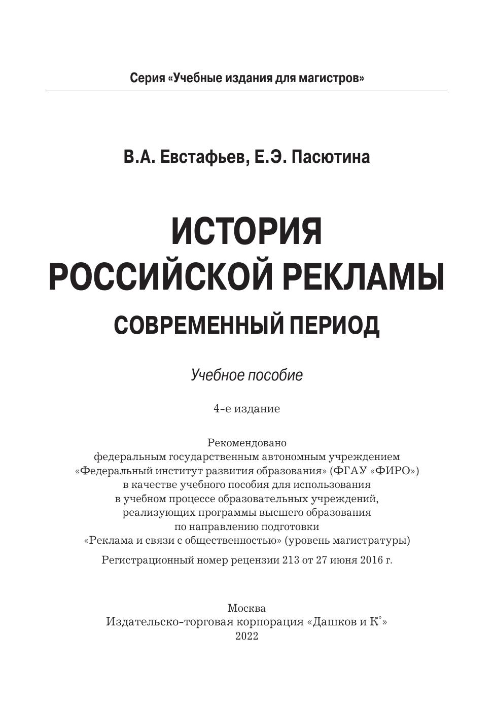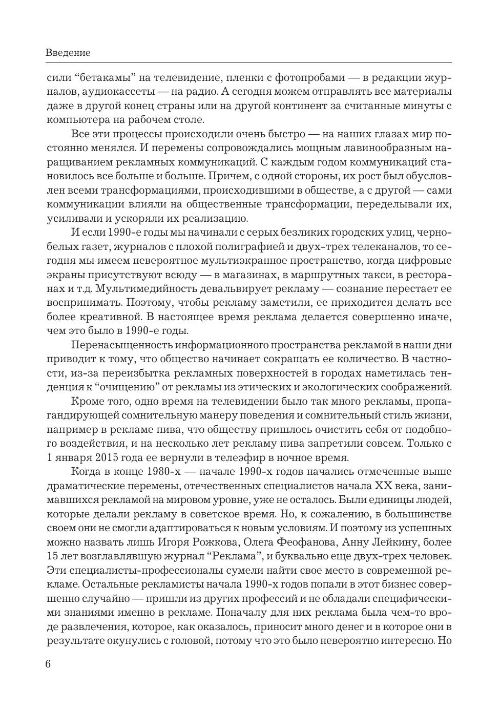 Дополненное переиздание современной книги "История российской рекламы. 1991-2000" академика Российской академии рекламы, доктора филологических наук, профессора Владимира Евстафьева и журналистки Евгении Пасютиной. Новая книга рассказывает о первых десяти годах современной отечественной рекламы, годах бурных, стремительных, в течение которых зарождался и формировался российский рынок рекламных коммуникаций, а также сравнивает рекламу конца XX и начала XXI века. В переиздании речь идет о становлении современной отечественной рекламы не только на телевидении, но также на радио, в прессе и "наружке". Больше внимания уделено творческой стороне рекламы - свое мнение об отличиях креатива 1990-х и 2000-х годов высказывают ведущие российские креаторы разных поколений. Дополнения внесены также в историю исследовательских компаний, в главы о крупнейших рекламных агентствах и рекламодателях, о политической рекламе и зарождении саморегулирования отрасли. Книга написана на богатейшем фактическом материале - в ней использованы сотни статей из прессы 1990-х годов, десятки интервью с самыми известными российскими рекламистами и личный профессиональный опыт авторов. Учебное пособие предназначено не только преподавателям и студентам рекламных отделений вузов, но и специалистам в области рекламы, в том числе тем, кто был непосредственным участником описываемых событий, а также всем, кто интересуется рекламой.