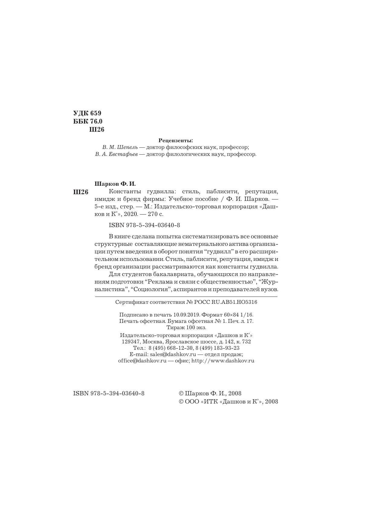 В книге впервые в мировой практике сделана попытка систематизировать все основные структурные составляющие нематериального актива организации путем введения в оборот понятия “гудвилл” в его расширительном использовании. Стиль, паблисити, репутация, имидж и бренд организации рассматриваются как константы гудвилла. Для студентов, обучающихся по специальностям “Связи с общественностью”, “Реклама”, “Журналистика”, “Социология”, аспирантов, преподавателей вузов, а также читателей, интересующихся данной проблематикой.