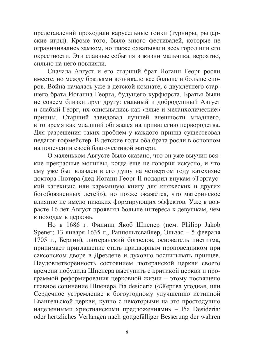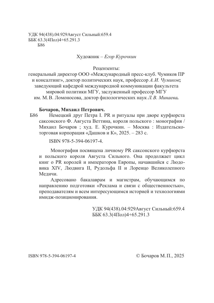 Монография посвящена личному PR саксонского курфюрста и польского короля Августа Сильного. Она продолжает цикл книг о PR королей и императоров Европы, начавшийся с Людовика XIV, Людвига II, Рудольфа II и Лоренцо Великолепного Медичи.