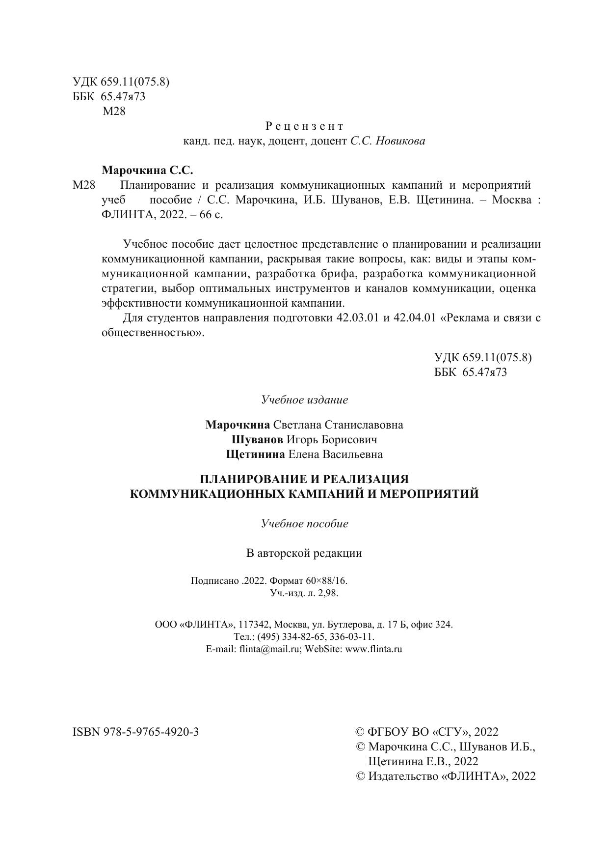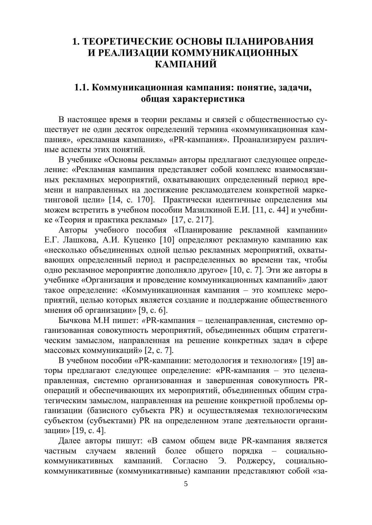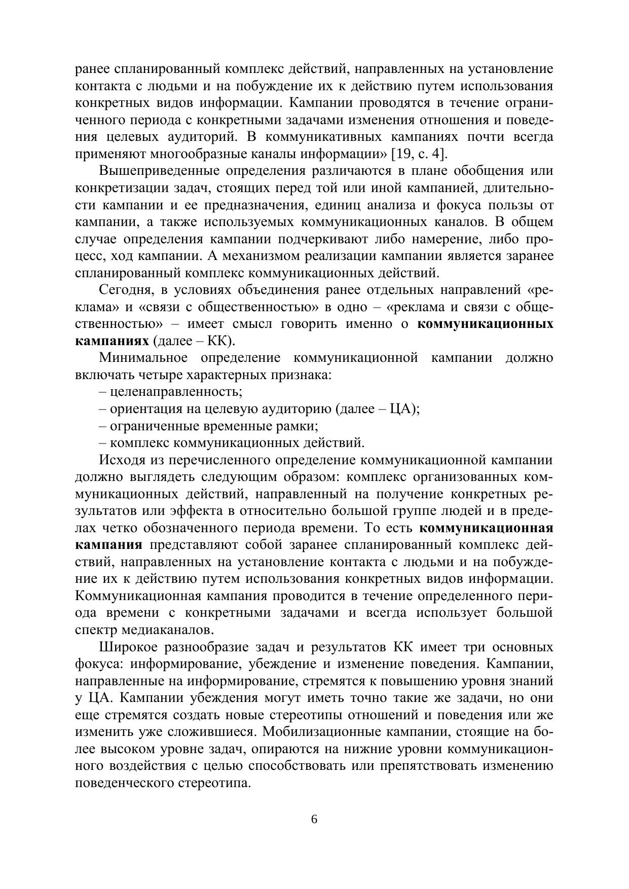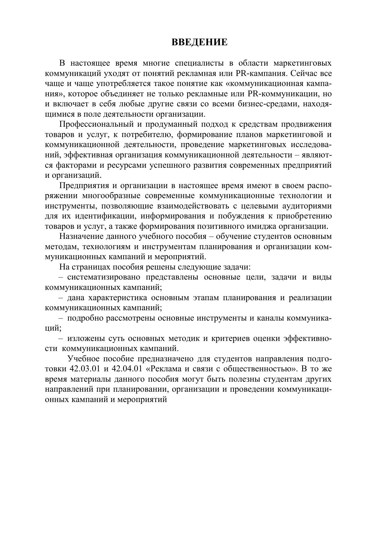 Учебное пособие дает целостное представление о планировании и реализации коммуникационной кампании, раскрывая такие вопросы, как: виды и этапы ком-муникационной кампании, разработка брифа, разработка коммуникационной стратегии, выбор оптимальных инструментов и каналов коммуникации, оценка эффективности коммуникационной кампании.