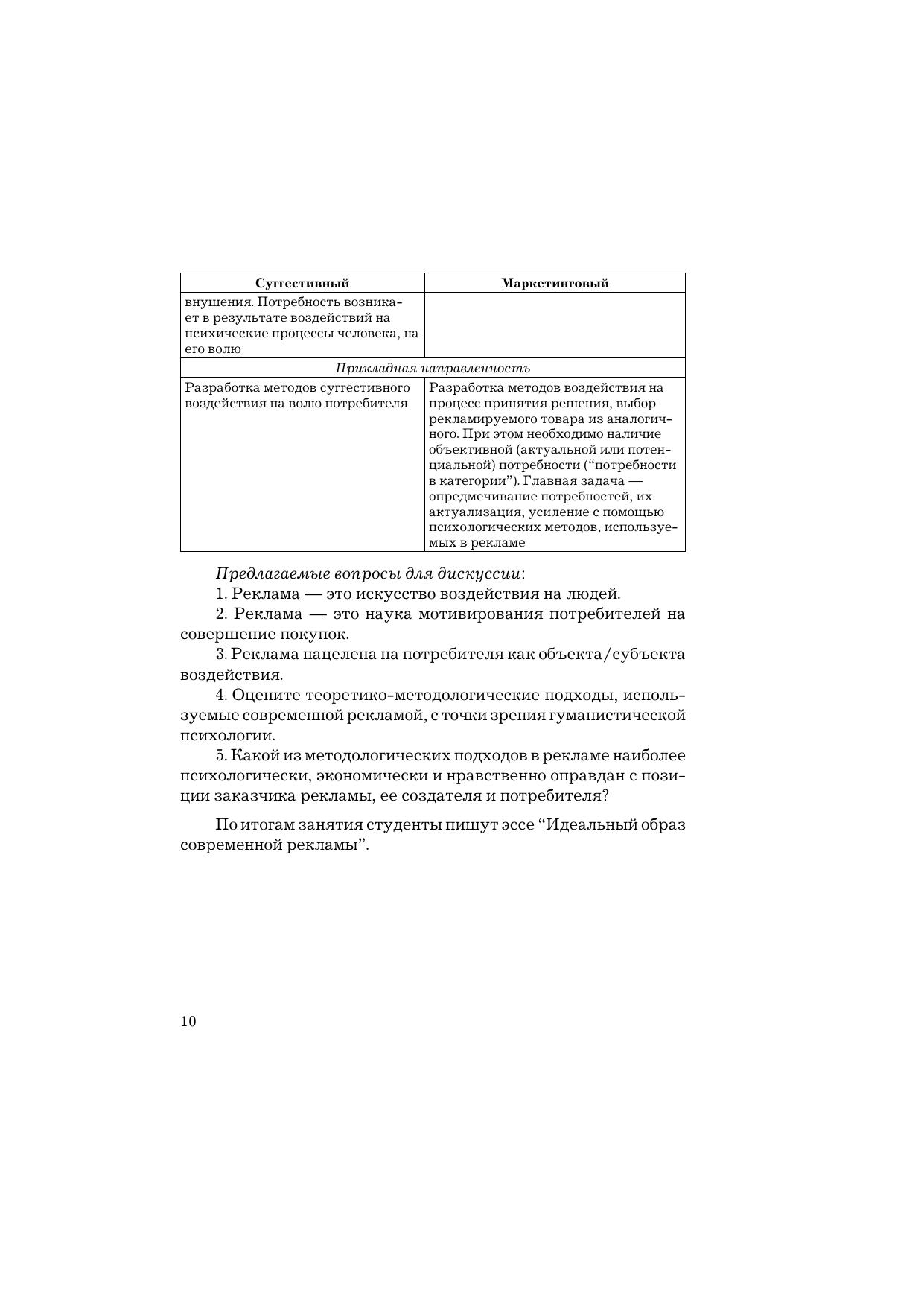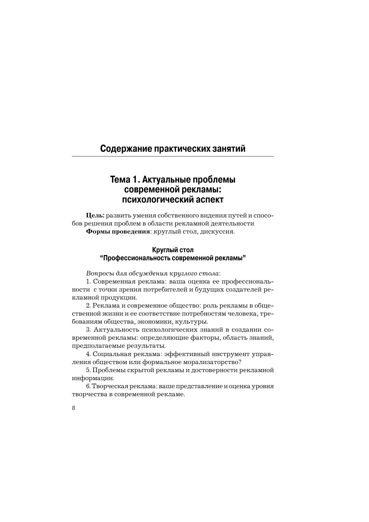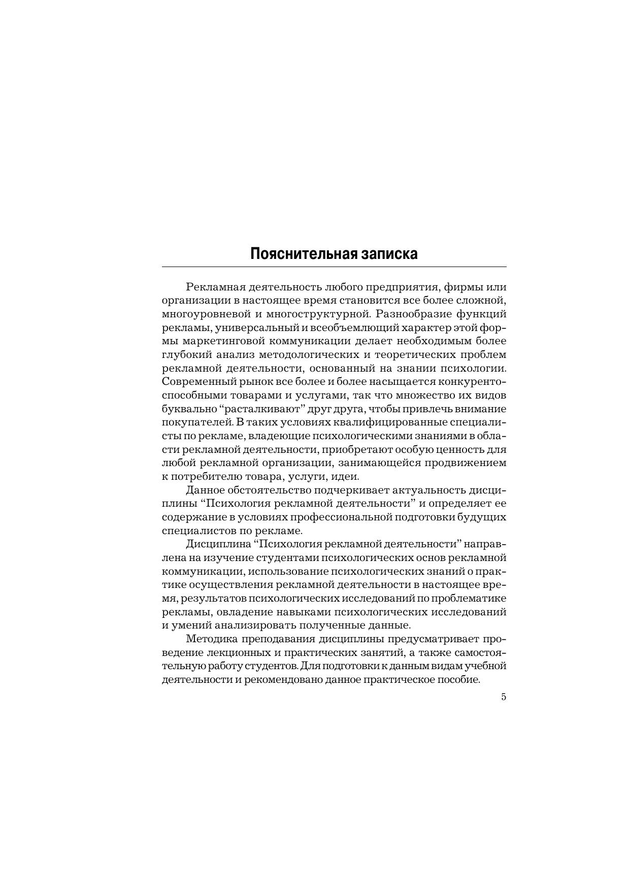 Пособие содержит теоретический, методологический и фактический материал, освещающий практические аспекты психологии рекламной деятельности, а также материал для дискуссий, разбора проблемных ситуаций, решения кейс-ситуаций, психологические задачи. В пособие входят психологические и деловые игры, позволяющие проводить практические занятия в режиме тренинга, направленные на формирование психологической компетентности студентов в области создания профессиональной рекламы, развитие коммуникативных умений, выявление индивидуально-личностных особенностей и профессионально значимых качеств будущих рекламистов. Результаты психодиагностики могут быть использованы в психологическом консультировании студентов по планированию карьеры в рекламном деле. Для студентов специальности "Реклама", преподавателей и студентов вузов, менеджеров рекламы и всех, кто интересуется проблемами психологии рекламной деятельности.