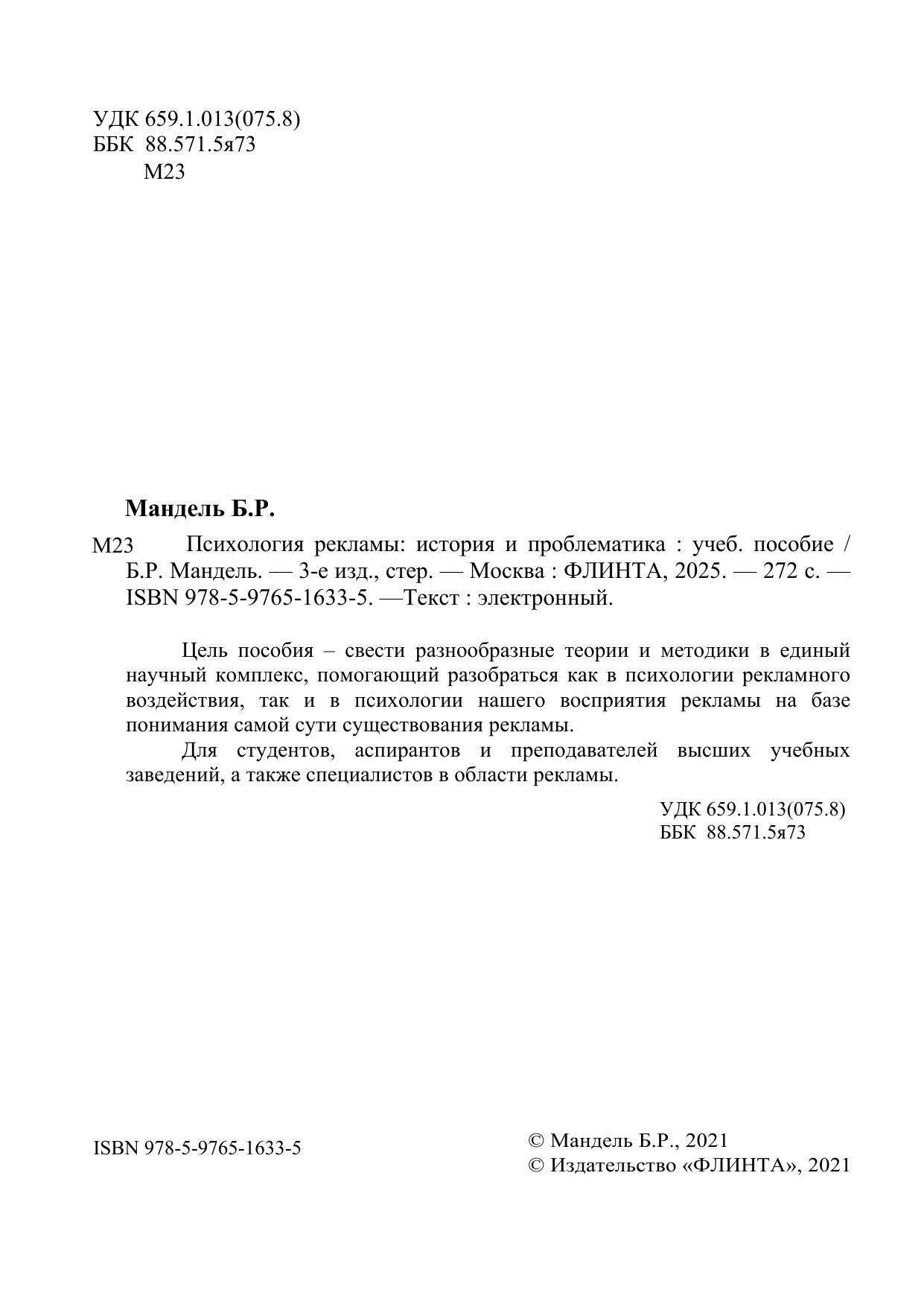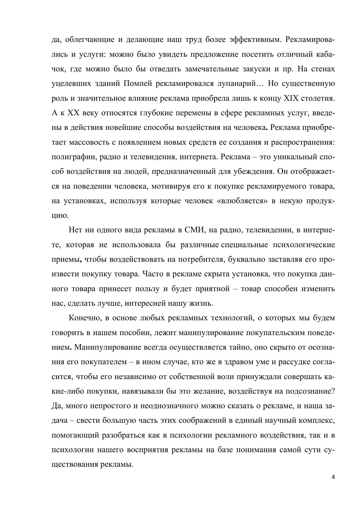 Цель пособия – свести разнообразные теории и методики в единый научный комплекс, помогающий разобраться как в психологии рекламного воздействия, так и в психологии нашего восприятия рекламы на базе понимания самой сути существования рекламы. Для студентов, аспирантов и преподавателей высших учебных заведений, а также специалистов в области рекламы.