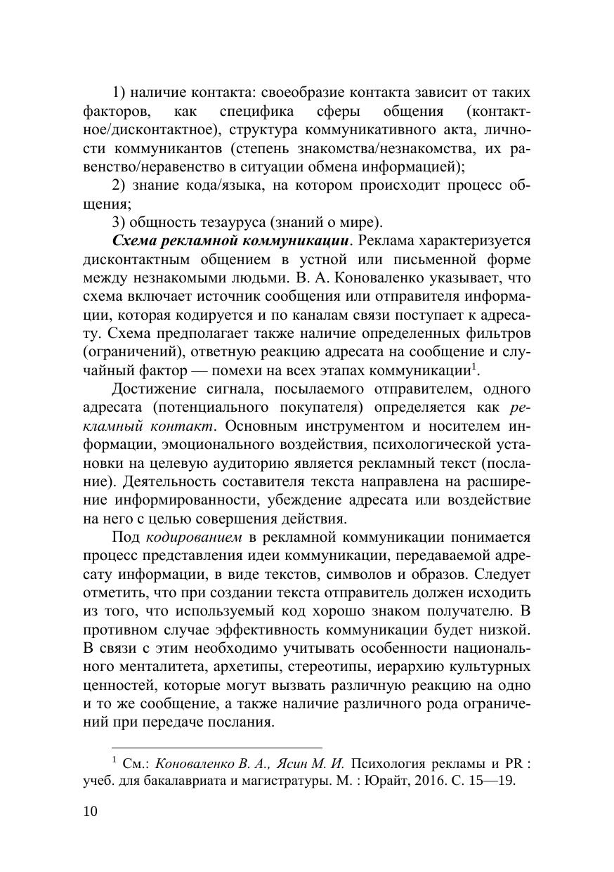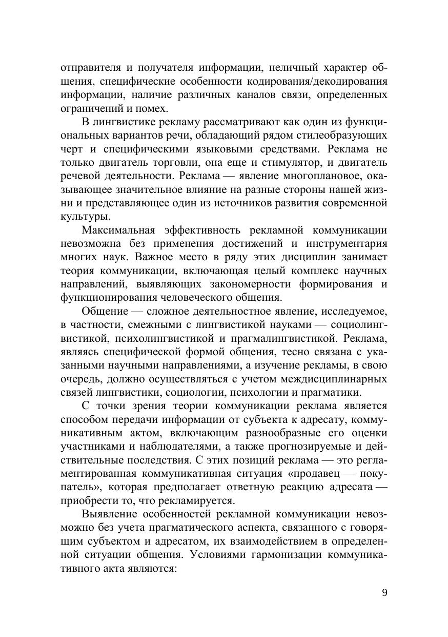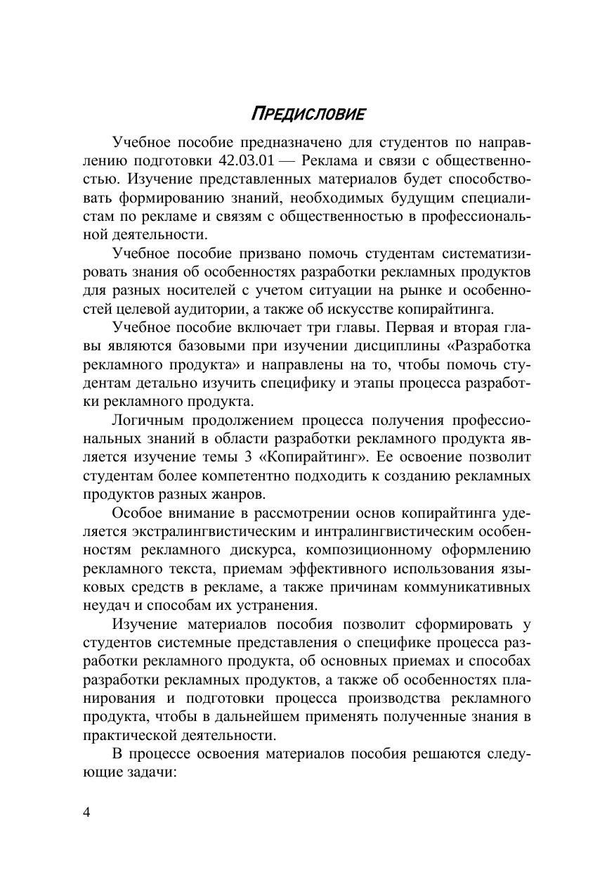 В учебном пособии рассматриваются основные вопросы разработки и производства рекламного продукта — психологические особенности его вос-приятия; теории, используемые для его создания; основные подходы к разра-ботке идеи, концепции и стратегии рекламного обращения; различные виды и формы рекламного продукта и особенности творческого процесса. Логичным продолжением процесса получения1 профессиональных зна-ний, в области разработки рекламного продукта является изучение основ ко-пирайтинга. Освоение копирайтинга с опорой на материалы учебного пособия позволит студентам более компетентно подходить к созданию рекламных про-дуктов разных жанров. Особое внимание в рассмотрении основ копирайтинга уделяется экстра-лингвистическим и интралингвистическим особенностям рекламного дискур-са, композиционному оформлению рекламного текста, приемам эффективного использования языковых средств в рекламе, а также причинам коммуникатив-ных неудач и способам их устранения. Предназначено для студентов по направлению подготовки 42.03.01 — Ре-клама и связи с общественностью для изучения дисциплин «Разработка реклам-ного продукта» и «Копирайтинг». Также данное пособие будет полезно специа-листам по рекламе, преподавателям соответствующих дисциплин и аспирантам.