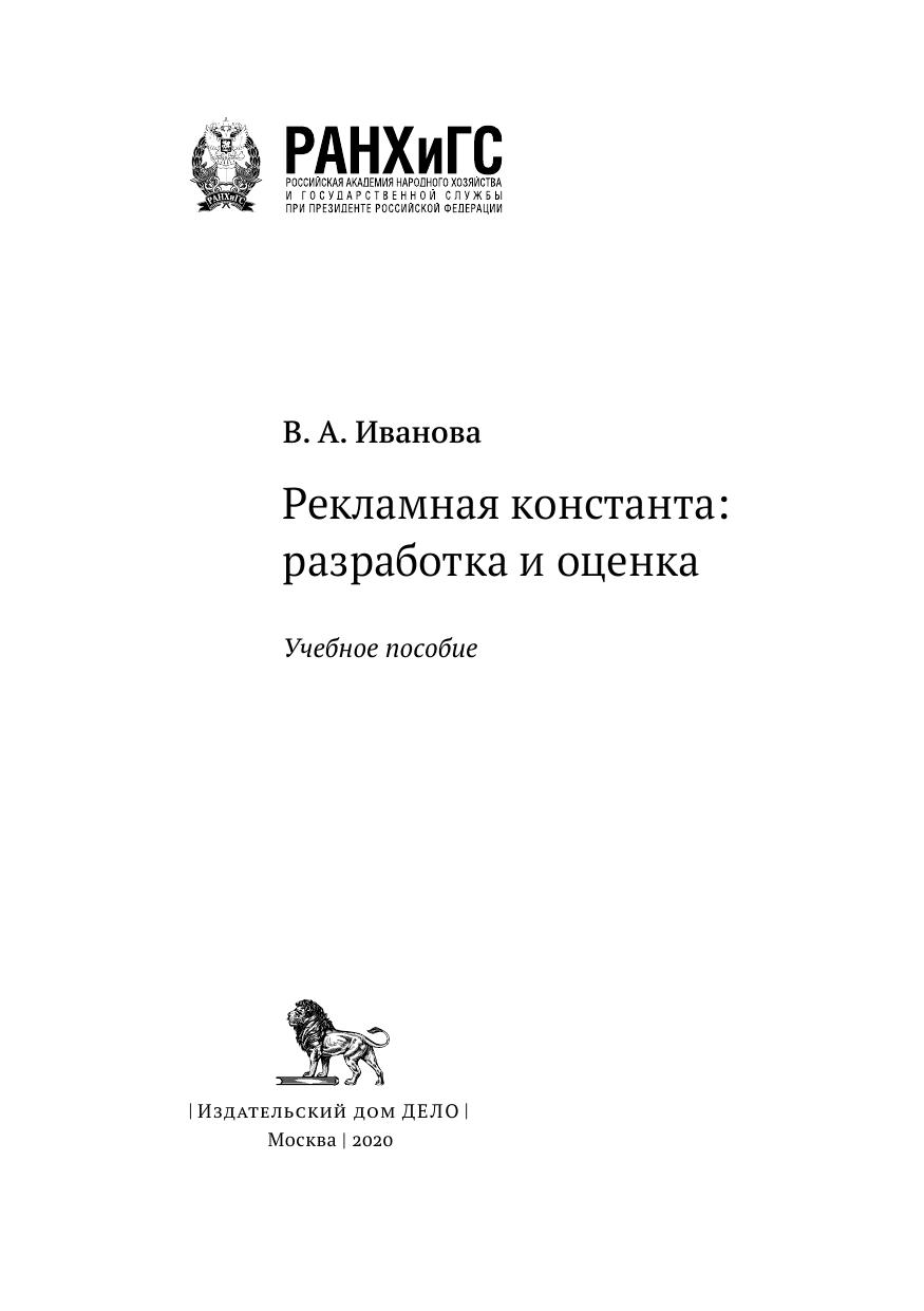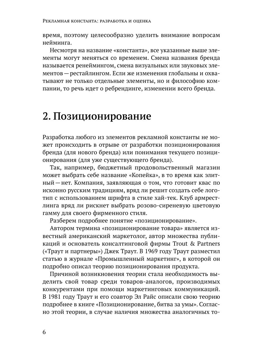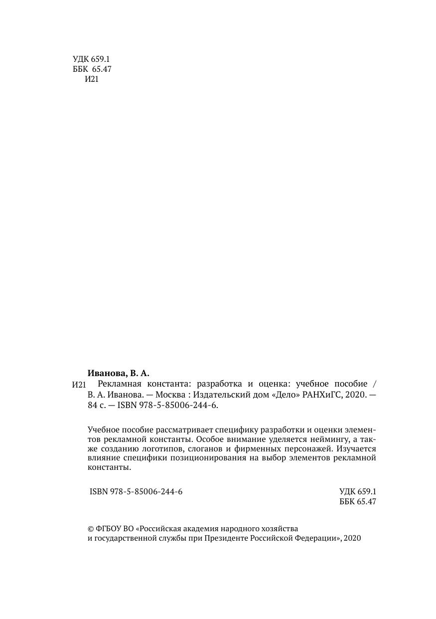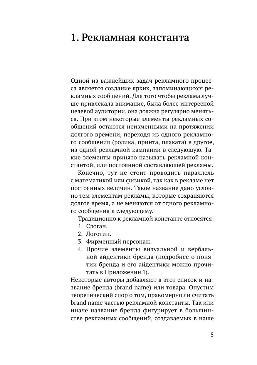 Учебное пособие рассматривает специфику разработки и оценки элементов рекламной константы. Особое внимание уделяется неймингу, а также созданию логотипов, слоганов и фирменных персонажей. Изучается влияние специфики позиционирования на выбор элементов рекламной константы.