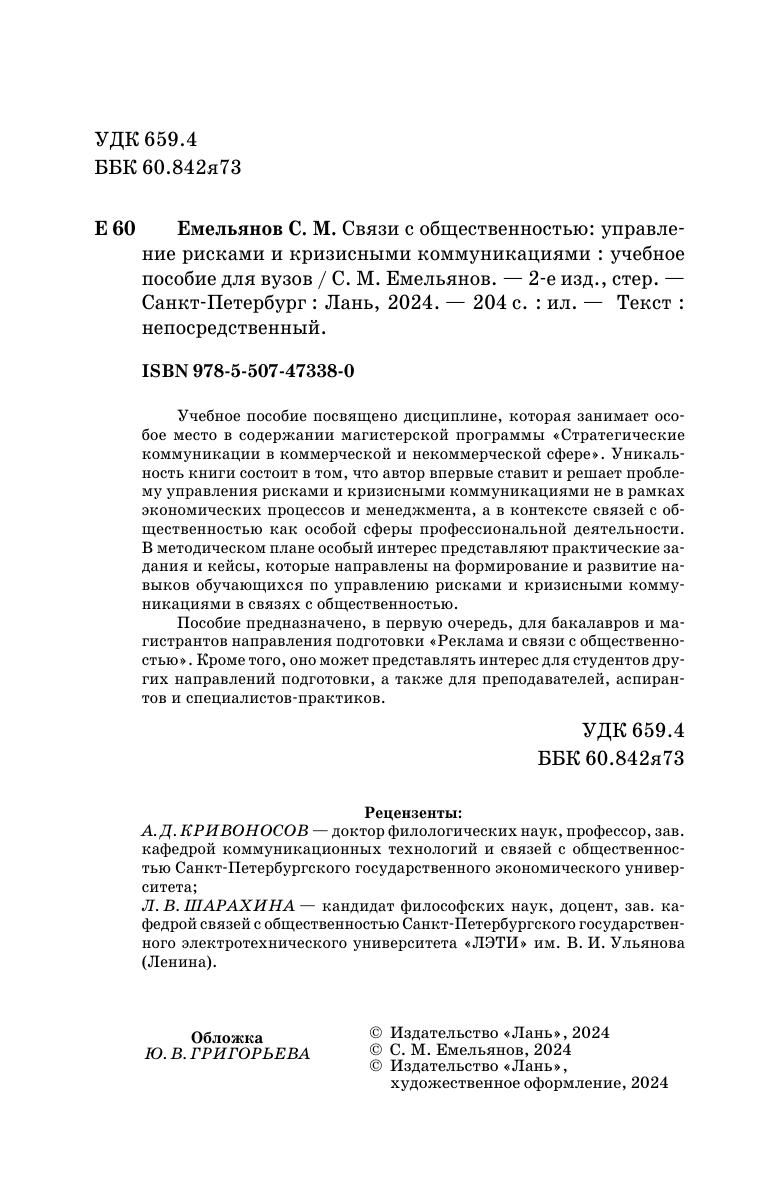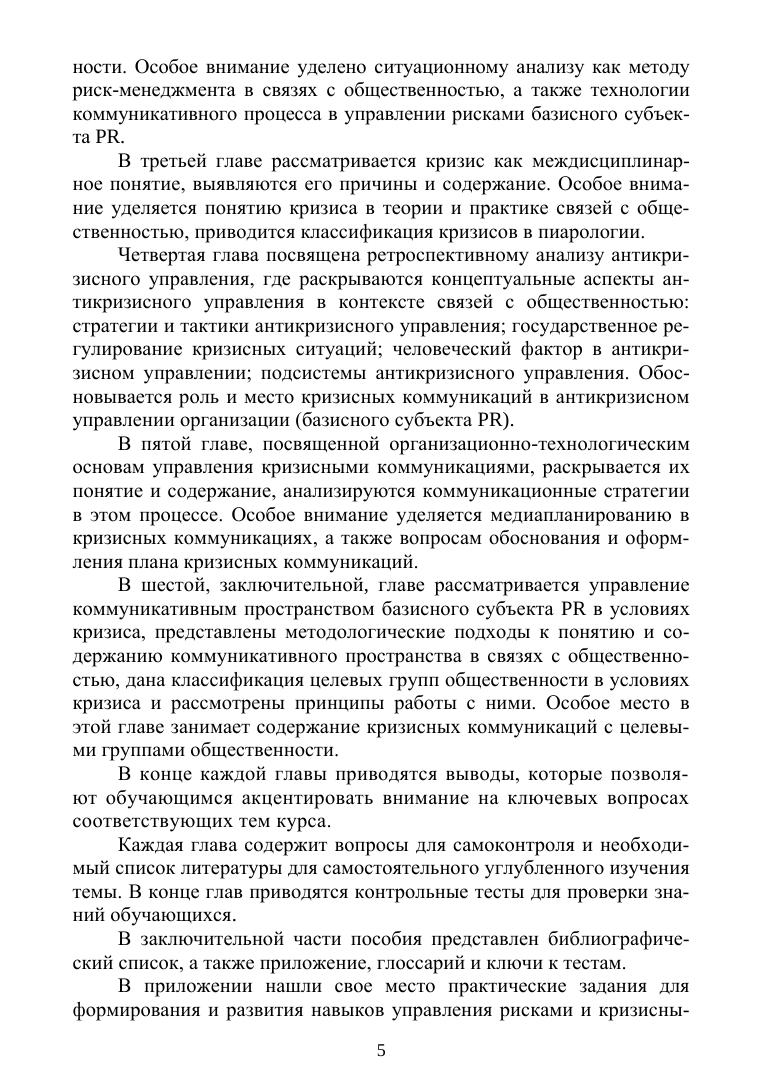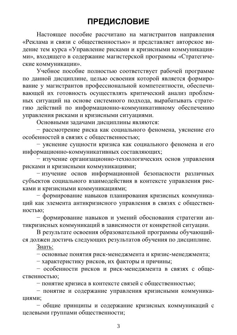 Учебное пособие посвящено дисциплине, которая занимает особое место в содержании магистерской программы «Стратегические коммуникации в коммерческой и некоммерческой сфере». Уникальность книги состоит в том, что автор впервые ставит и решает проблему управления рисками и кризисными коммуникациями не в рамках экономических процессов и менеджмента, а в контексте связей с общественностью как особой сферы профессиональный деятельности. В методическом плане особый интерес представляют практические задания и кейсы, которые направлены на формирование и развитие навыков обучающихся по управлению рисками и кризисными коммуникациями в связях с общественностью. Пособие предназначено, в первую очередь, для бакалавров и магистрантов направления подготовки «Реклама и связи с общественностью». Кроме того, оно может представлять интерес для студентов других направлений подготовки, а также для преподавателей, аспирантов и специалистов-практиков.