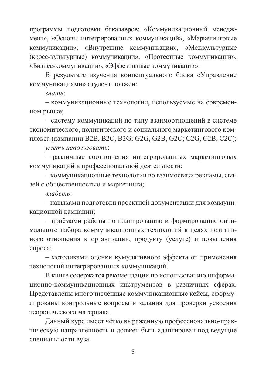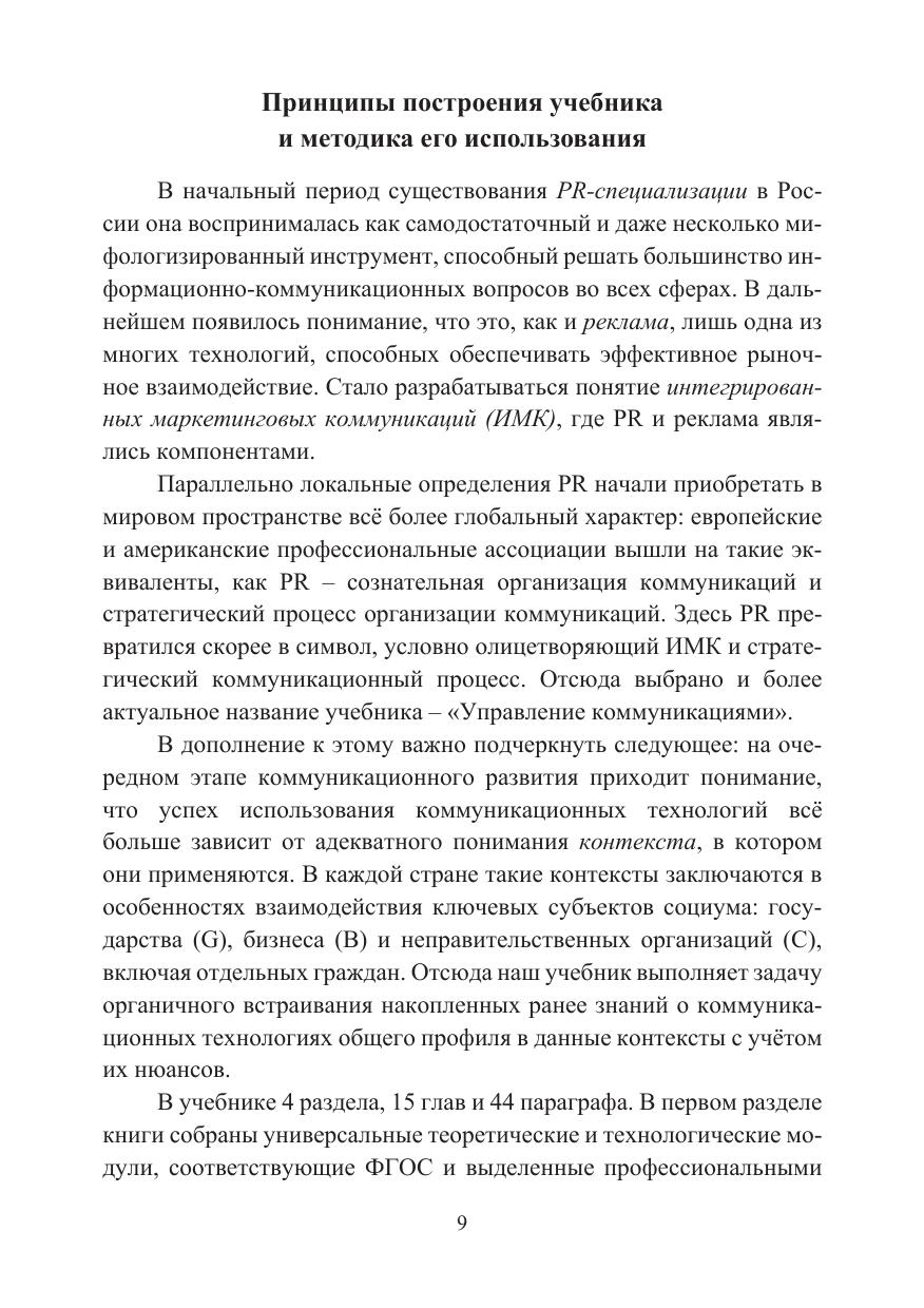 В учебнике представлен универсальный блок профессиональных компетенций специалиста по коммуникациям (рекламе и связям с общественностью, журналистике и медиакоммуникациям), а также раскрыты особенности коммуникаций в различных страте-гических моделях взаимоотношений важнейших субъектов социальной жизни: государственных (G), коммерческих (B), неправи-тельственных организаций; отдельных граждан (C).