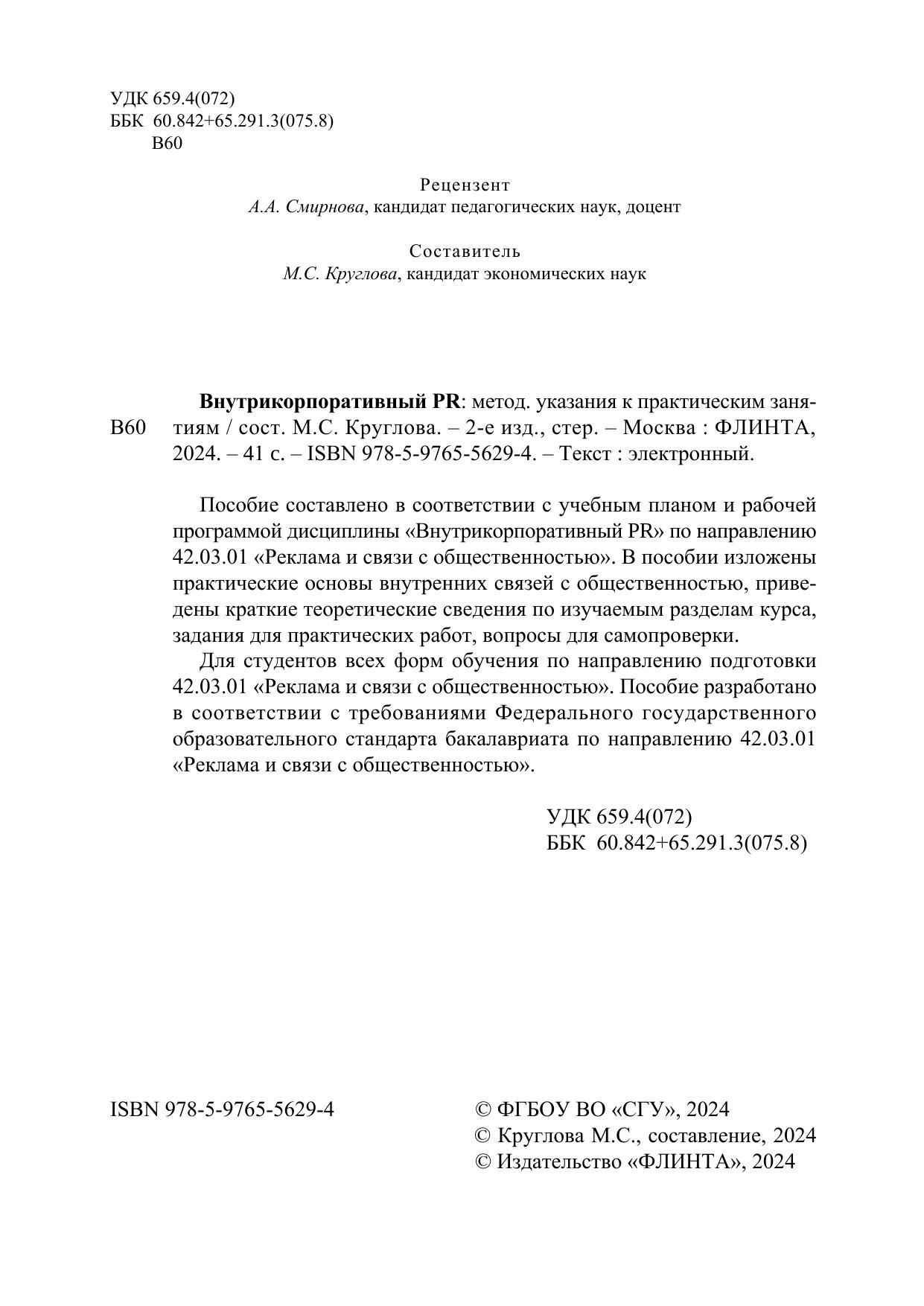 Пособие составлено в соответствии с учебным планом и рабочей программой дисциплины «Внутрикорпоративный PR» по направлению 42.03.01 «Реклама и связи с общественностью». В пособии изложены практические основы внутренних связей с общественностью, приведены краткие теоретические сведения по изучаемым разделам курса, задания для практических работ, вопросы для самопроверки. Для студентов всех форм обучения по направлению подготовки 42.03.01 «Реклама и связи с общественностью». Разработано в соответствии с требованиями Федерального государственного образовательного стандарта бакалавриата по направлению 42.03.01 «Реклама и связи с общественностью».