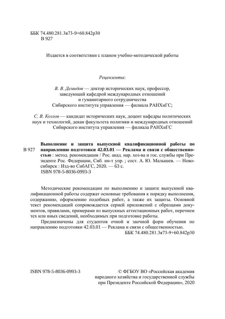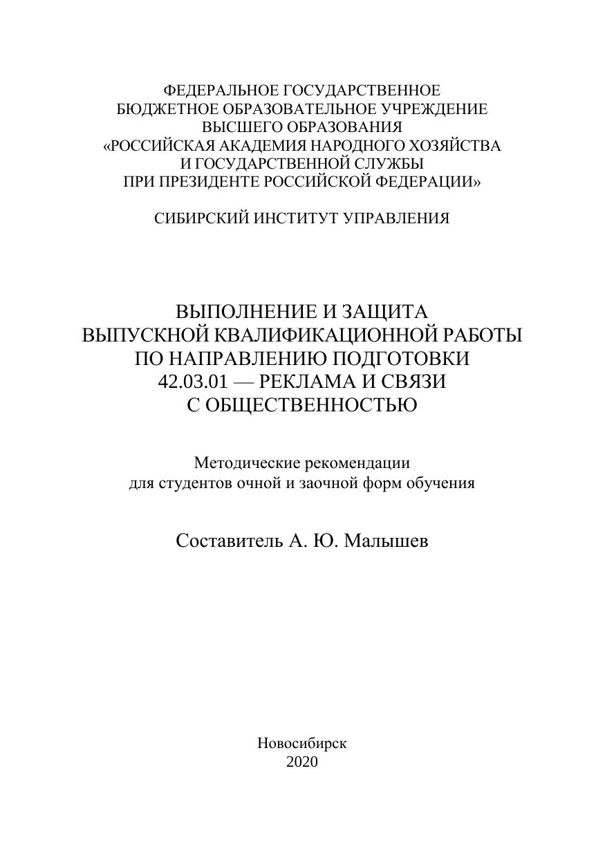 Методические рекомендации по выполнению и защите выпускной ква-лификационной работы содержат основные требования к порядку выполнения, содержанию, оформлению подобных работ, а также их защиты. Основной текст рекомендаций сопровождается серией приложений с образцами доку-ментов, правилами, примерами из выпускных аттестационных работ, перечнем тех или иных сведений, необходимых при подготовке работы. Предназначены для студентов очной и заочной форм обучения по направлению подготовки 42.03.01 — Реклама и связи с общественностью.
