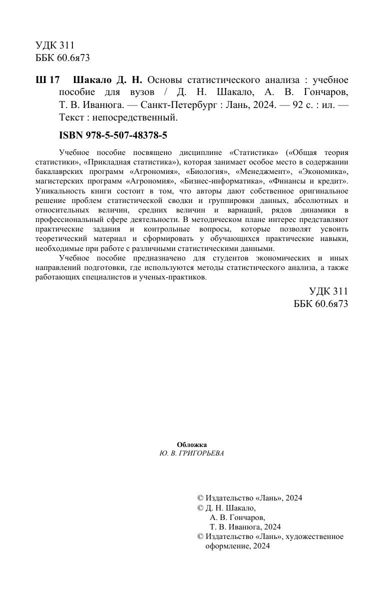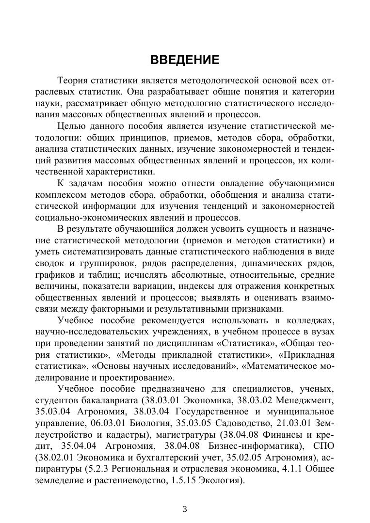 Учебное пособие посвящено дисциплине «Статистика» («Общая теория статистики», «Прикладная статистика»), которая занимает особое место в содержании бакалаврских программ «Агрономия», «Биология», «Менеджмент», «Экономика», магистерских программ «Агрономия», «Бизнес-информатика», «Финансы и кредит». Уникальность книги состоит в том, что авторы дают собственное оригинальное решение проблем статистической сводки и группировки данных, абсолютных и относительных величин, средних величин и вариаций, рядов динамики в профессиональный сфере деятельности. В методическом плане интерес представляют практические задания и контрольные вопросы, которые позволят усвоить теоретический материал и сформировать у обучающихся практические навыки, необходимые при работе с различными статистическими данными. Учебное пособие предназначено для студентов экономических и иных направлений подготовки, где используются методы статистического анализа, а также работающих специалистов и ученых-практиков.