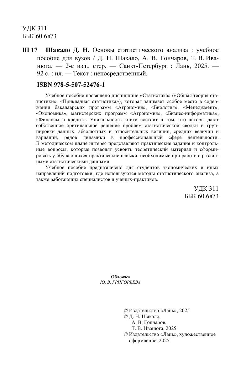 Учебное пособие посвящено дисциплине «Статистика» («Общая теория статистики», «Прикладная статистика»), которая занимает особое место в содержании бакалаврских программ «Агрономия», «Биология», «Менеджмент», «Экономика», магистерских программ «Агрономия», «Бизнес-информатика», «Финансы и кредит». Уникальность книги состоит в том, что авторы дают собственное оригинальное решение проблем статистической сводки и группировки данных, абсолютных и относительных величин, средних величин и вариаций, рядов динамики в профессиональный сфере деятельности. В методическом плане интерес представляют практические задания и контрольные вопросы, которые позволят усвоить теоретический материал и сформировать у обучающихся практические навыки, необходимые при работе с различными статистическими данными. Учебное пособие предназначено для студентов экономических и иных направлений подготовки, где используются методы статистического анализа, а также работающих специалистов и ученых-практиков.