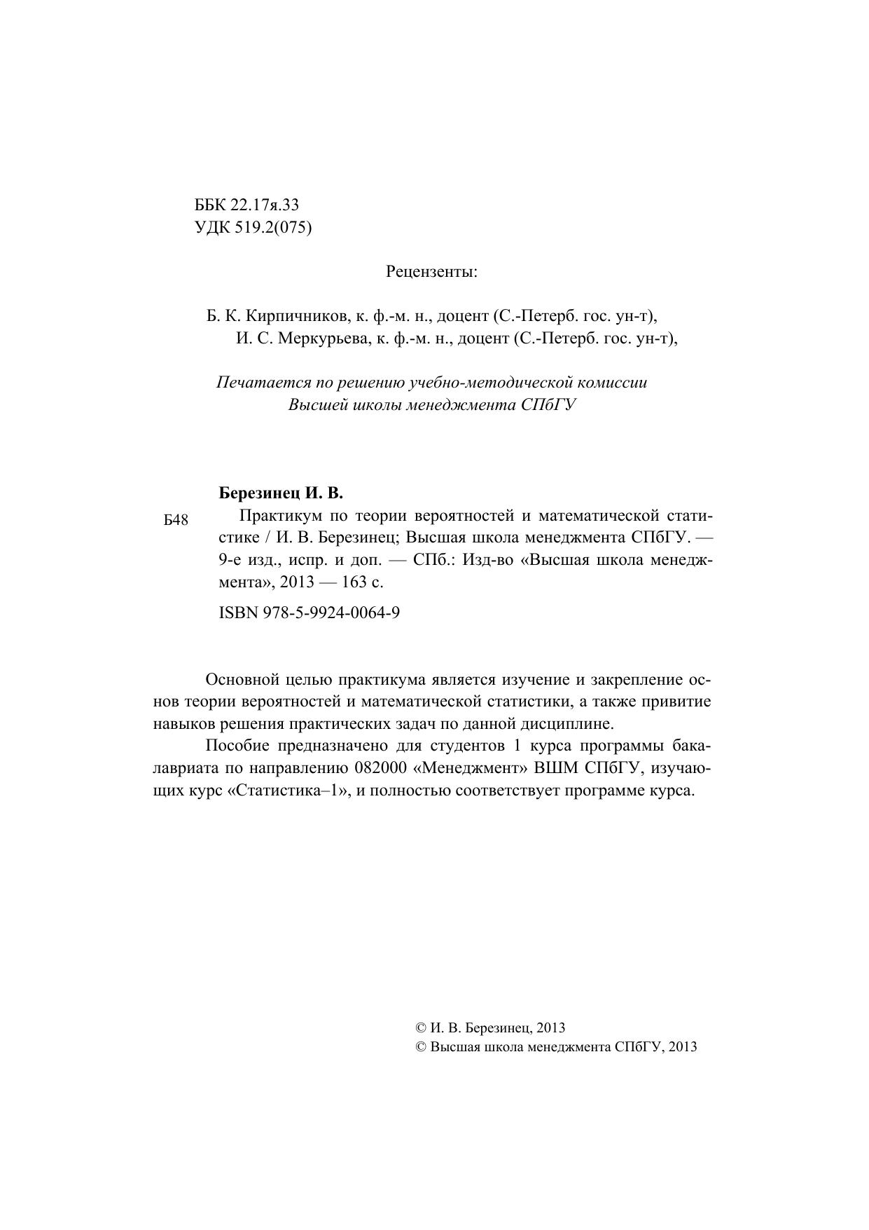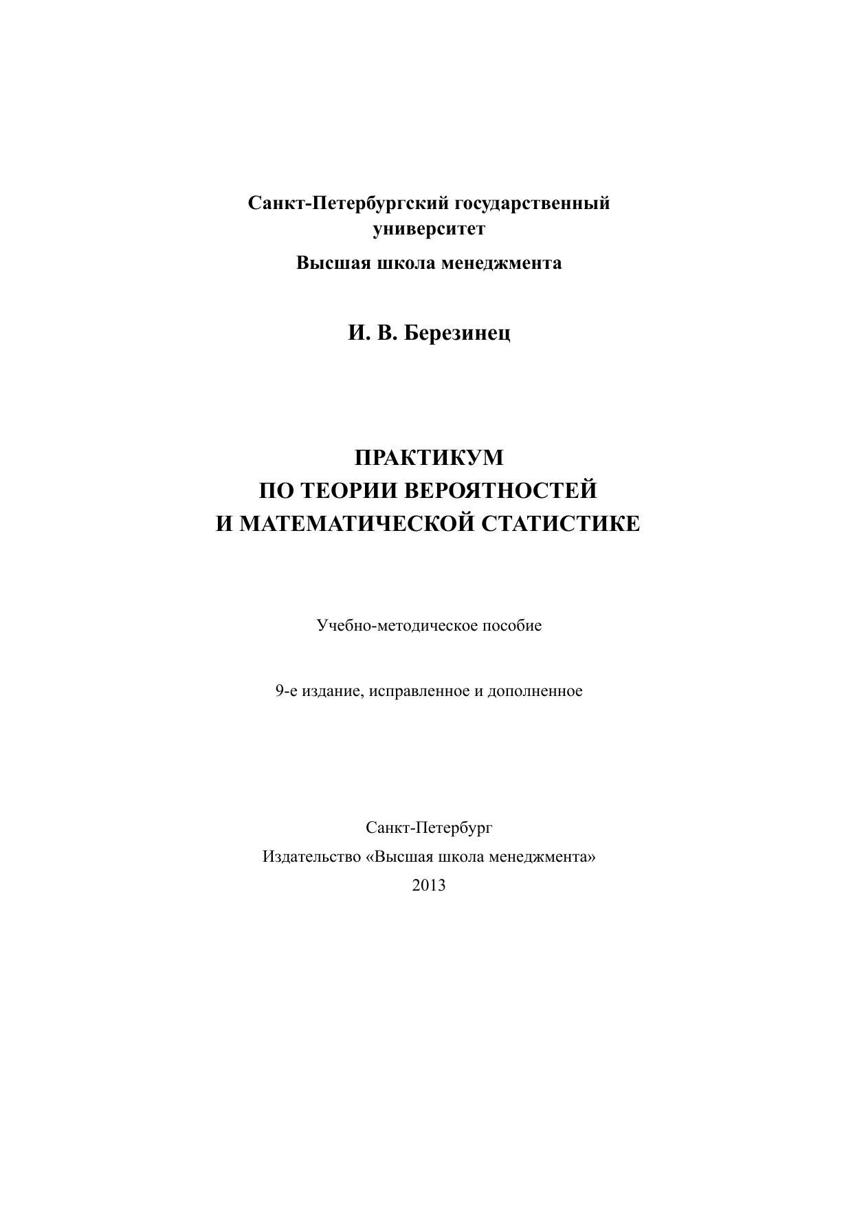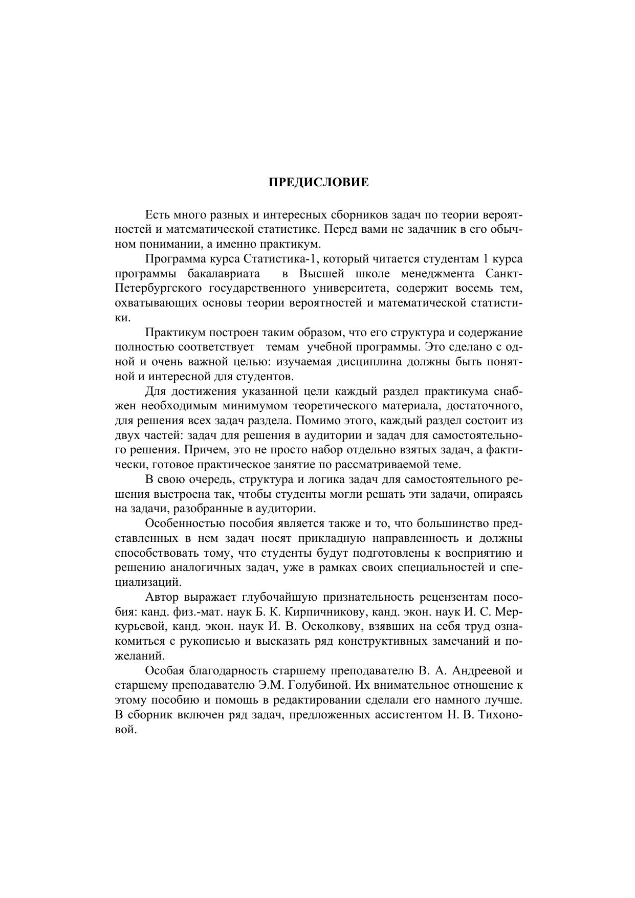Основными целями практикума являются изучение и закрепление основ теории вероятностей и математической статистики, а также привитие навыков решения практических задач по данной дисциплине. Пособие предназначено для студентов 1 курса программы бакалавриата по направлению 080200 «Менеджмент» ВШМ СПбГУ, изучающих курс «Статистика–1», и полностью соответствует программе курса.