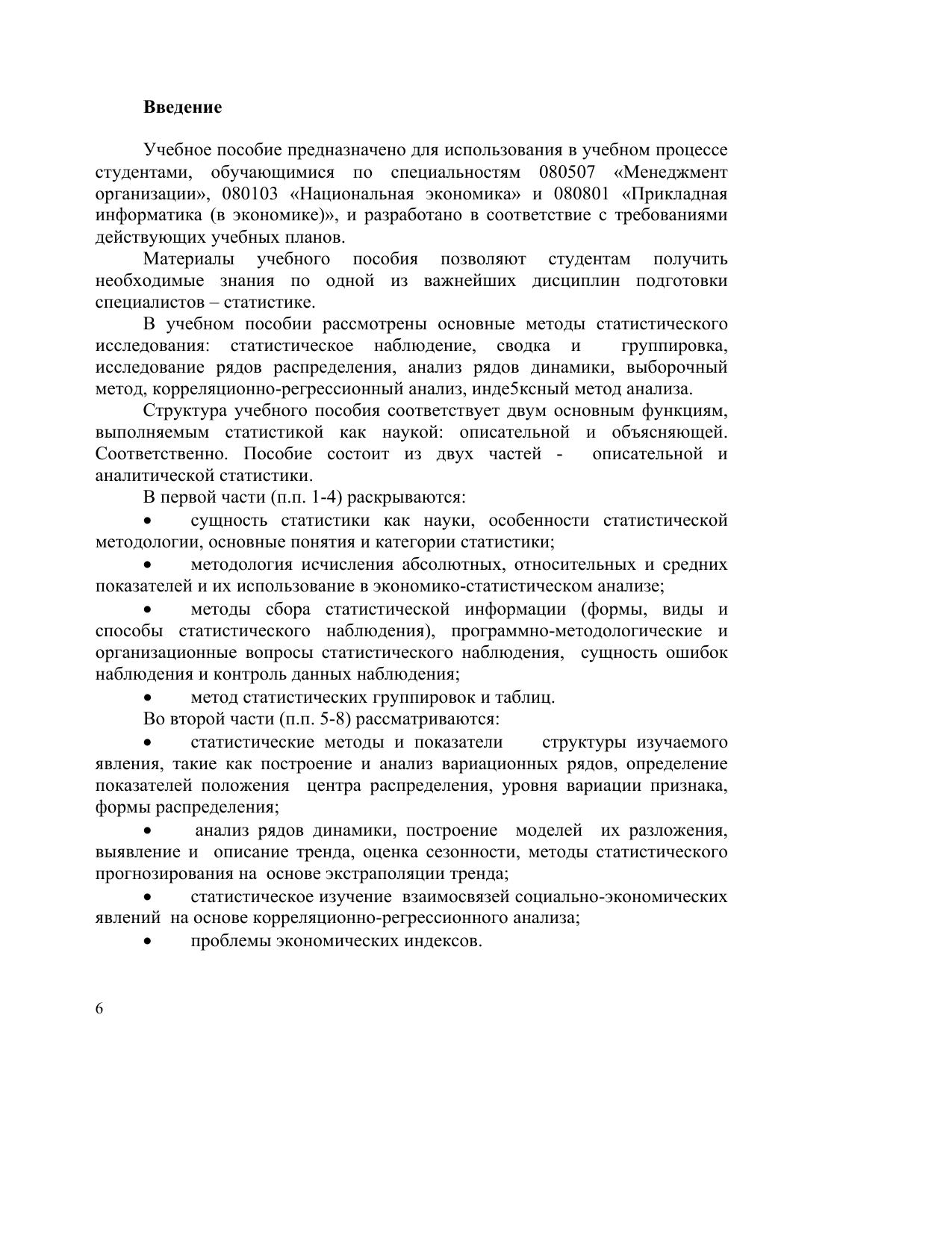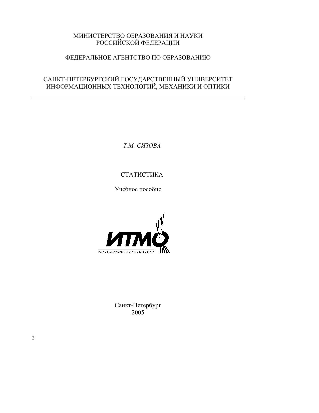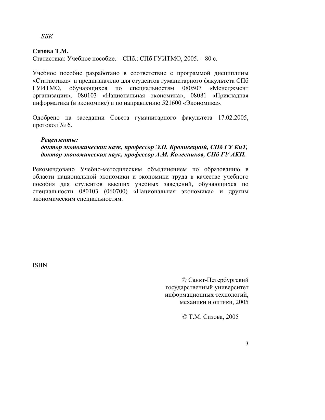 Учебное пособие разработано в соответствие с программой дисциплины «Статистика» и предназначено для студентов гуманитарного факультета СПб ГУИТМО, обучающихся по специальностям 080507 «Менеджмент организации», 080103 «Национальная экономика», 08081 «Прикладная информатика (в экономике) и по направлению 521600 «Экономика».