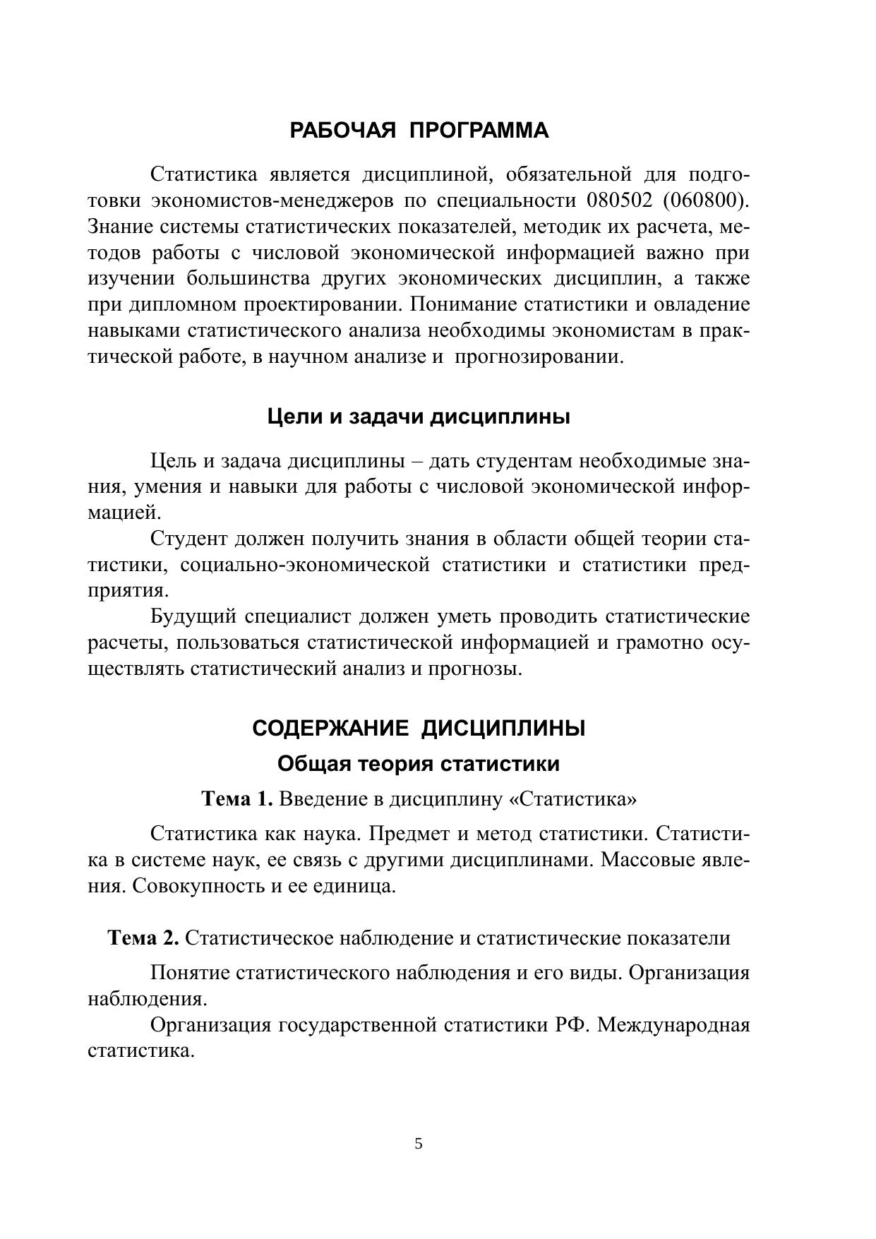 Рабочая программа, методические указания и контрольные вопросы дисциплины «Статистика» разработаны в соответствии с требованиями ГОС № 238 эк/сп от 17.03.2000 для студентов, обучающихся по специальности 080502 (060800). Даны варианты задач к контрольным работам.