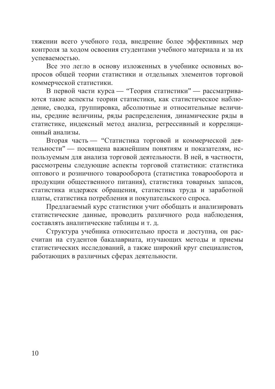 В учебнике рассмотрены вопросы теории статистики и коммерческой статистики, вопросы статистической методологии привязаны к торгово-коммерческой деятельности различного рода предприятий, компаний, фирм и т.д. Подробно изложены следующие аспекты статистики: методы группировок, абсолютные и относительные величины, средние величины, ряды распределения, ряды динамики, выборочный метод наблюдения, индексы, измерение связи, статистика розничного товарооборота, покупательского спроса, общественного питания, товарных запасов, труда и заработной платы, издержек обращения. В конце каждой главы даны вопросы для самоконтроля. Для студентов бакалавриата, обучающихся по направлениям подготовки "Торговое дело", "Экономика", "Менеджмент", менеджеров, экономистов, преподавателей экономических вузов, слушателей курсов повышения квалификации и бизнес-школ.