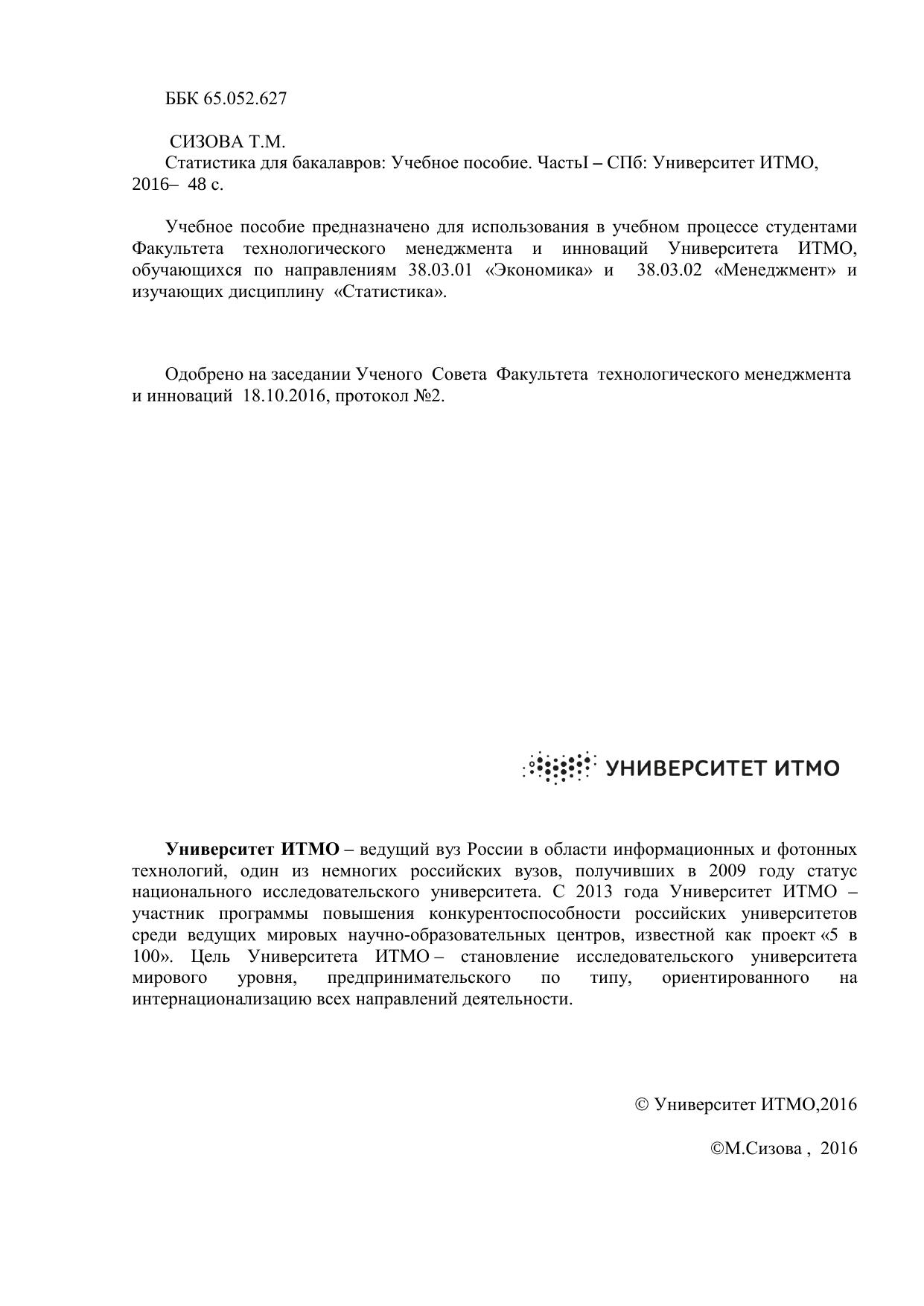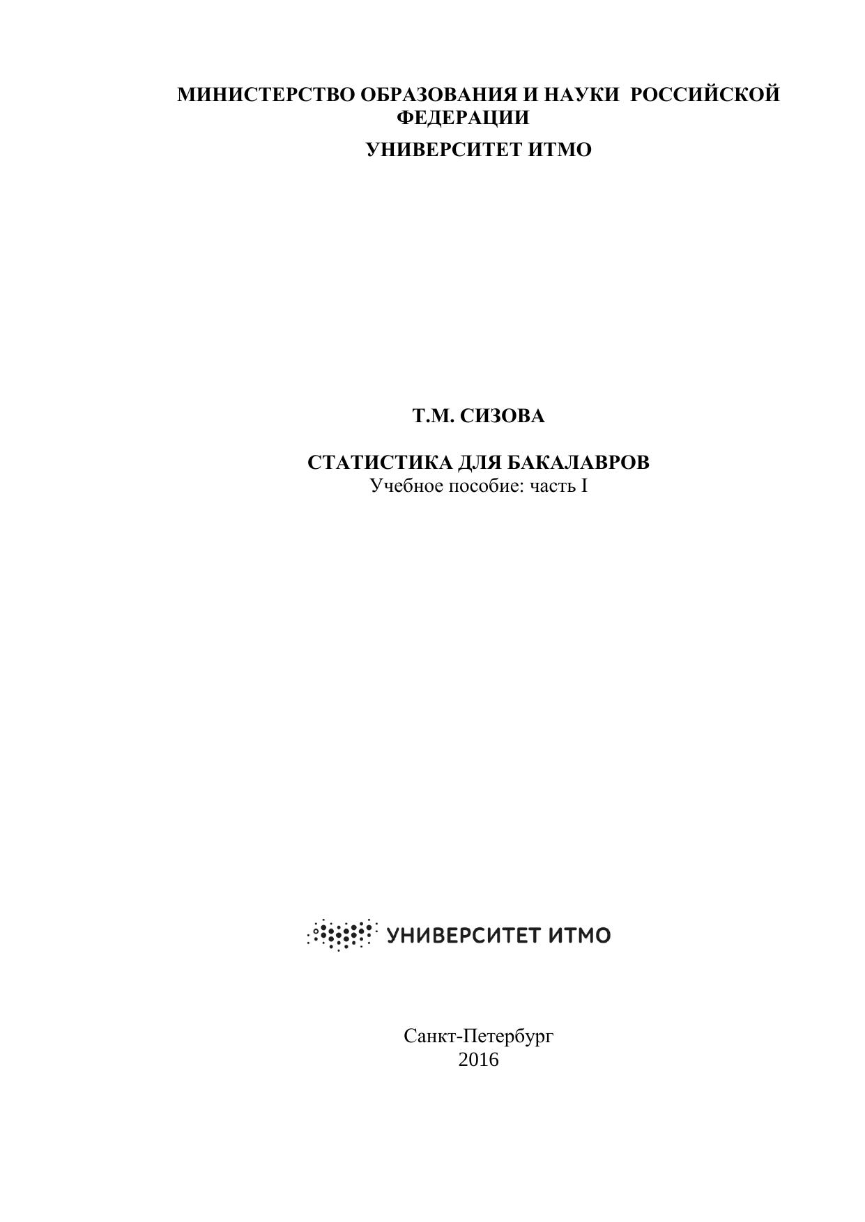 Учебное пособие предназначено для использования в учебном процессе студентами Факультета технологического менеджмента и инноваций Университета ИТМО, обучающихся по направлениям 38.03.01 «Экономика» и 38.03.02 «Менеджмент» и изучающих дисциплину «Статистика».