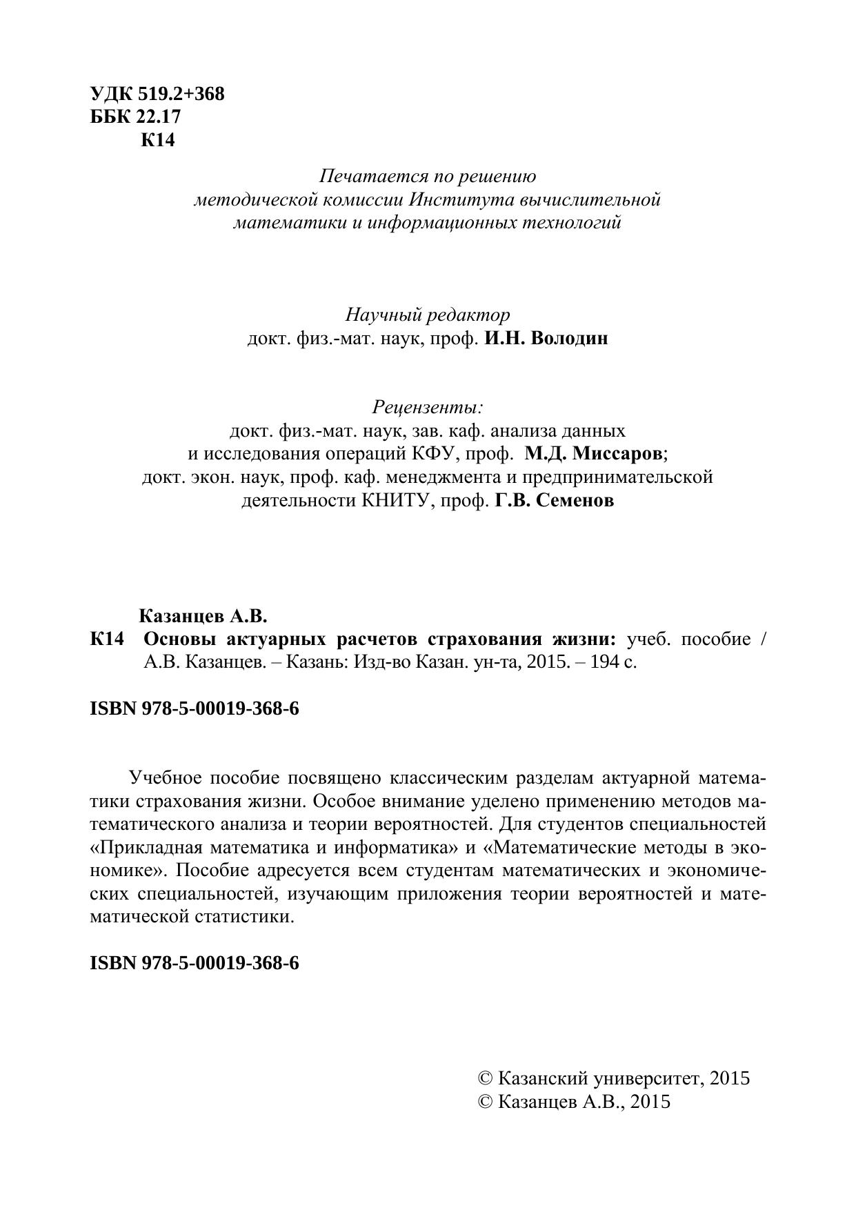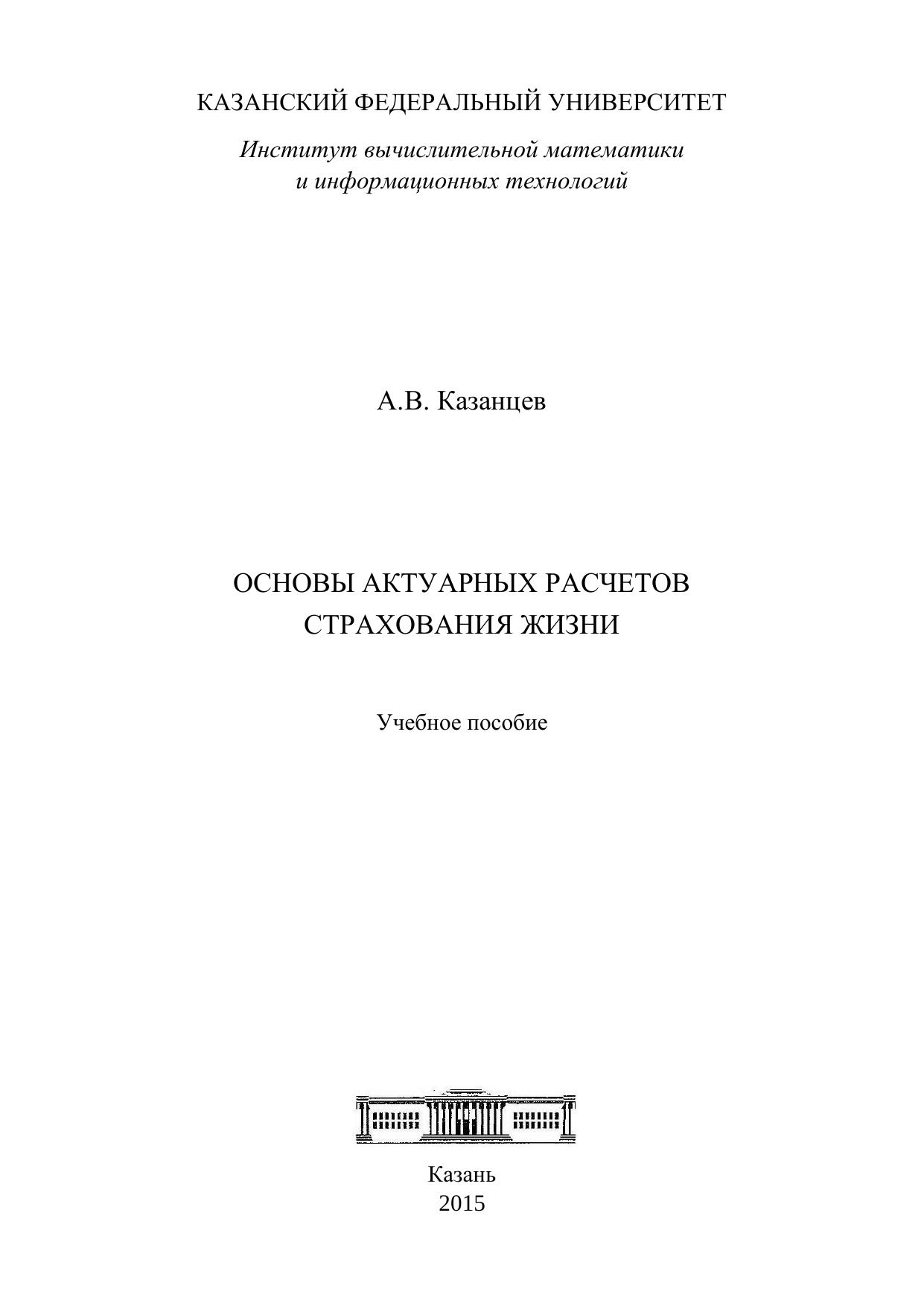 Учебное пособие посвящено классическим разделам актуарной математики страхования жизни. Особое внимание уделено применению методов математического анализа и теории вероятностей. Для студентов специальностей «Прикладная математика и информатика» и «Математические методы в экономике». Пособие адресуется всем студентам математических и экономических специальностей, изучающим приложения теории вероятностей и математической статистики.