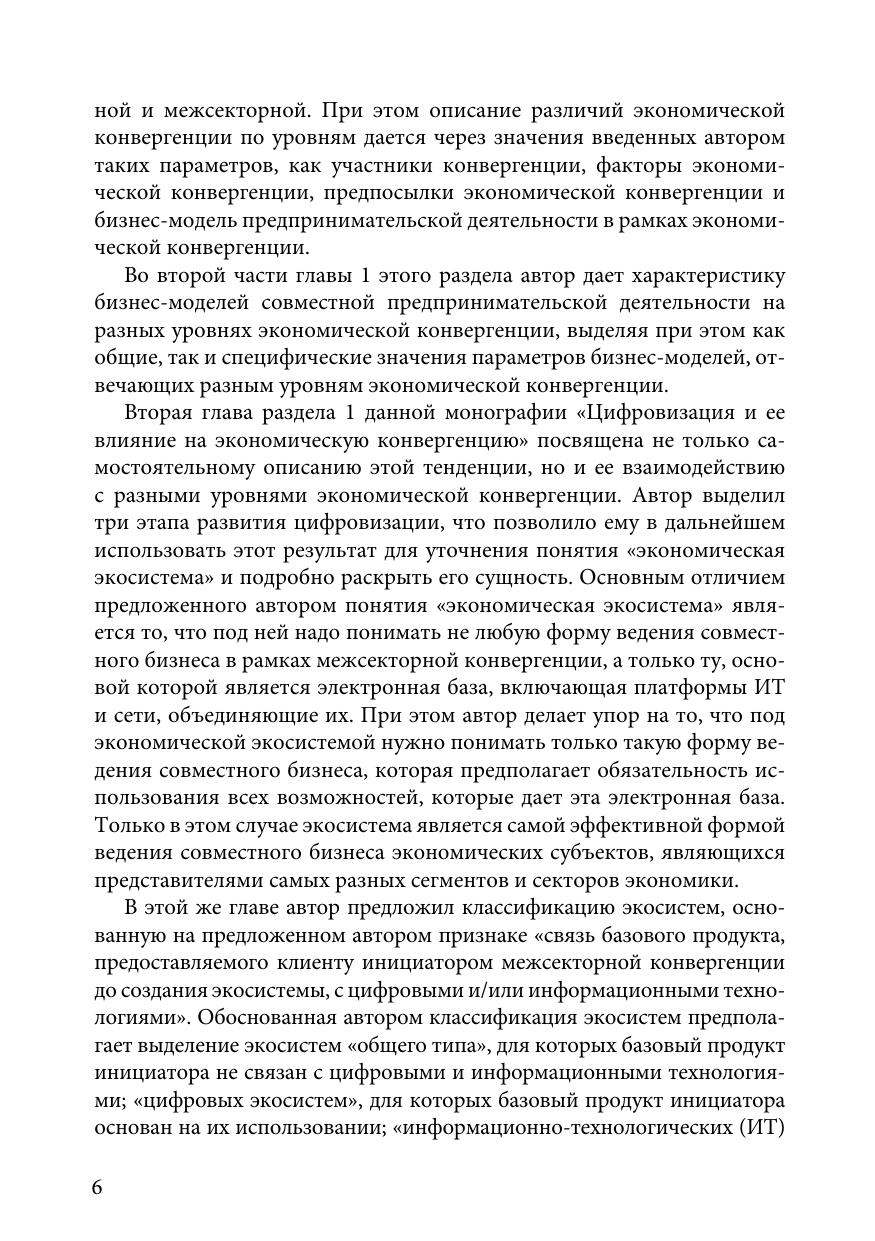 В работе рассмотрены вопросы экономической конвергенции, цифровизации и их взаимодействия; уточнено понятие экономической конвергенции; разработана классификация экосистем; определены направления воздействия цифровизации на все уровни российского страхования; проведен анализ применения InsurTech на российском страховом рынке; раскрыты особенности, проблемы и перспективы создания в России страховых экосистем.