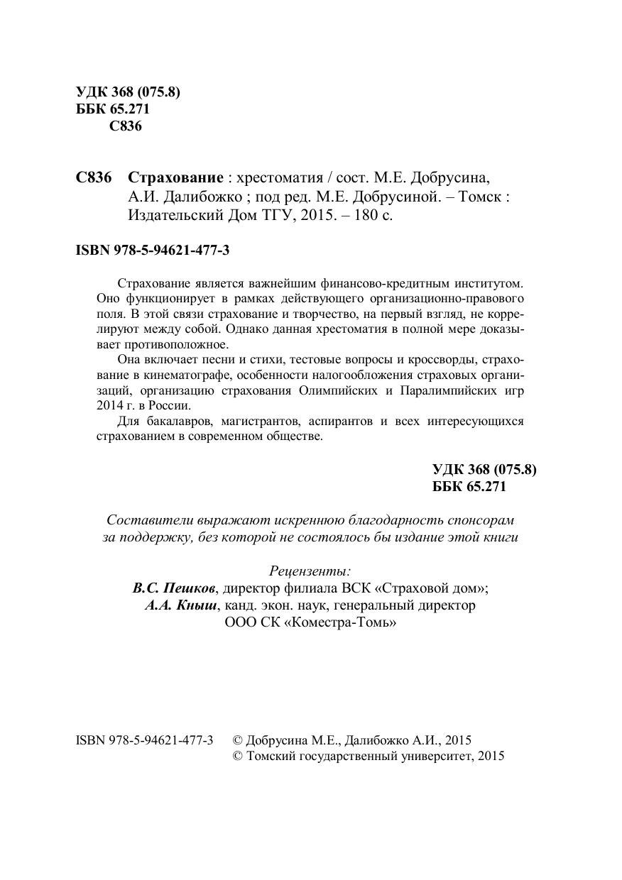 Страхование является важнейшим финансово-кредитным институтом. Оно функционирует в рамках действующего организационно-правового поля. В этой связи страхование и творчество, на первый взгляд, не коррелируют между собой. Однако данная хрестоматия в полной мере доказывает противоположное. Она включает песни и стихи, тестовые вопросы и кроссворды, страхование в кинематографе, особенности налогообложения страховых организаций, организацию страхования Олимпийских и Паралимпийских игр 2014 г. в России. Для бакалавров, магистрантов, аспирантов и всех интересующихся страхованием в современном обществе.