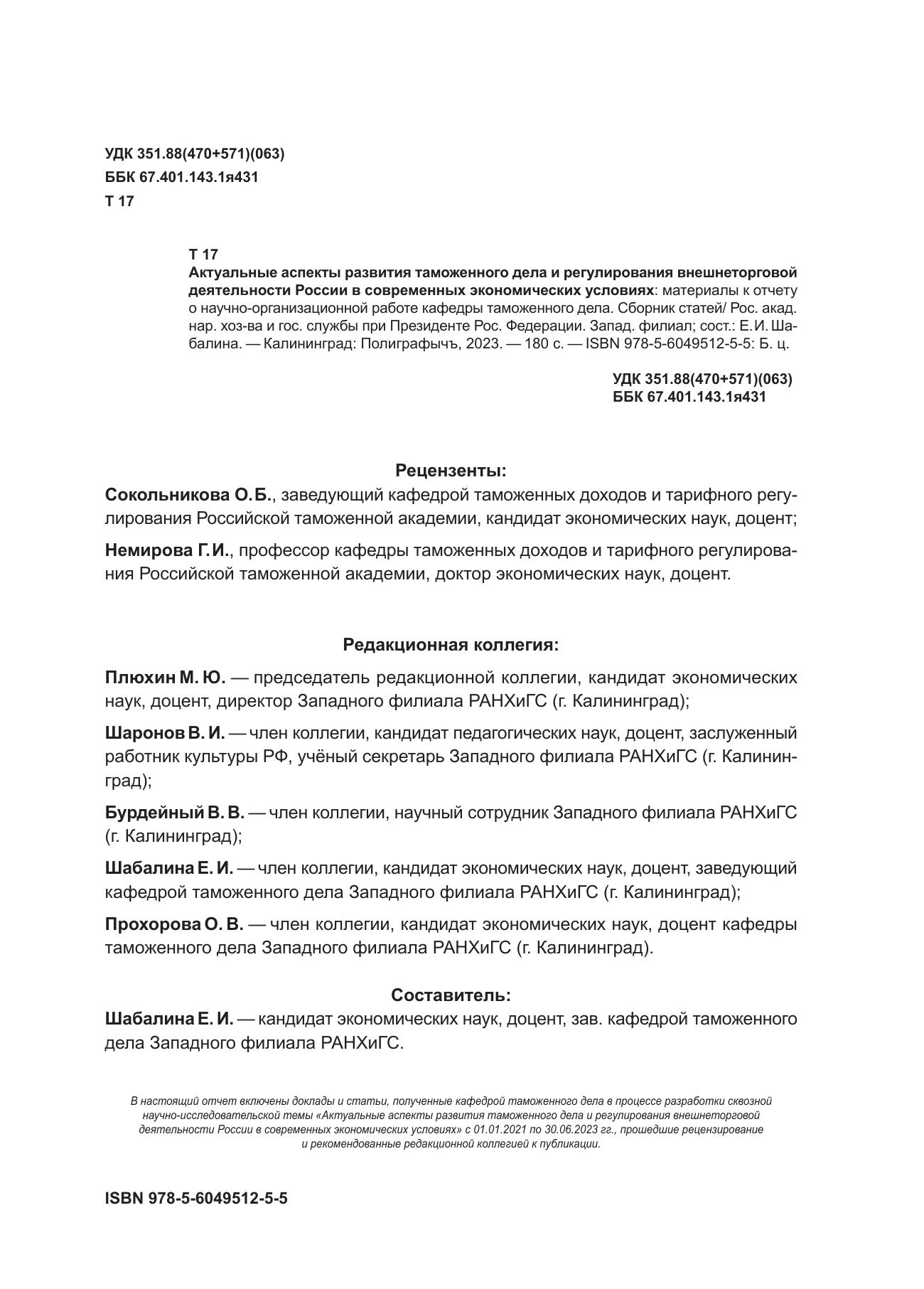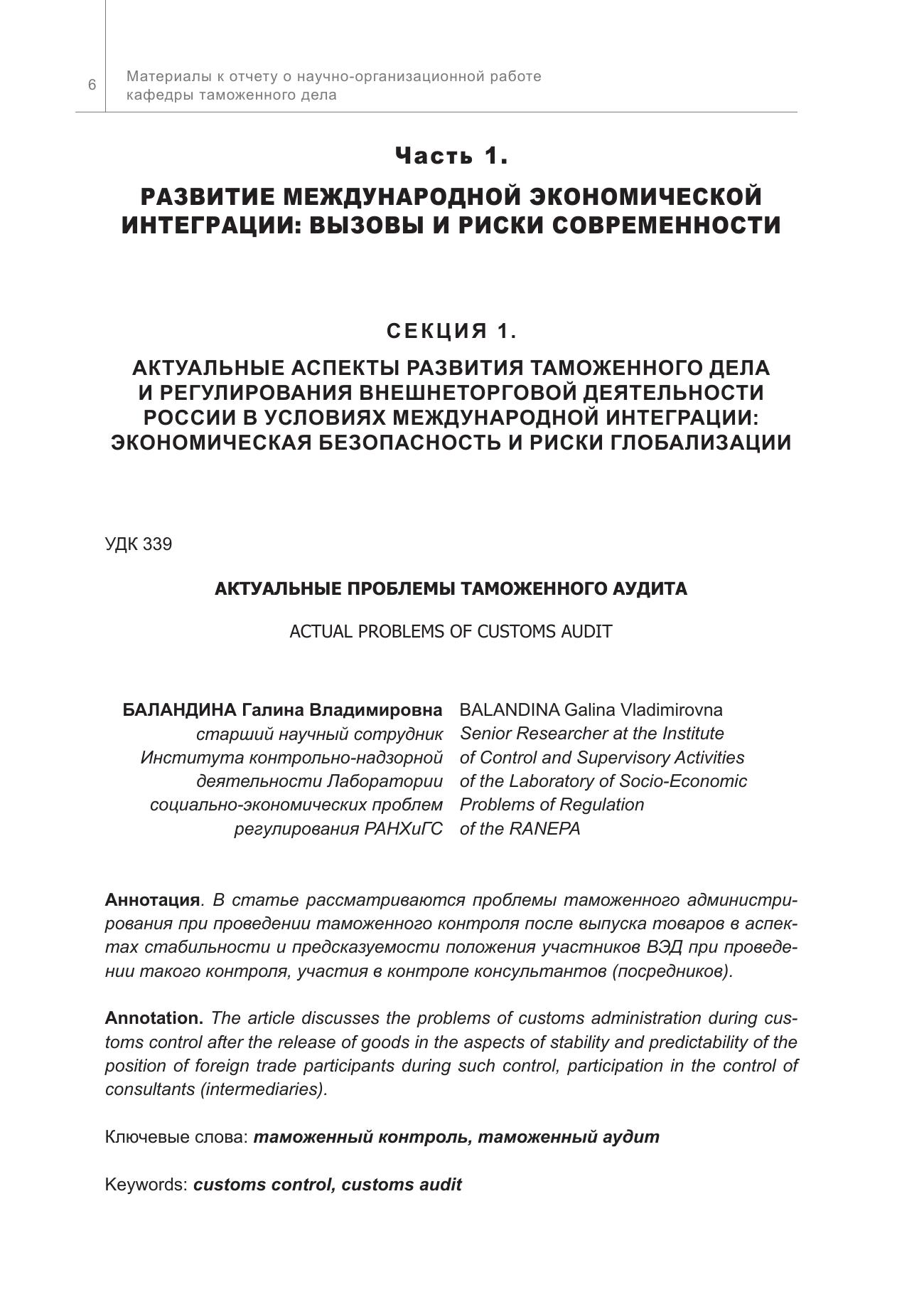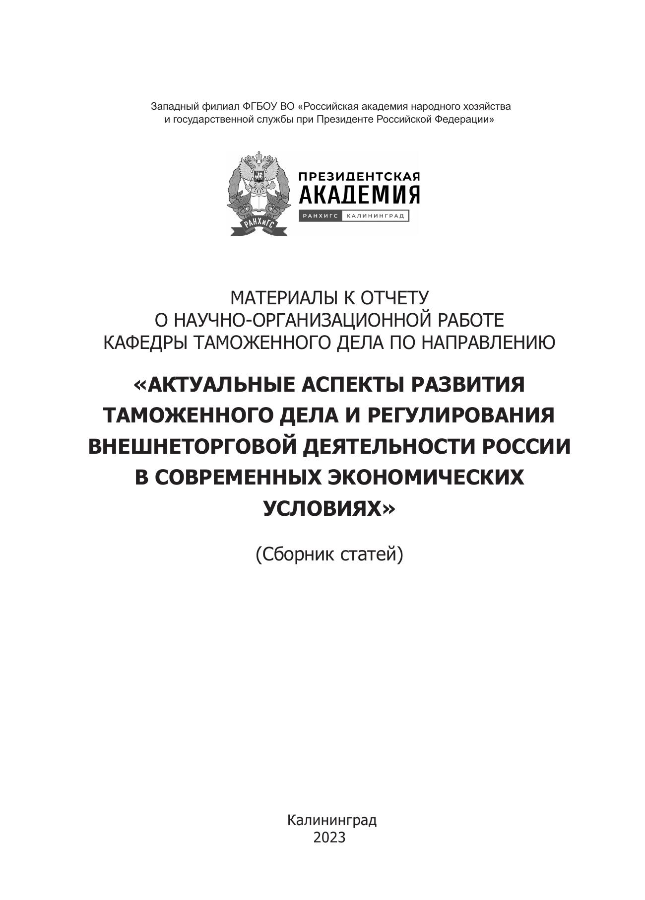 Актуальные аспекты развития таможенного дела и регулирования внешнеторговой деятельности России в современных экономических условиях: материалы к отчету о научно-организационной работе кафедры таможенного дела. Сборник статей