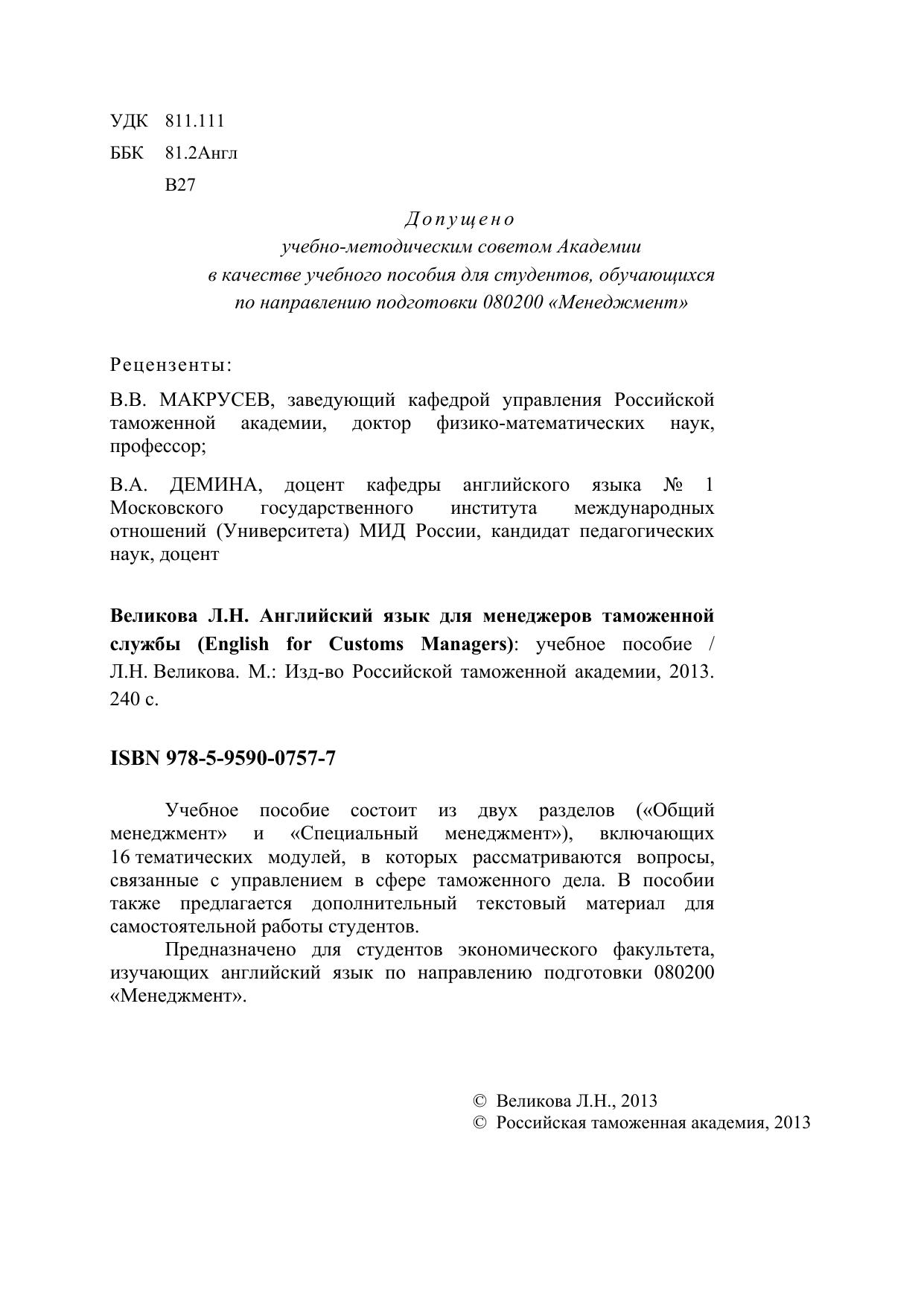 Учебное пособие состоит из двух разделов («Общий менеджмент» и «Специальный менеджмент»), включающих 16 тематических модулей, в которых рассматриваются вопросы, связанные с управлением в сфере таможенного дела. В пособии