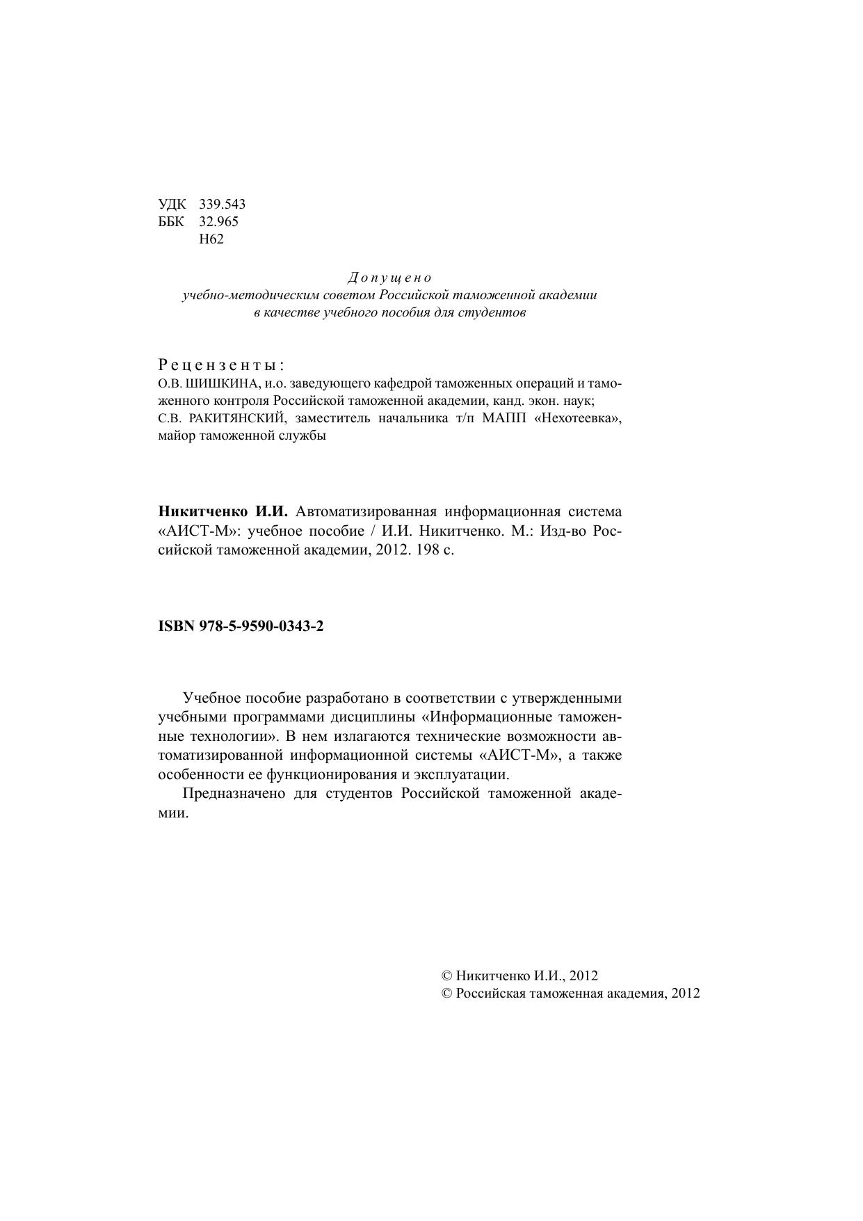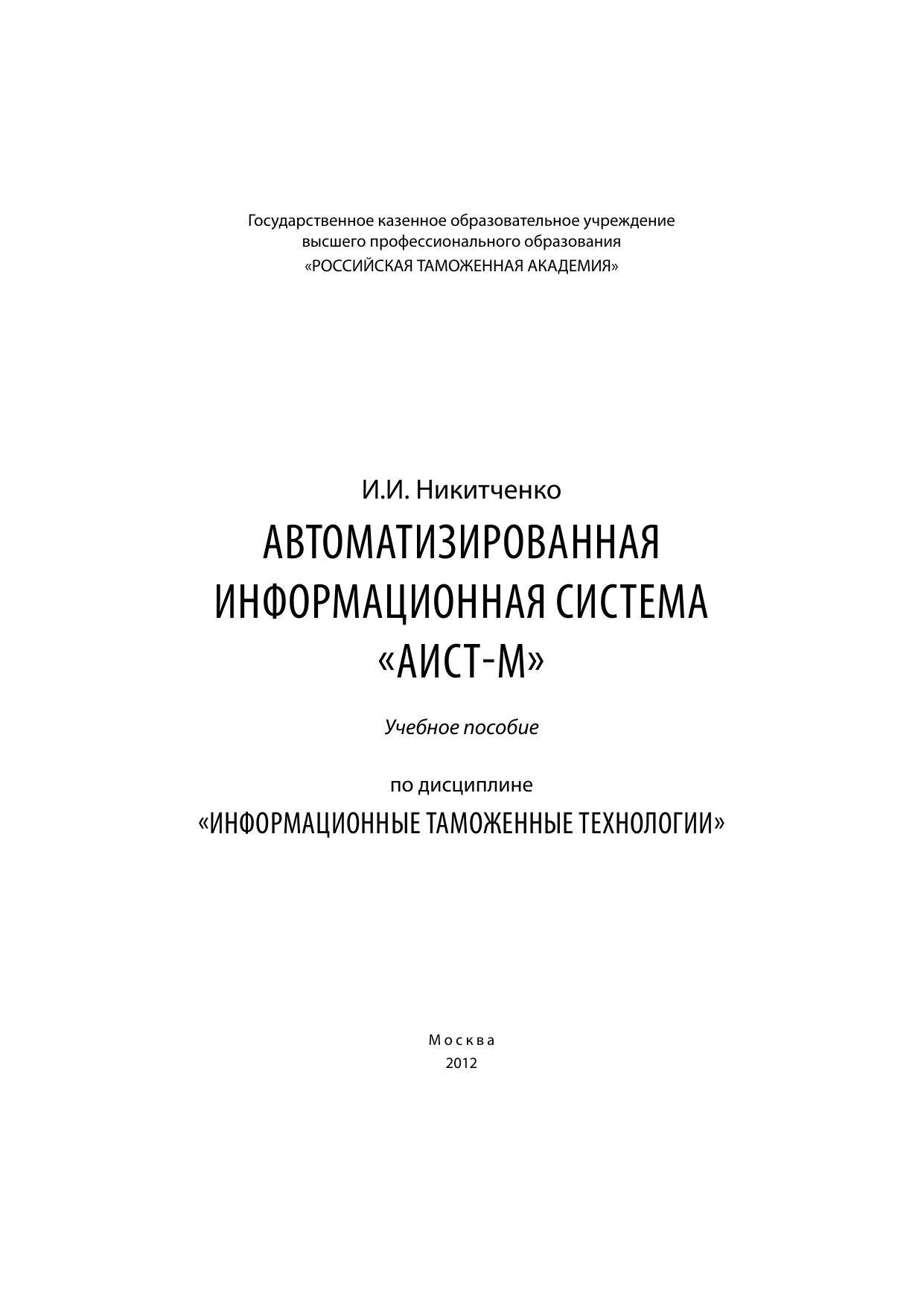 Учебное пособие разработано в соответствии с утвержденными учебными программами дисциплины «Информационные таможенные технологии». В нем излагаются технические возможности автоматизированной информационной системы «АИСТ-М», а также особенности ее функционирования и эксплуатации. Предназначено для студентов Российской таможенной академии.