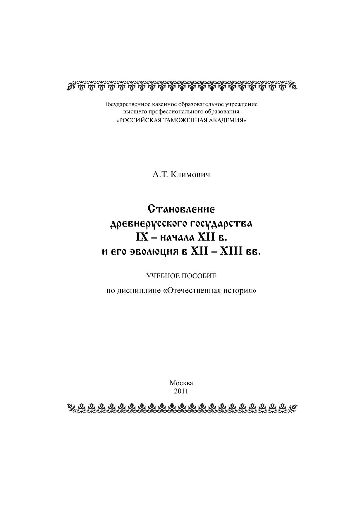 Cтановление древнерусского государства IX – начала XII в. и его эволюция в XII – XIII вв.: учебное пособие