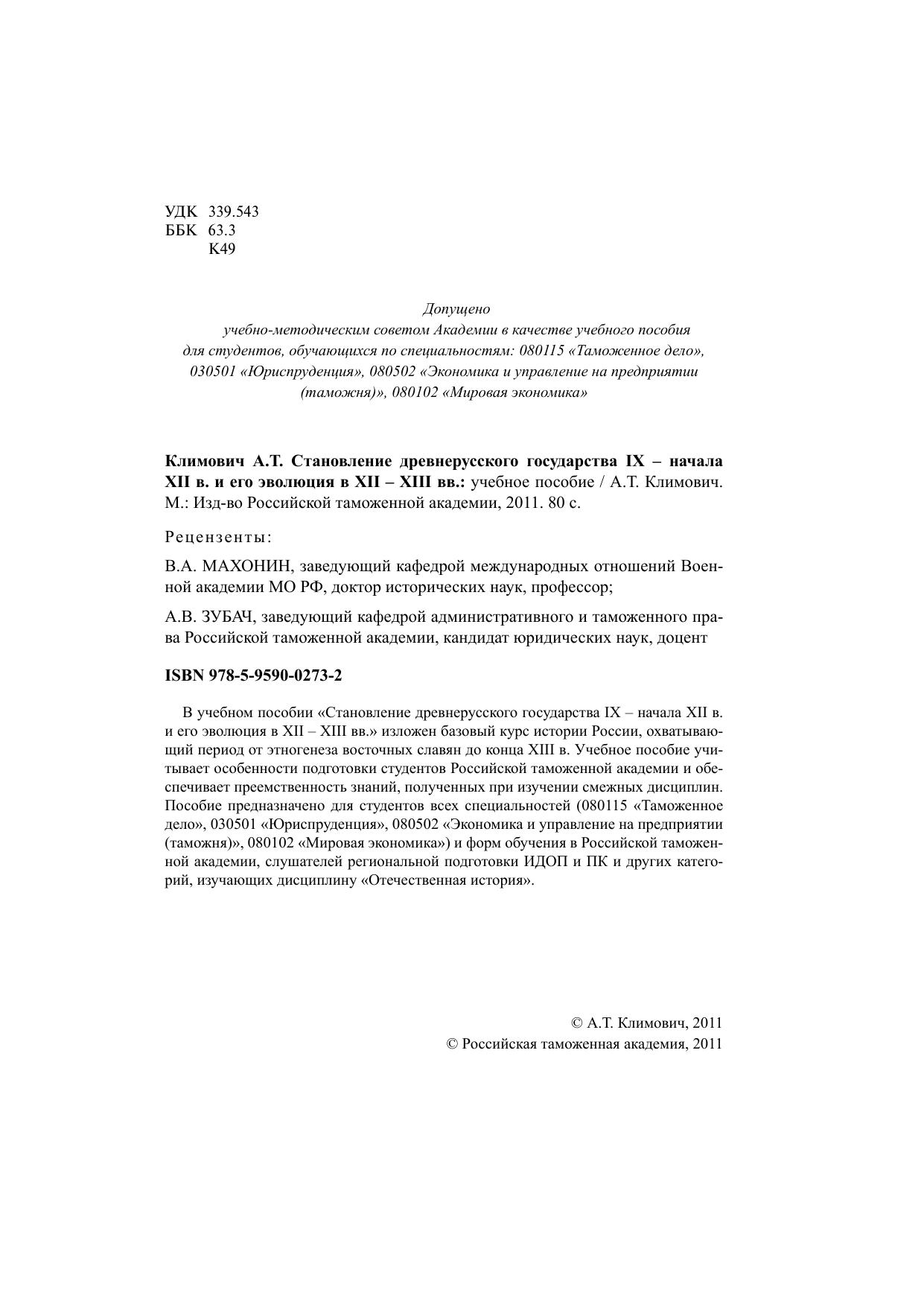 В учебном пособии «Cтановление древнерусского государства IX – начала XII в. и его эволюция в XII – XIII вв.» изложен базовый курс истории России, охватывающий период от этногенеза восточных славян до конца XIII в. Учебное пособие учитывает особенности подготовки студентов Российской таможенной академии и обеспечивает преемственность знаний, полученных при изучении смежных дисциплин. Пособие предназначено для студентов всех специальностей (080115 «Таможенное дело», 030501 «Юриспруденция», 080502 «Экономика и управление на предприятии (таможня)», 080102 «Мировая экономика») и форм обучения в Российской таможенной академии, слушателей региональной подготовки ИДОП и ПК и других категорий, изучающих дисциплину «Отечественная история»