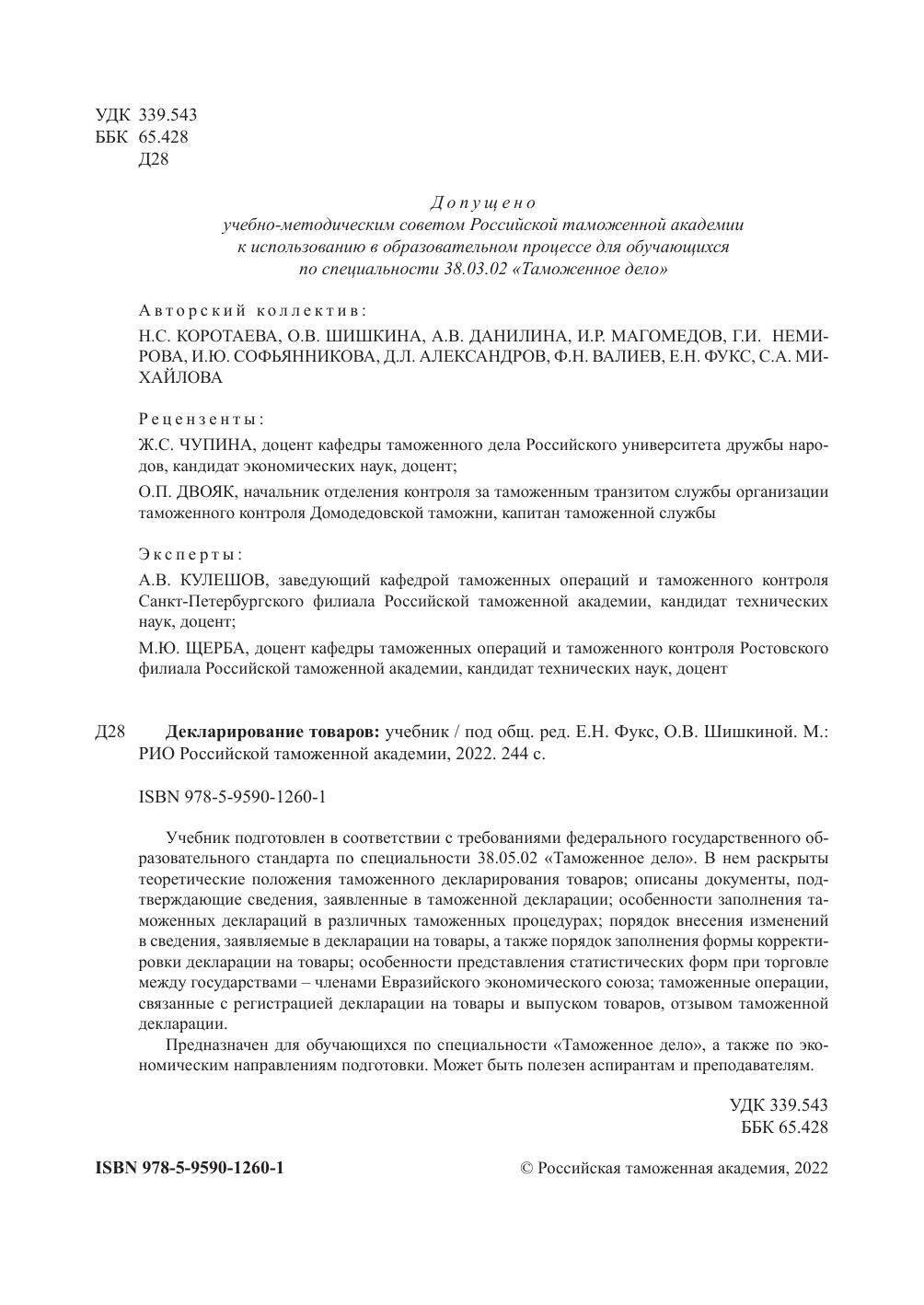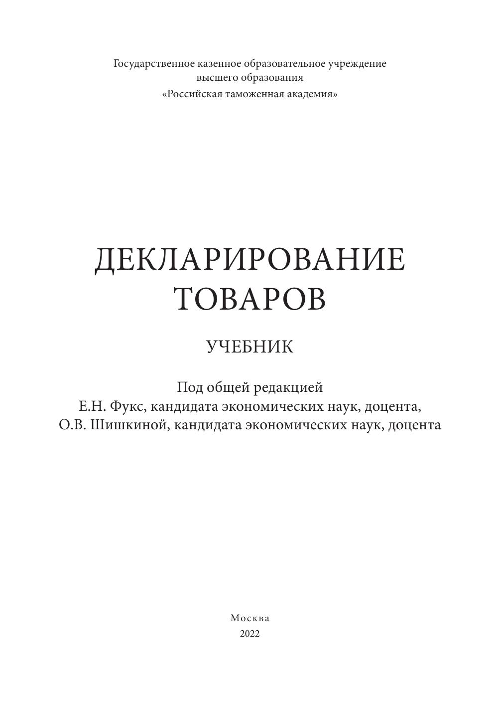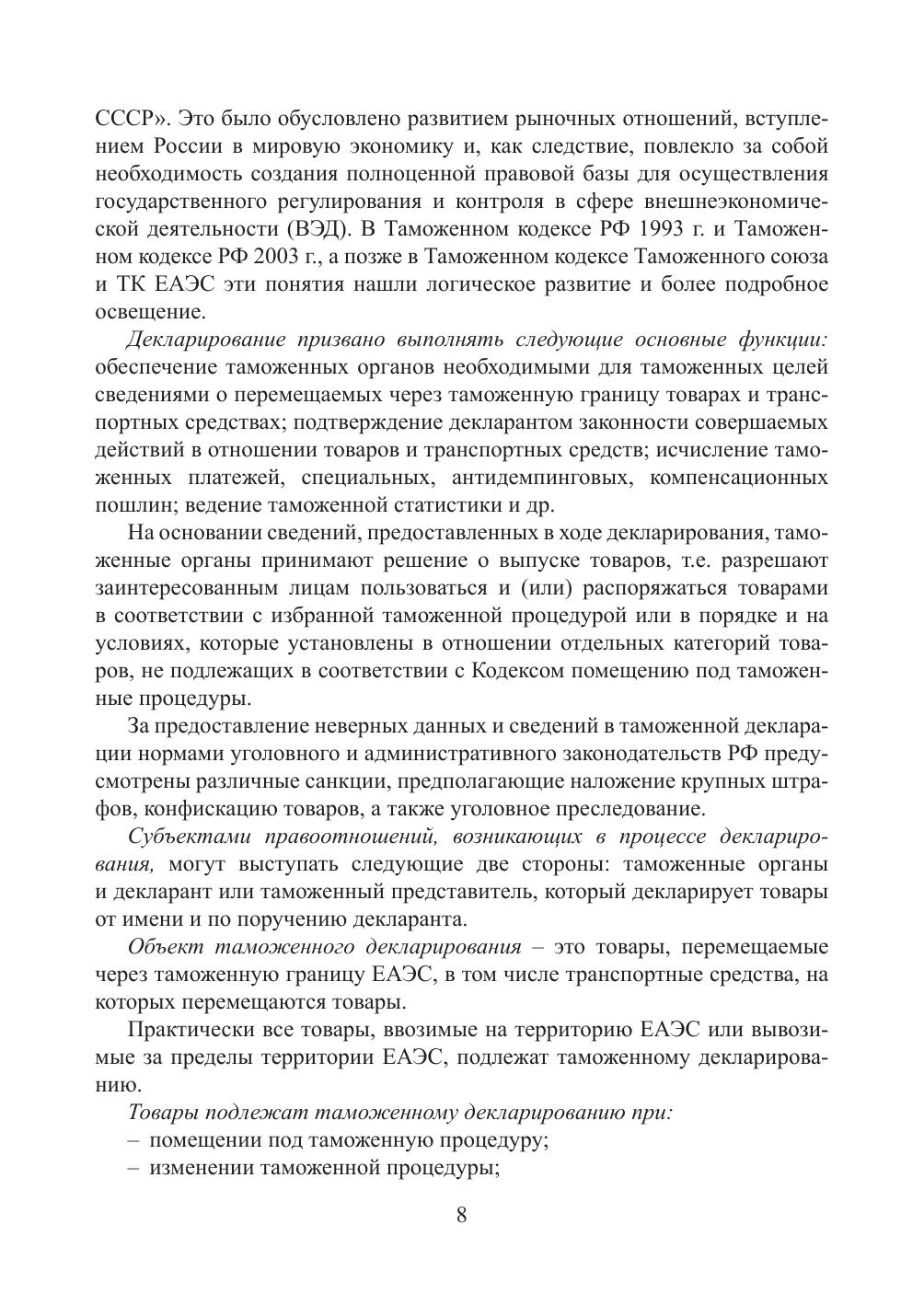 Учебник подготовлен в соответствии с требованиями федерального государственного образовательного стандарта по специальности 38.05.02 «Таможенное дело». В нем раскрыты теоретические положения таможенного декларирования товаров; описаны документы, подтверждающие сведения, заявленные в таможенной декларации; особенности заполнения таможенных деклараций в различных таможенных процедурах; порядок внесения изменений в сведения, заявляемые в декларации на товары, а также порядок заполнения формы корректировки декларации на товары; особенности представления статистических форм при торговле между государствами – членами Е вразийского экономического союза; таможенные операции, связанные с регистрацией декларации на товары и выпуском товаров, отзывом таможенной декларации.