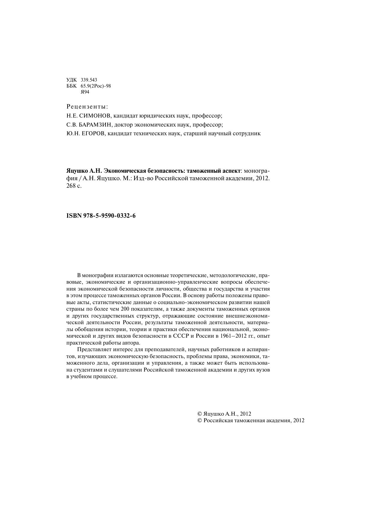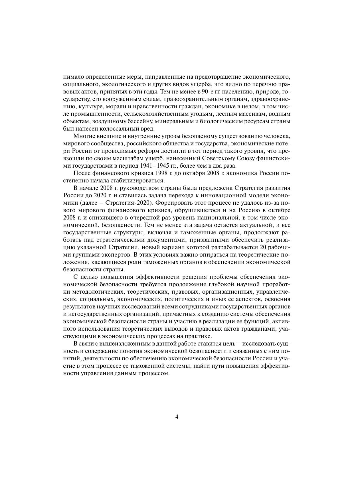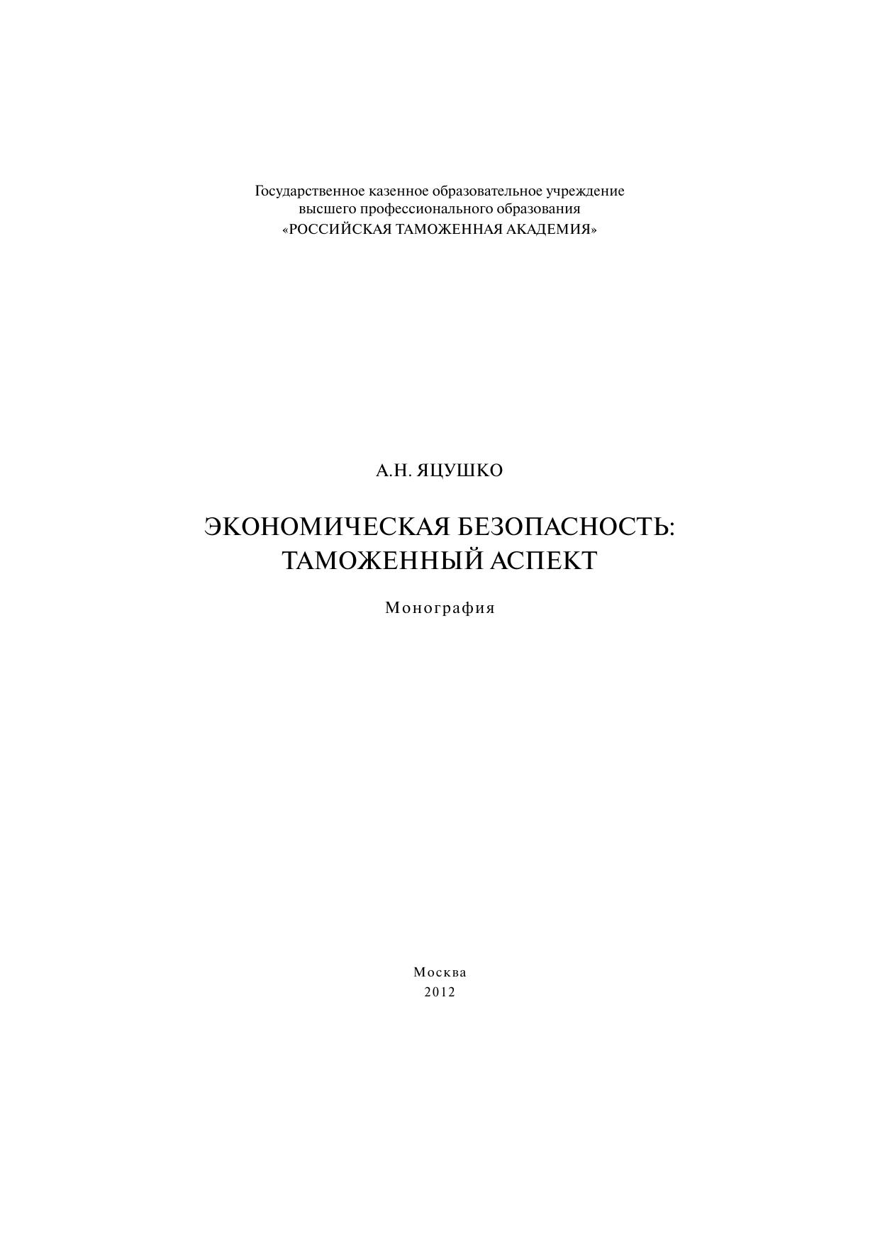В монографии излагаются основные теоретические, методологические, правовые, экономические и организационно-управленческие вопросы обеспечения экономической безопасности личности, общества и государства и участия в этом процессе таможенных органов России. в основу работы положены правовые акты, статистические данные о социально-экономическом развитии нашей страны по более чем 200 показателям, а также документы таможенных органов и других государственных структур, отражающие состояние внешнеэкономической деятельности России, результаты таможенной деятельности, материалы обобщения истории, теории и практики обеспечения национальной, экономической и других видов безопасности в СССР и России в 1961–2012 гг., опыт практической работы автора. Представляет интерес для преподавателей, научных работников и аспирантов, изучающих экономическую безопасность, проблемы права, экономики, таможенного дела, организации и управления, а также может быть использована студентами и слушателями Российской таможенной академии и других вузов в учебном процессе.