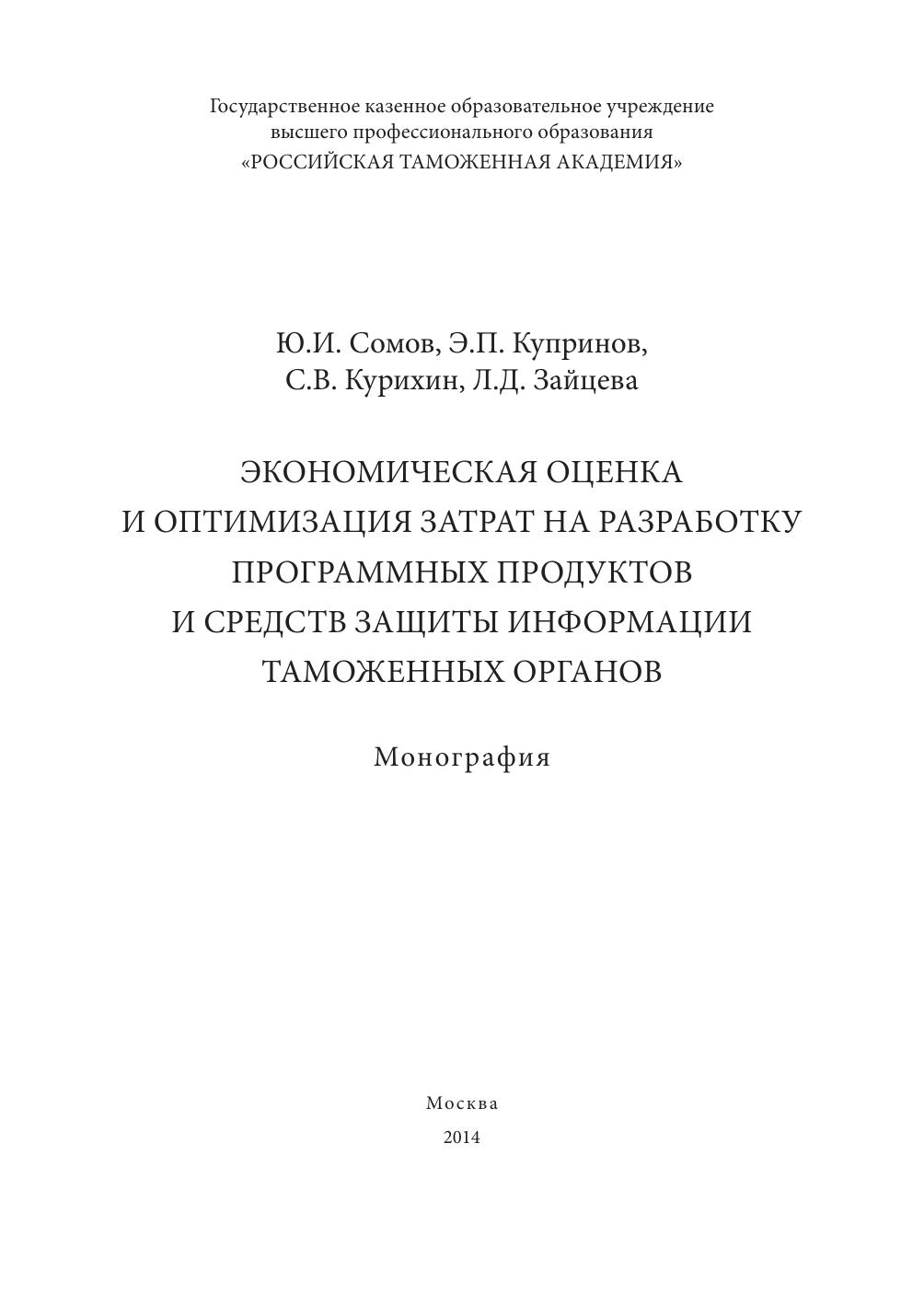 Экономическая оценка и оптимизация затрат на разработку программных продуктов и средств защиты информации таможенных органов: монография