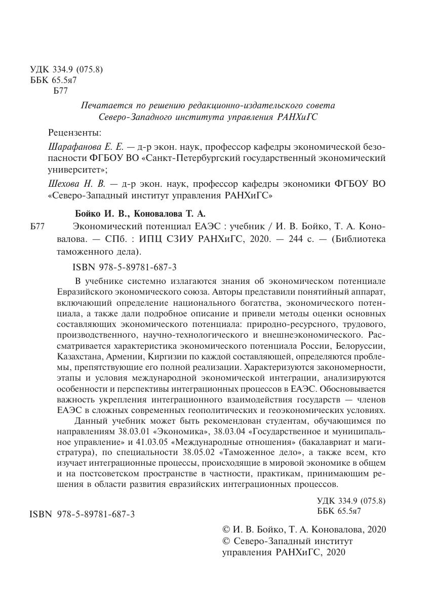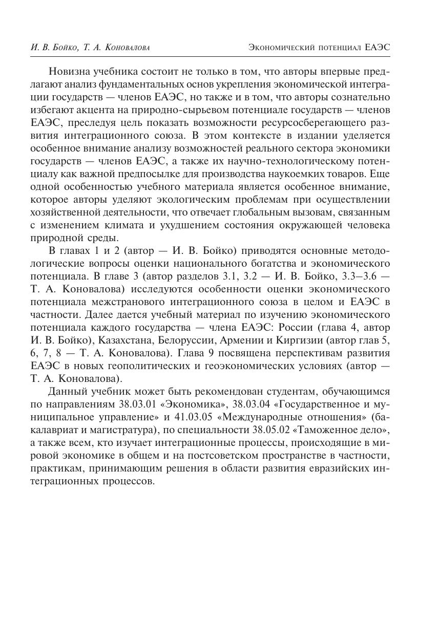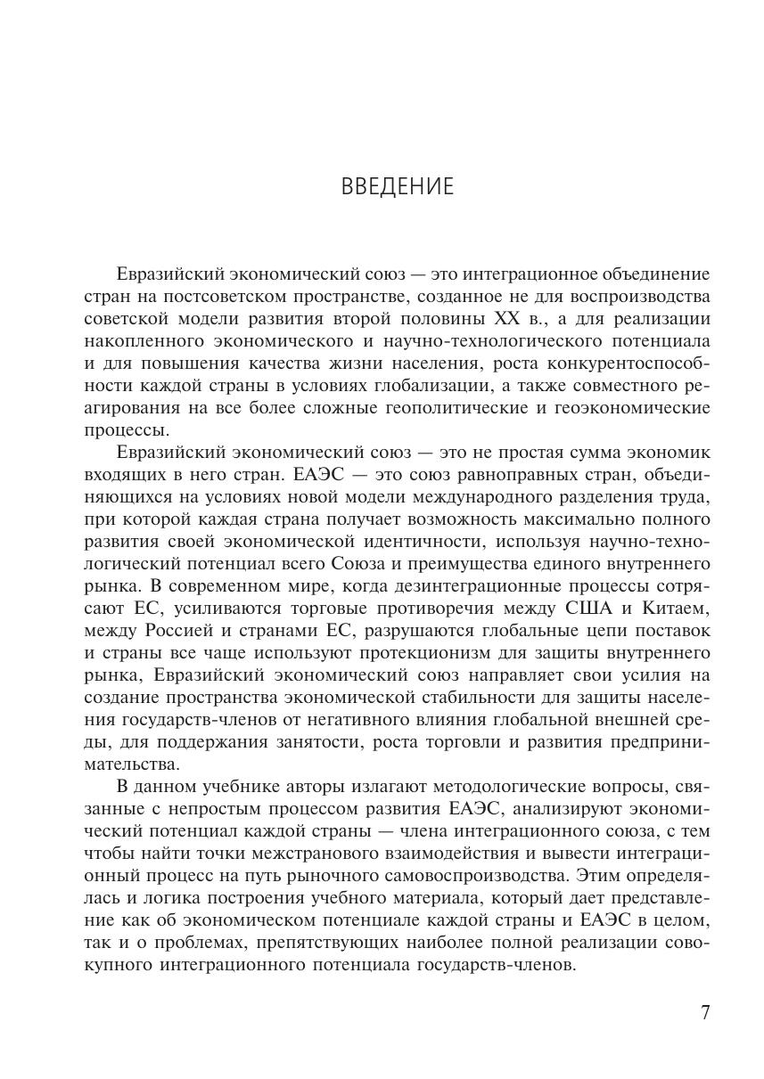 В учебнике системно излагаются знания об экономическом потенциале Евразийского экономического союза. Авторы представили понятийный аппарат, включающий определение национального богатства, экономического потенциала, а также дали подробное описание и привели методы оценки основных составляющих экономического потенциала: природно-ресурсного, трудового, производственного, научно-технологического и внешнеэкономического. Рассматривается характеристика экономического потенциала России, Белоруссии, Казахстана, Армении, Киргизии по каждой составляющей, определяются проблемы, препятствующие его полной реализации. Характеризуются закономерности, этапы и условия международной экономической интеграции, анализируются особенности и перспективы интеграционных процессов в ЕАЭС. Обосновывается важность укрепления интеграционного взаимодействия государств — членов ЕАЭС в сложных современных геополитических и геоэкономических условиях. Данный учебник может быть рекомендован студентам, обучающимся по направлениям 38.03.01 «Экономика», 38.03.04 «Государственное и муниципальное управление» и 41.03.05 «Международные отношения» (бакалавриат и магистратура), по специальности 38.05.02 «Таможенное дело», а также всем, кто изучает интеграционные процессы, происходящие в мировой экономике в общем и на постсоветском пространстве в частности, практикам, принимающим решения в области развития евразийских интеграционных процессов.