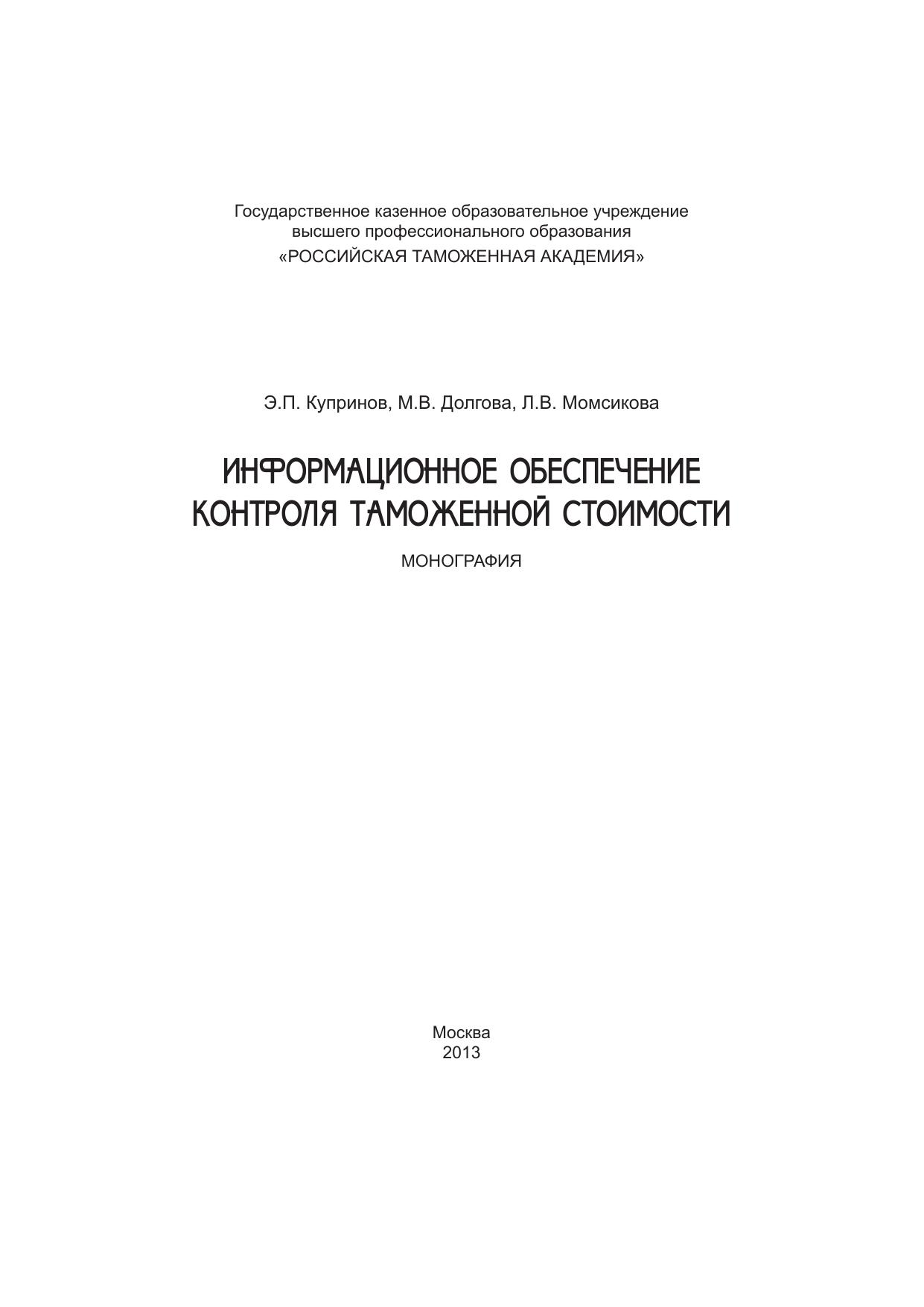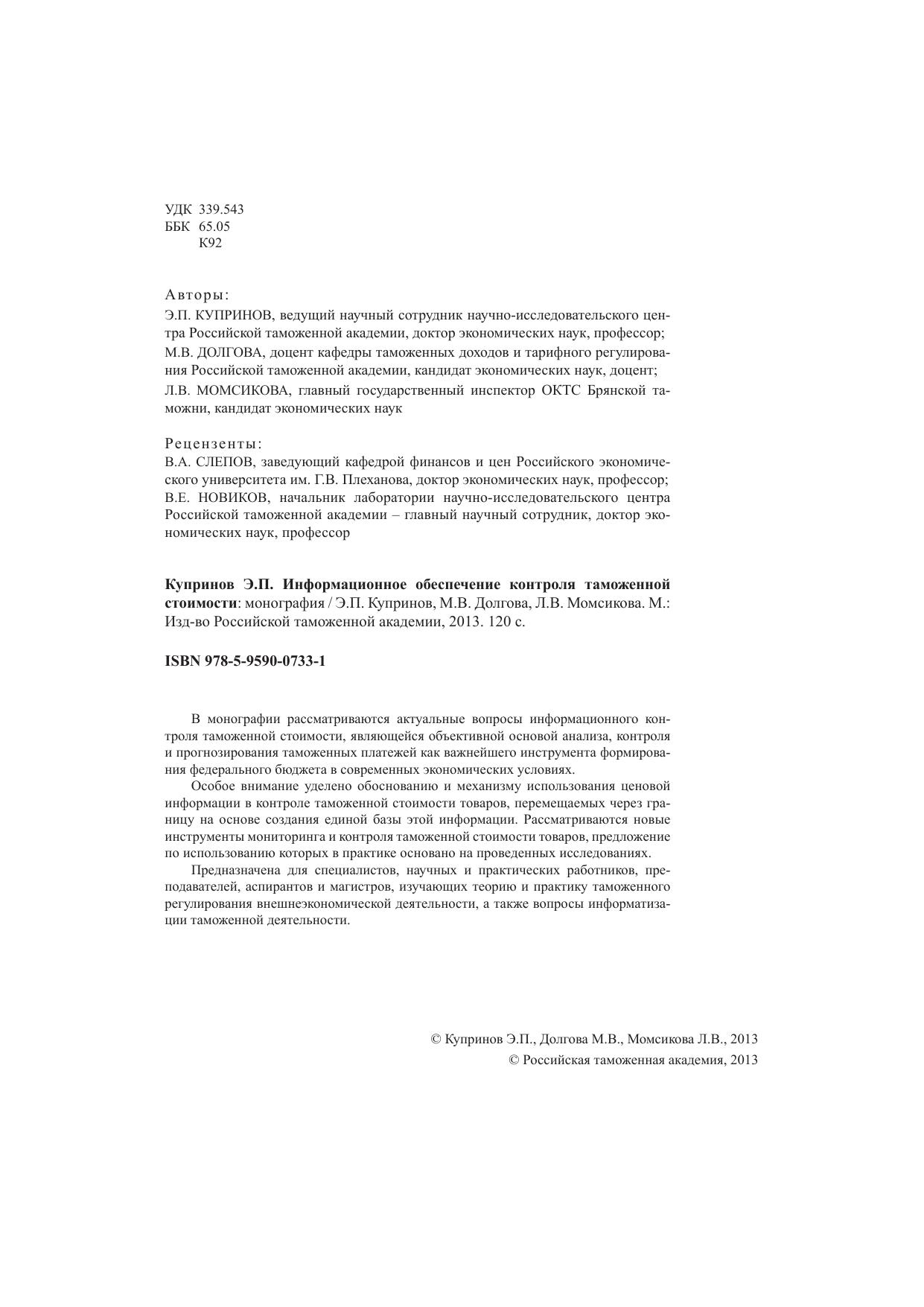 В монографии рассматриваются актуальные вопросы информационного контроля таможенной стоимости, являющейся объективной основой анализа, контроля и прогнозирования таможенных платежей как важнейшего инструмента формирования федерального бюджета в современных экономических условиях. Особое внимание уделено обоснованию и механизму использования ценовой информации в контроле таможенной стоимости товаров, перемещаемых через границу на основе создания единой базы этой информации. Рассматриваются новые инструменты мониторинга и контроля таможенной стоимости товаров, предложение по использованию которых в практике основано на проведенных исследованиях. Предназначена для специалистов, научных и практических работников, преподавателей, аспирантов и магистров, изучающих теорию и практику таможенного регулирования внешнеэкономической деятельности, а также вопросы информатизации таможенной деятельности.