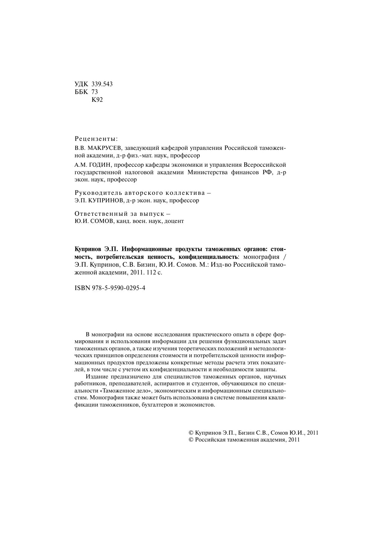 Информационные продукты таможенных органов: стоимость, потребительская ценность, конфиденциальность: монография