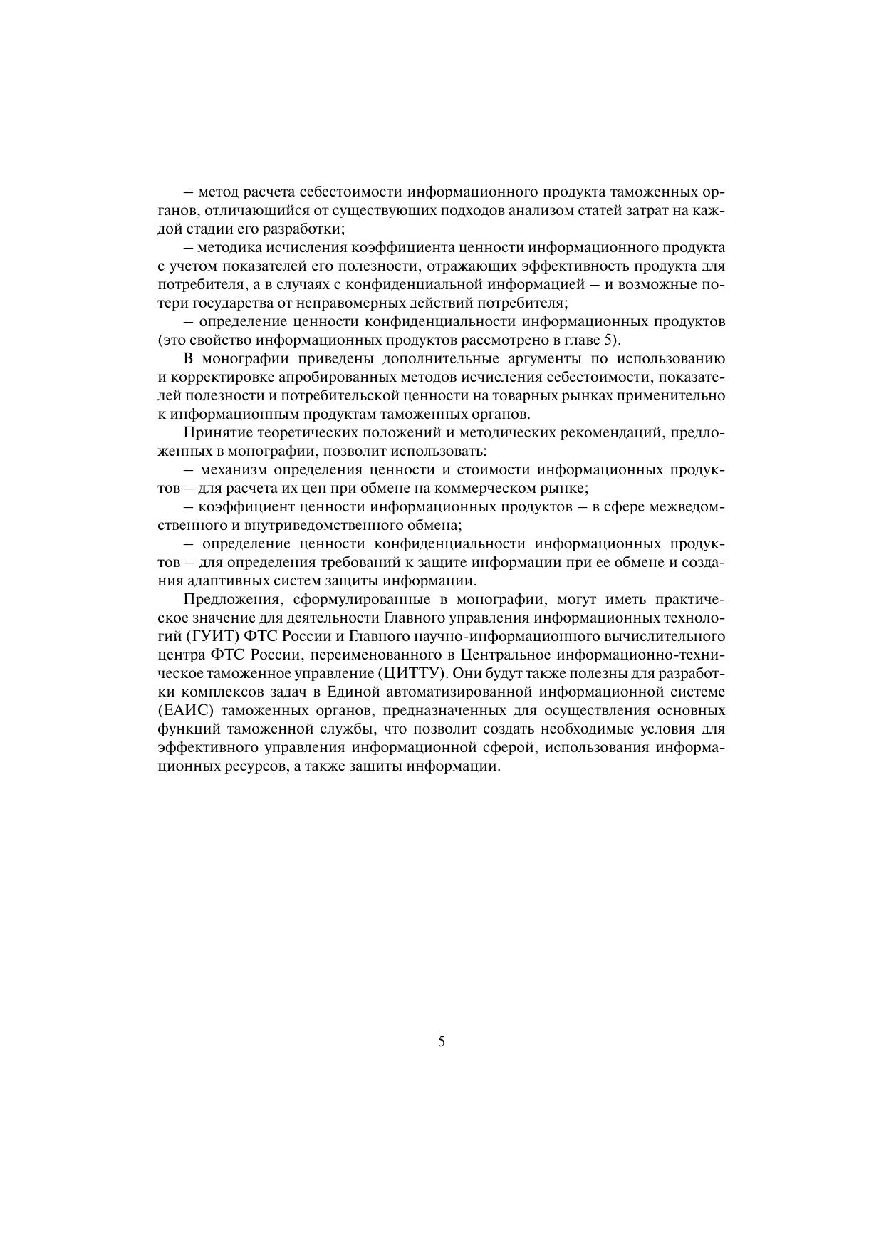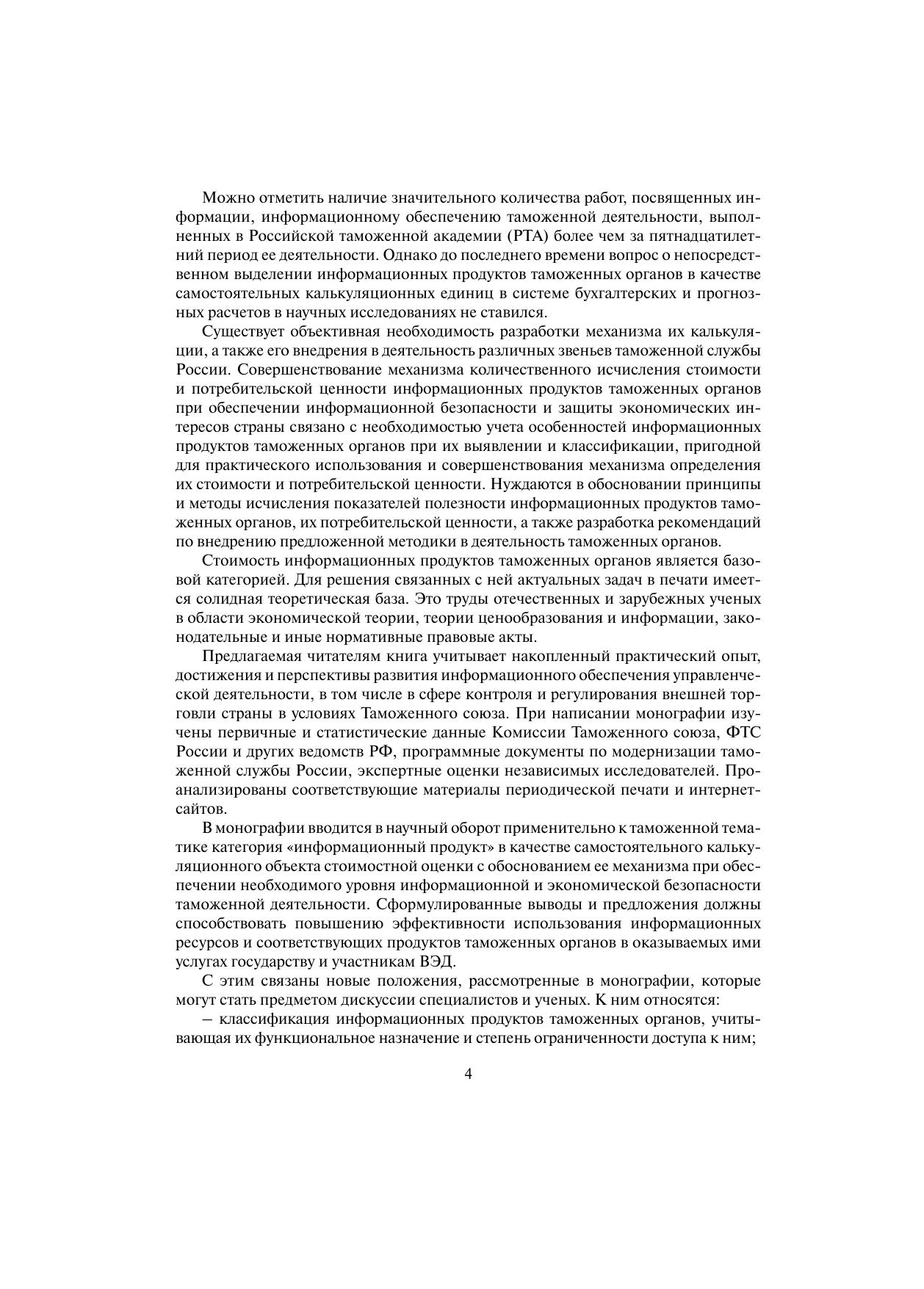 В монографии на основе исследования практического опыта в сфере формирования и использования информации для решения функциональных задач таможенных органов, а также изучения теоретических положений и методологических принципов определения стоимости и потребительской ценности информационных продуктов предложены конкретные методы расчета этих показателей, в том числе с учетом их конфиденциальности и необходимости защиты. Издание предназначено для специалистов таможенных органов, научных работников, преподавателей, аспирантов и студентов, обучающихся по специальности «Таможенное дело», экономическим и информационным специальностям. Монография также может быть использована в системе повышения квалификации таможенников, бухгалтеров и экономистов.